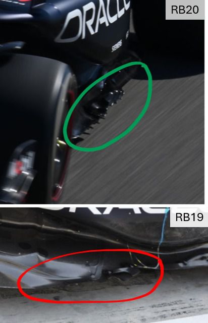 Por último, comparando el borde del suelo del RB20 con el de su hermano pequeño, el RB19, se puede ver que el de este año es una evolución del visto el año pasado. Si bien si que se aprecia un cambio, éste nuevo diseño se podría considerar como una ligera mejora al del año anterior. Desde luego, este RB20 promete.