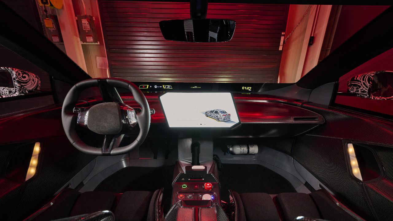 Por otro lado, la abundancia del material ligero de fibra de carbono expuesta y elementos de seguridad como el extintor de emergencia situado a los pies del pasajero aseguran la prueba de rendimiento hasta los límites físicos del vehículo.