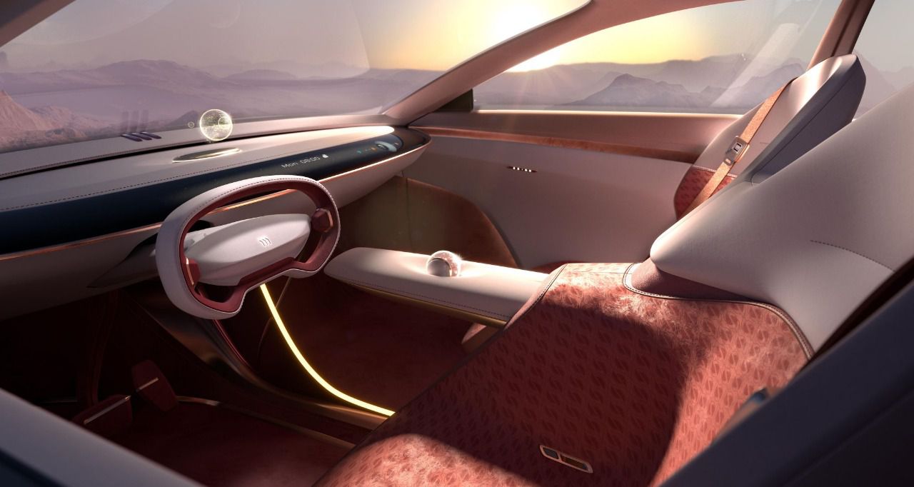 La narrativa material es tan explícita como el diseño. Por fuera, el tono neutro Space, un metalizado cambiante, refleja matices y refuerza el tema cósmico. Por dentro, el tema Ground contrasta ese universo con una paleta arcilla y textiles de brocado inspirados en la edad dorada de Buick. Sobre esa base, el Digital Illusion Carpet, una iluminación ambiental en el suelo, pulsa al ritmo de “cuerpos celestes”, mientras acentos de cristal y tejidos opulentos elevan el conjunto. Es un CMF editorial, con relato, y con potencial para trasladarse a series limitadas o paquetes de personalización.