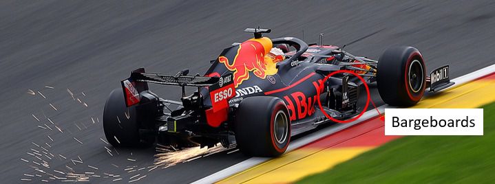 De manera similar, la zona de los bargeboards fue evolucionando desde formas «simples» a una disposición de distintos perfiles con los que poder aprovechar de una forma más óptima el flujo procedente del alerón delantero.