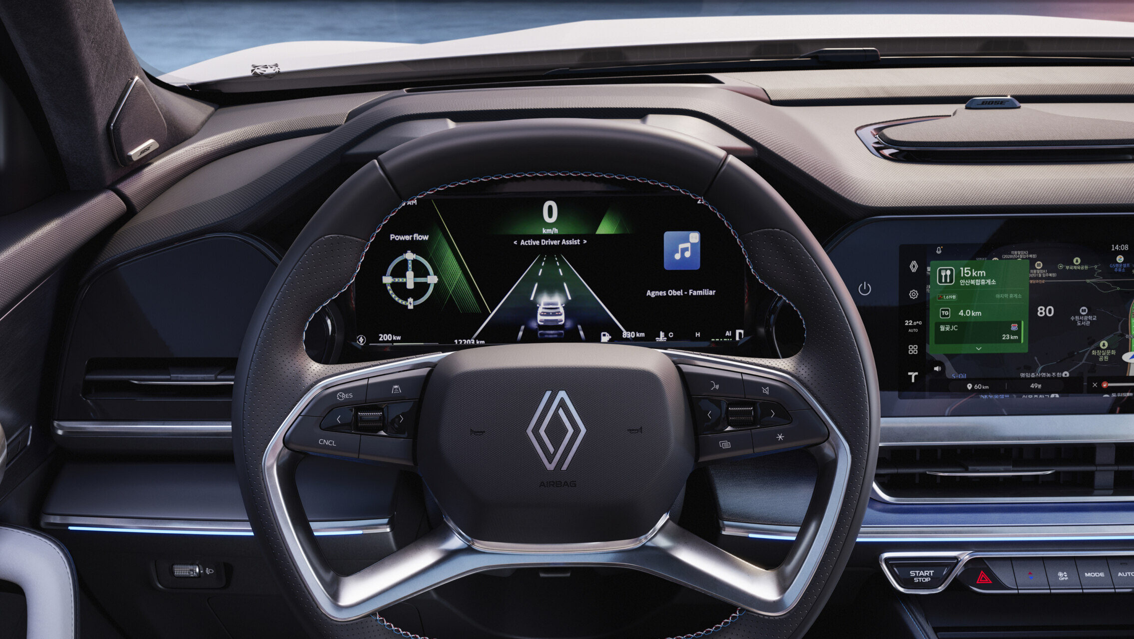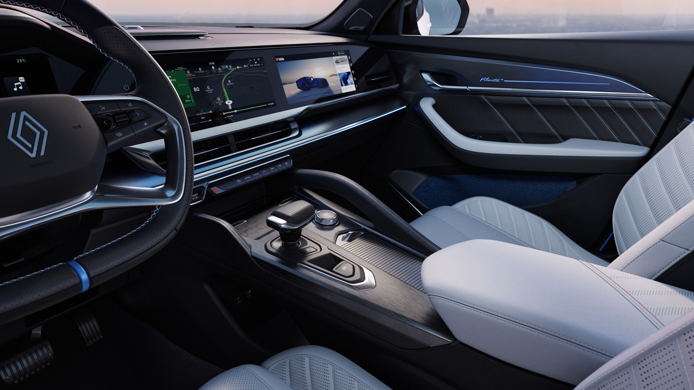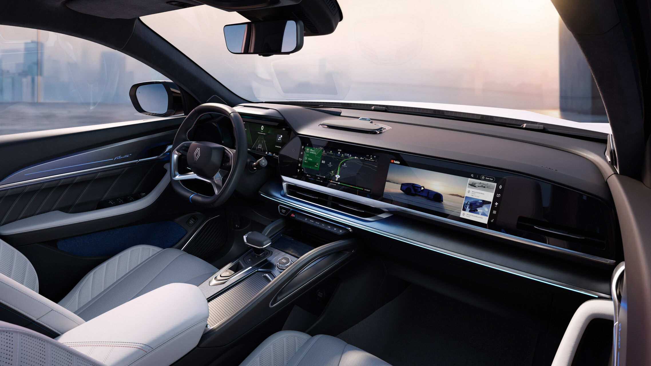 El Renault Filante presenta un interior moderno y elegante, con asientos de cuero y una pantalla digital de alta tecnología. Este diseño combina confort y funcionalidad, ideal para los amantes de la automoción. La iluminación suave y los detalles en el diseño crean un ambiente atractivo.