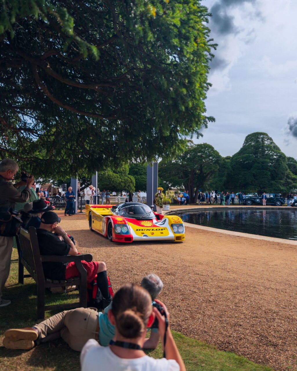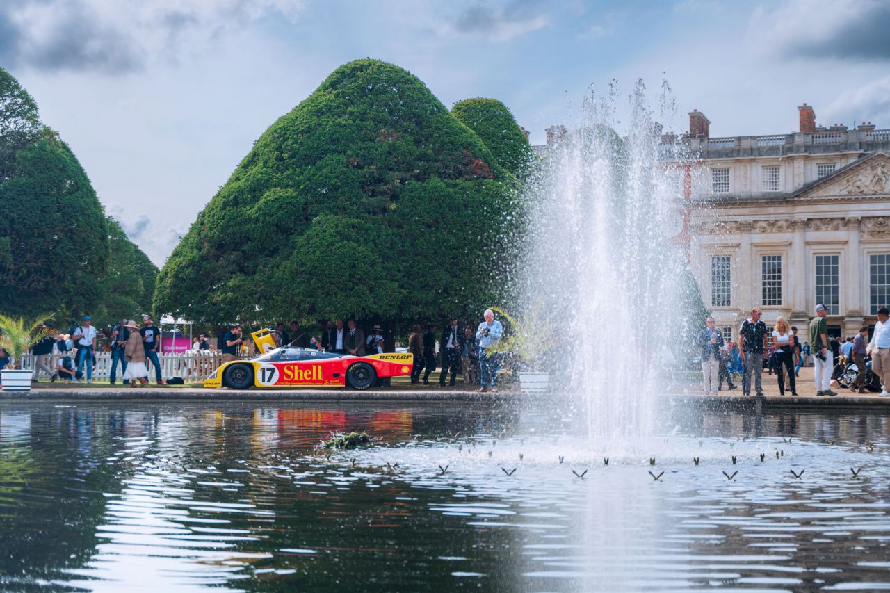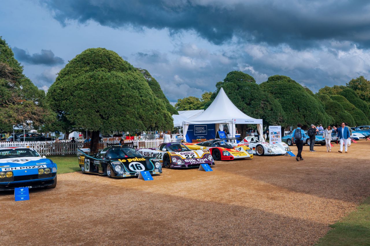 La imagen muestra una exhibición de coches clásicos, destacando varios modelos icónicos. El evento se lleva a cabo al aire libre, rodeado de árboles y una carpa. Los visitantes disfrutan de la vista de estos vehículos únicos, que representan la historia del automovilismo.