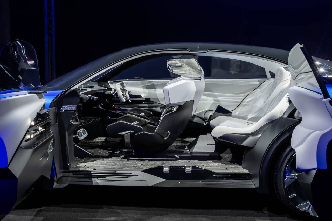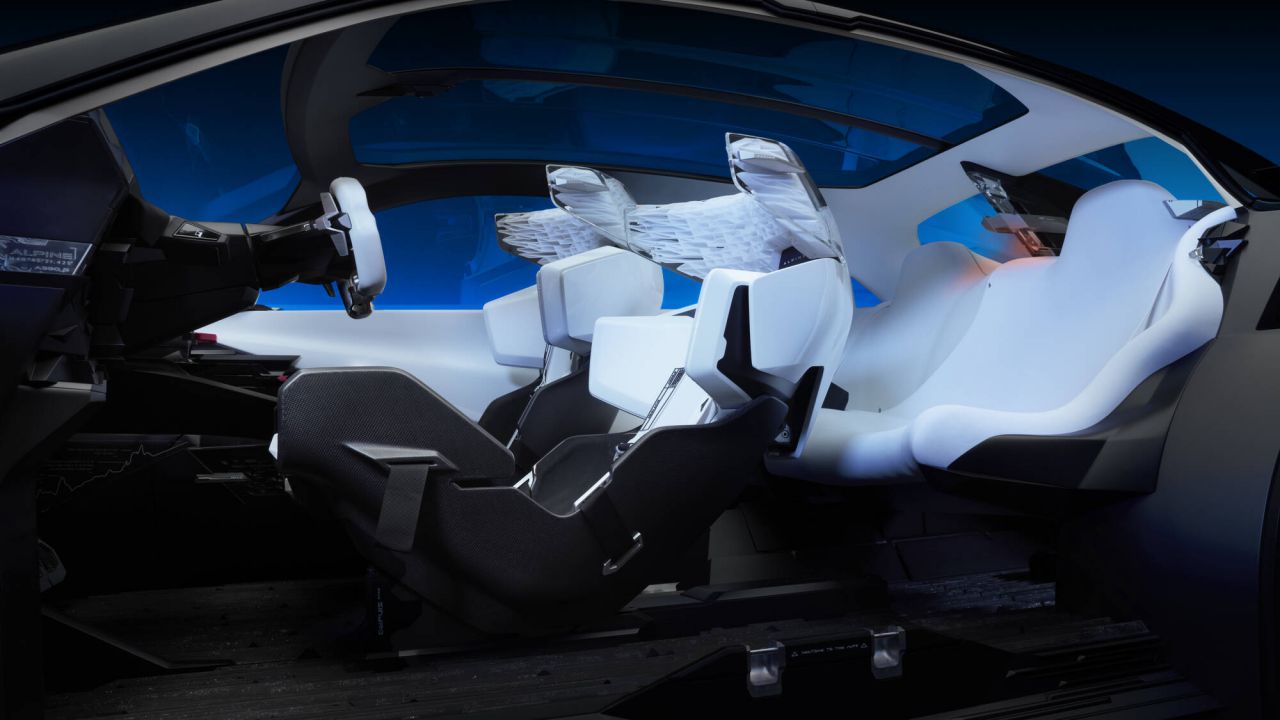 Esta imagen muestra el interior de un automóvil concepto de Alpine, destacando su diseño futurista y asientos innovadores. La cabina presenta un estilo minimalista y tecnológico, ideal para un vehículo del futuro. Los detalles en los asientos y el volante reflejan la visión avanzada de la marca.