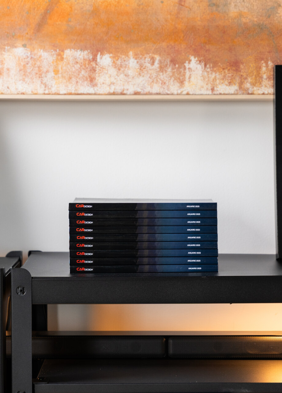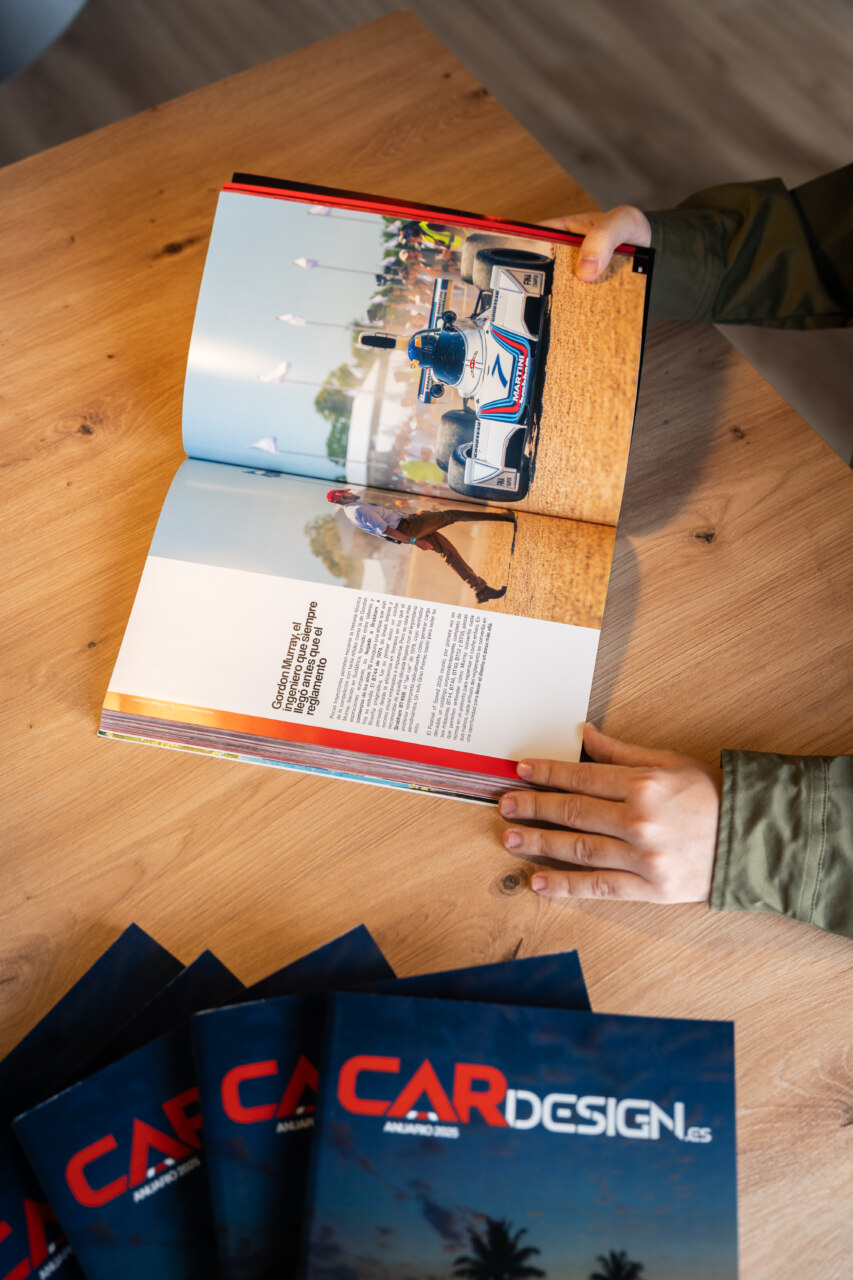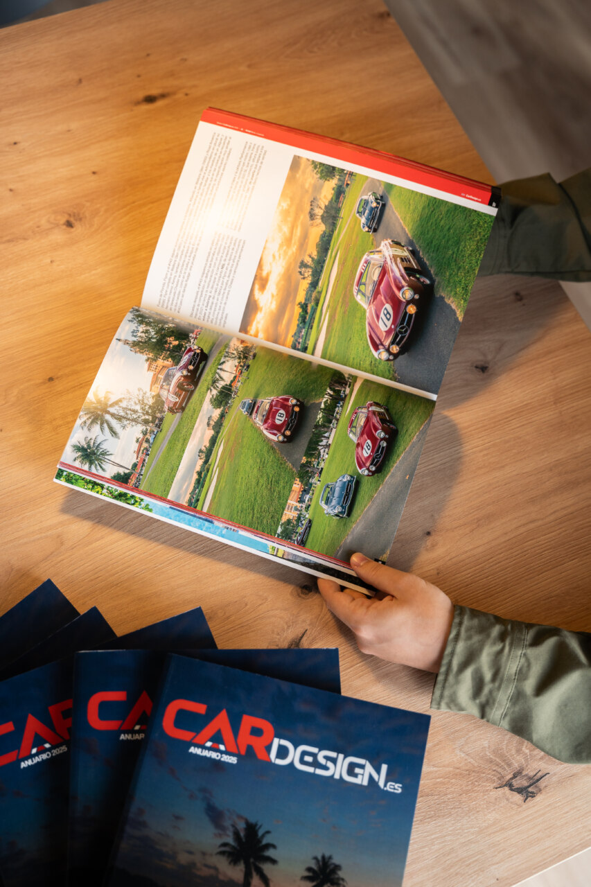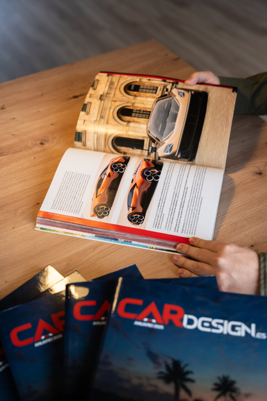 La imagen muestra a una persona hojeando el anuario 2025 de CarDesign.es, destacando diseños innovadores de automóviles. En la mesa, se pueden ver más ejemplares de la publicación, que ofrecen una visión completa del mundo del diseño automotriz.