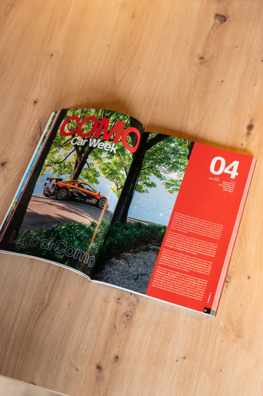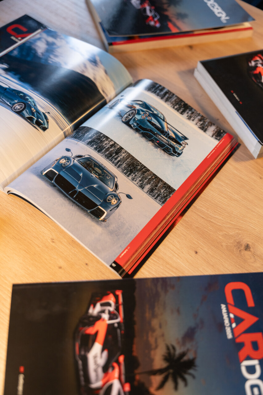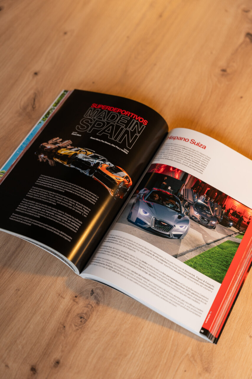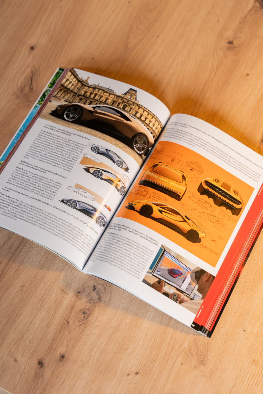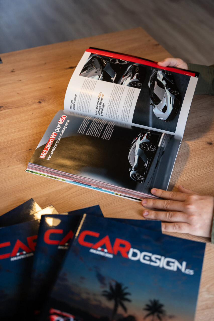 La imagen muestra a una persona hojeando el anuario 2025 de CarDesign.es, destacando diseños innovadores de automóviles. En la mesa, se pueden ver más ejemplares de la publicación, que ofrecen una visión completa del mundo del diseño automotriz.