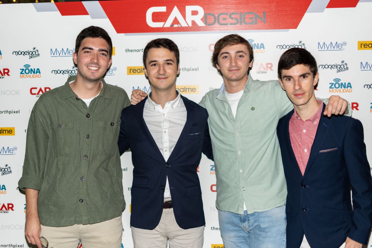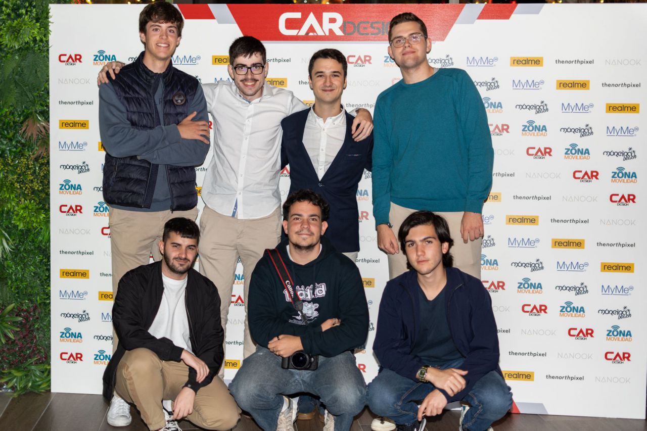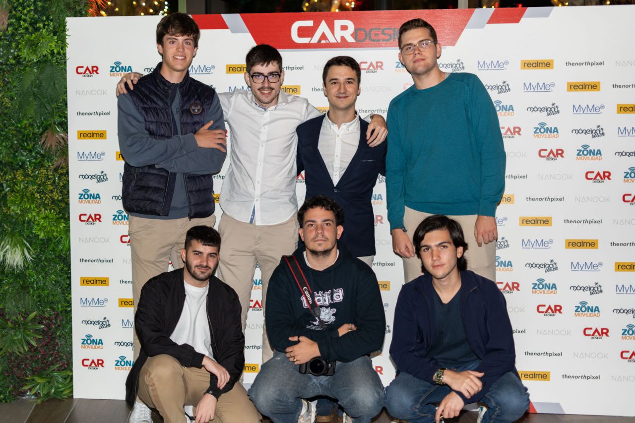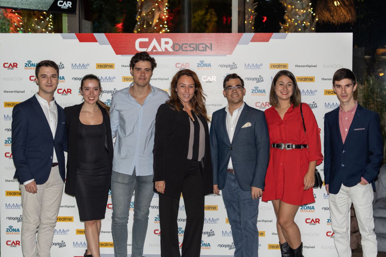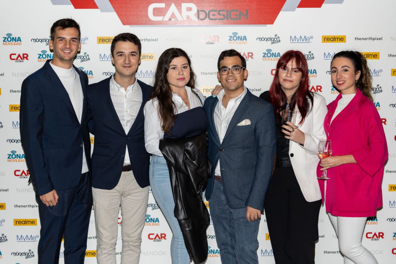 En esta imagen, un grupo de seis personas se presenta en el evento Car Design. Todos lucen sonrientes y están vestidos de manera casual, destacando la camaradería y el ambiente profesional del evento. El fondo está decorado con logotipos de patrocinadores, añadiendo un toque corporativo a la escena.