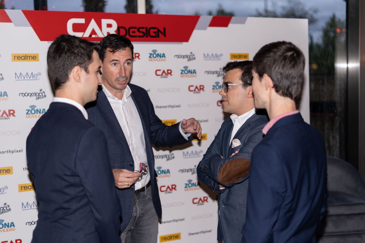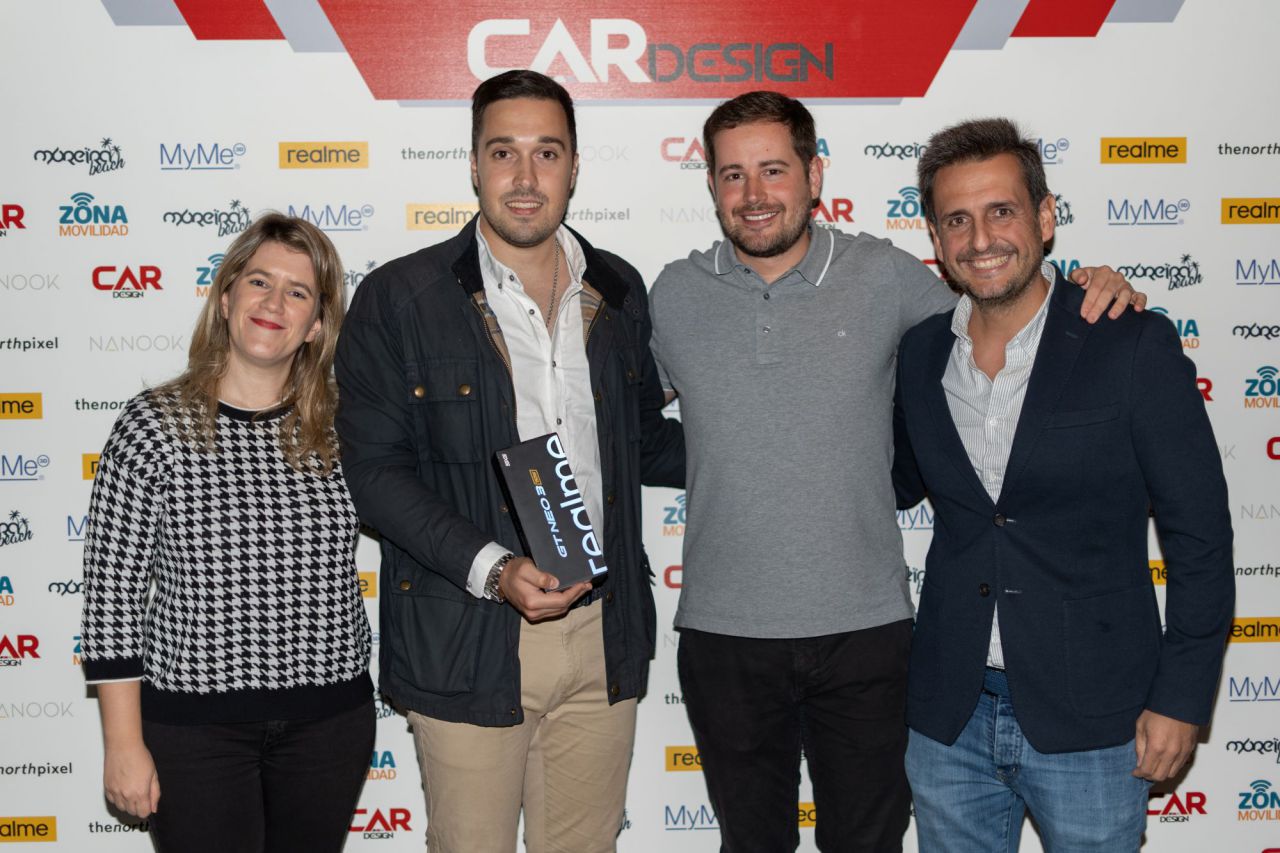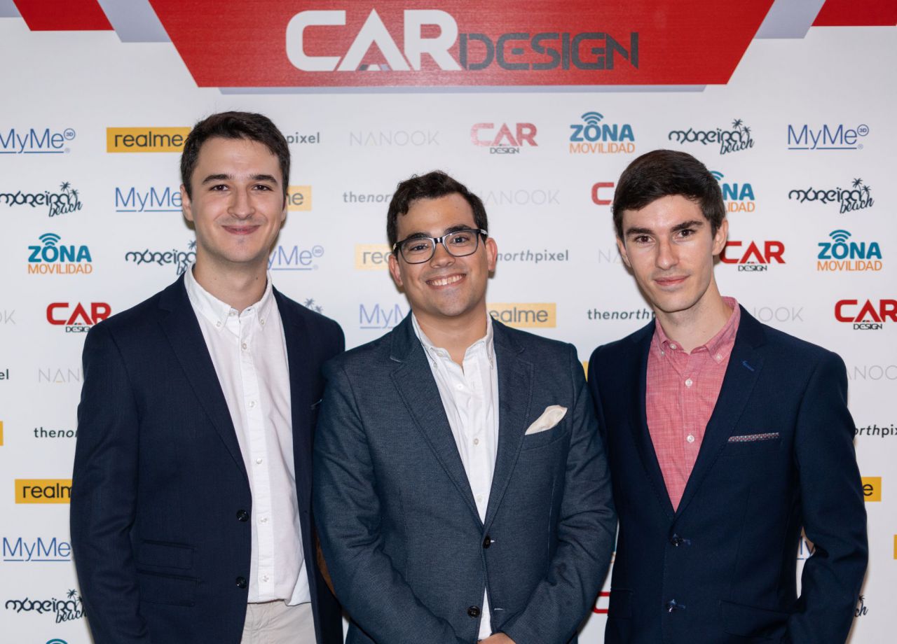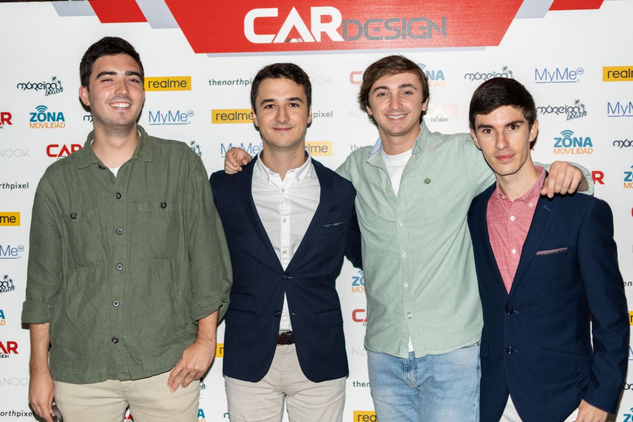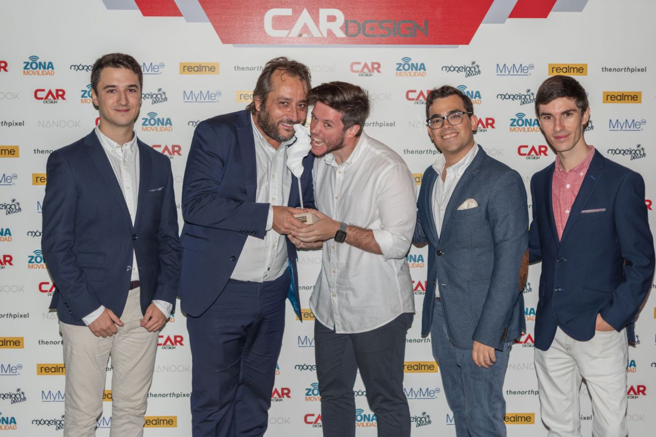 En esta imagen, un grupo de seis personas se presenta en el evento Car Design. Todos lucen sonrientes y están vestidos de manera casual, destacando la camaradería y el ambiente profesional del evento. El fondo está decorado con logotipos de patrocinadores, añadiendo un toque corporativo a la escena.