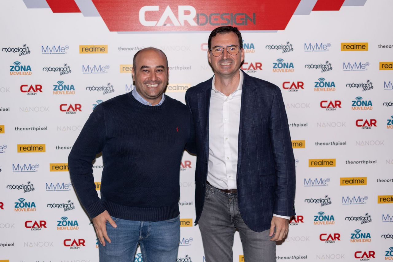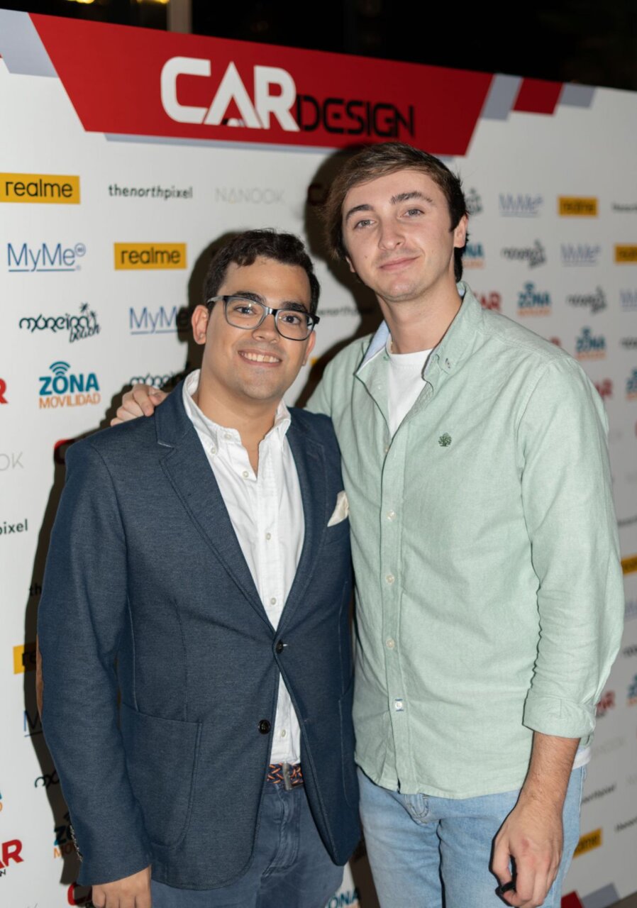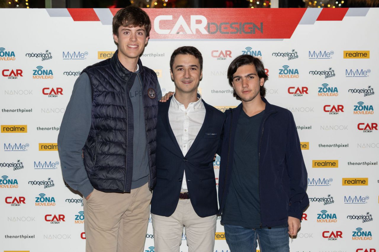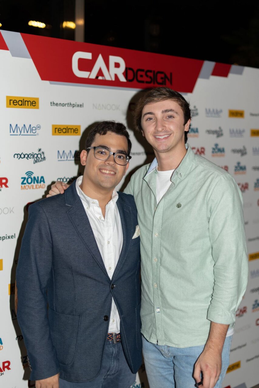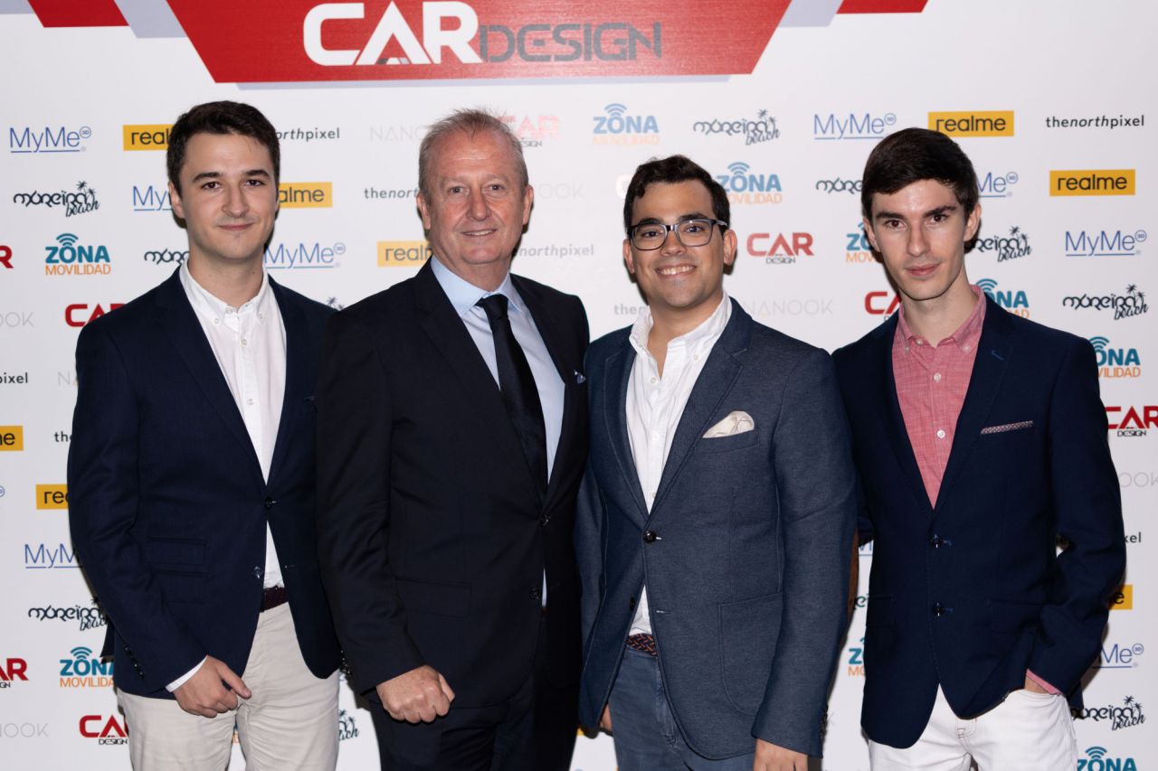 En esta imagen, un grupo de seis personas se presenta en el evento Car Design. Todos lucen sonrientes y están vestidos de manera casual, destacando la camaradería y el ambiente profesional del evento. El fondo está decorado con logotipos de patrocinadores, añadiendo un toque corporativo a la escena.