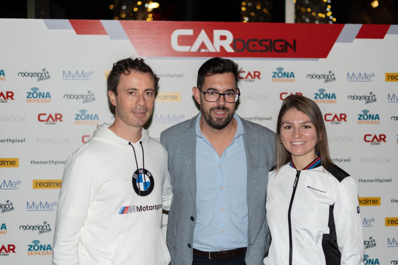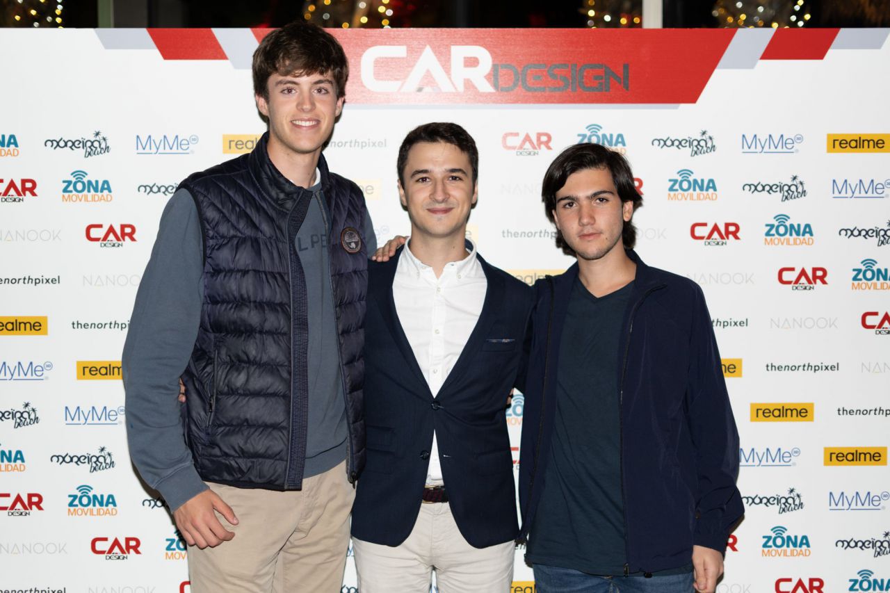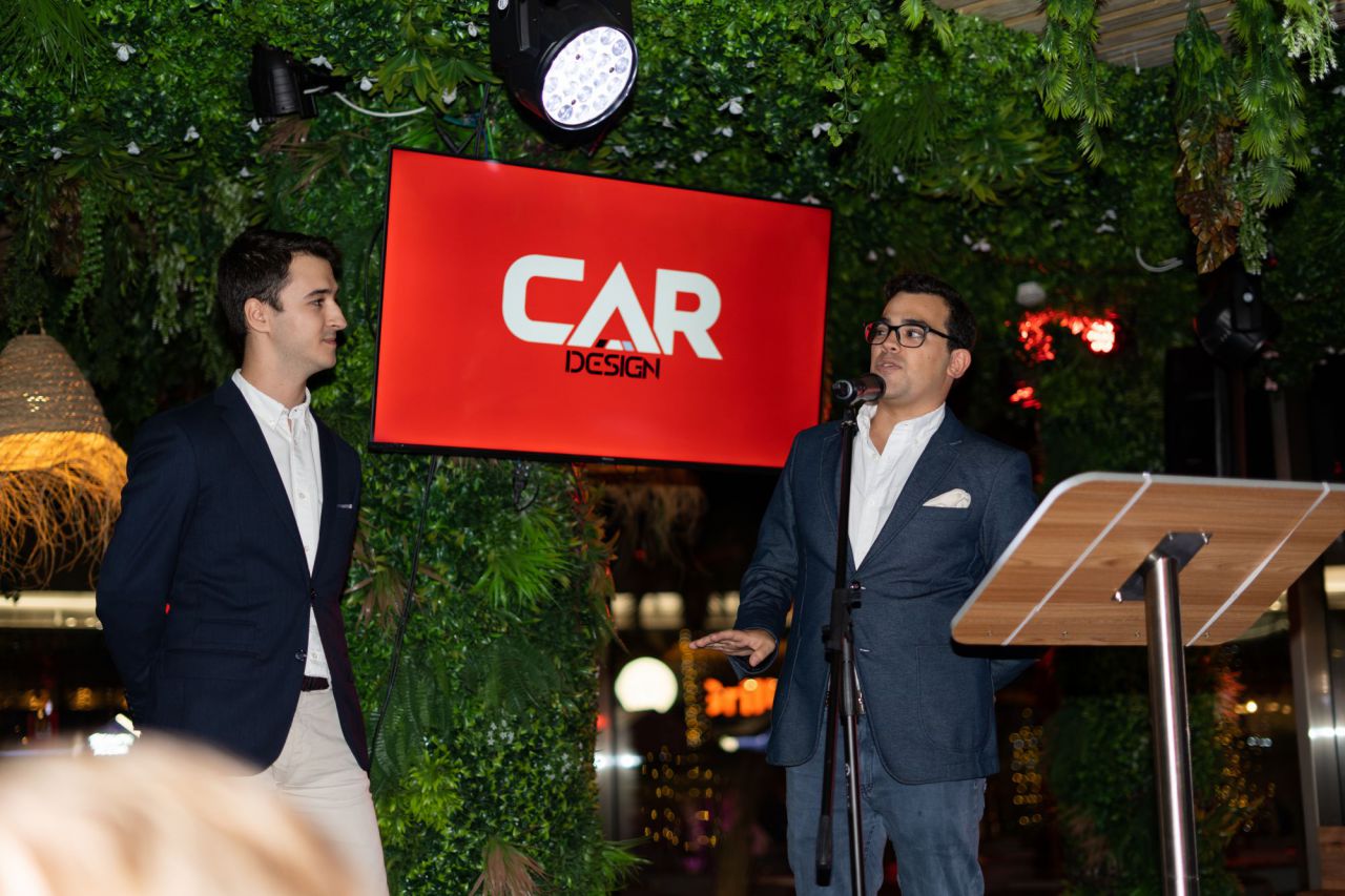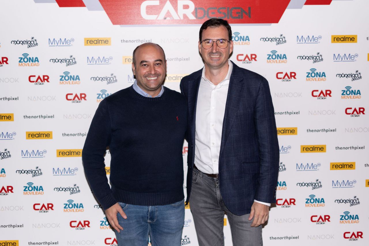 En esta imagen, un grupo de seis personas se presenta en el evento Car Design. Todos lucen sonrientes y están vestidos de manera casual, destacando la camaradería y el ambiente profesional del evento. El fondo está decorado con logotipos de patrocinadores, añadiendo un toque corporativo a la escena.