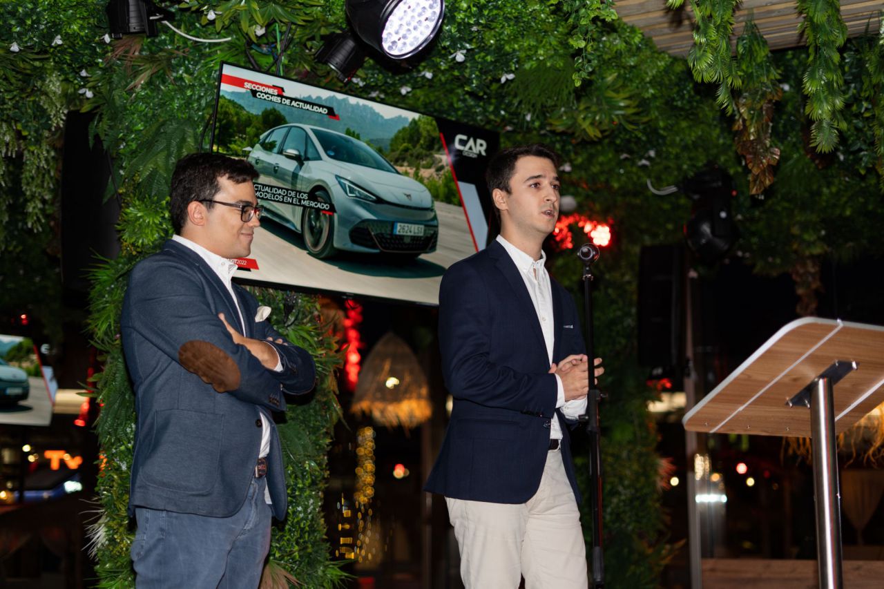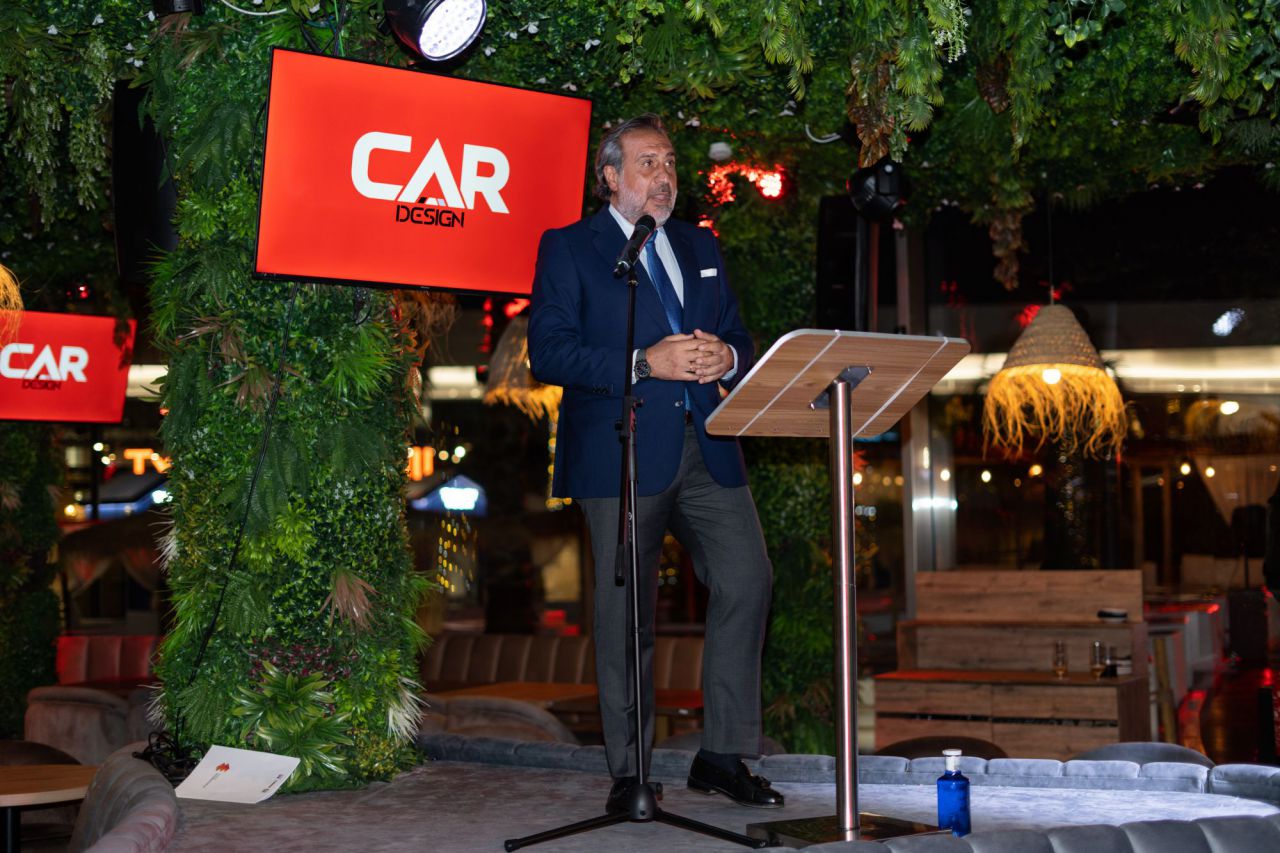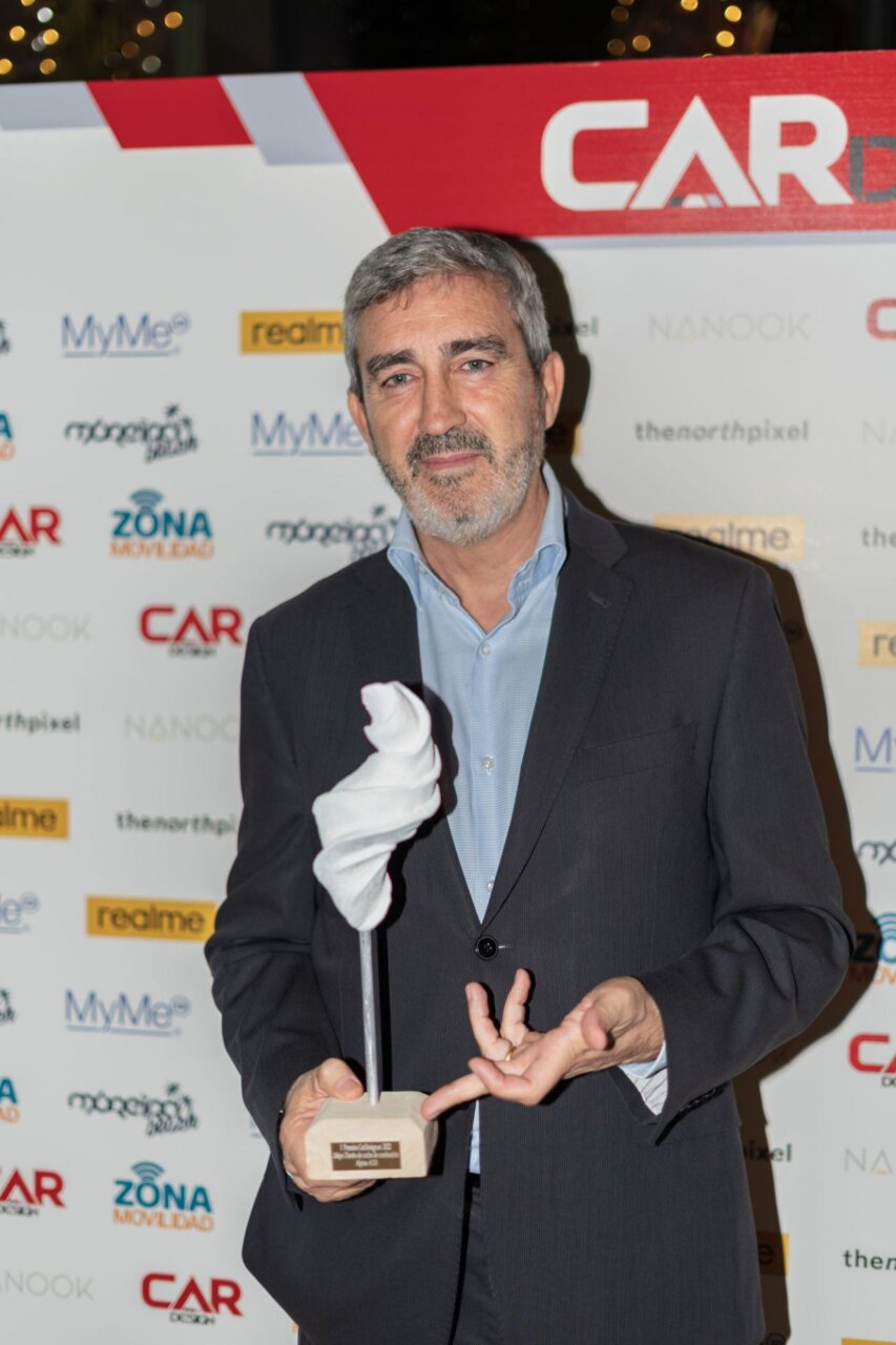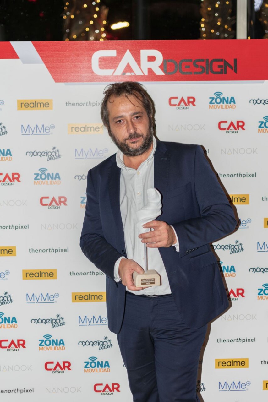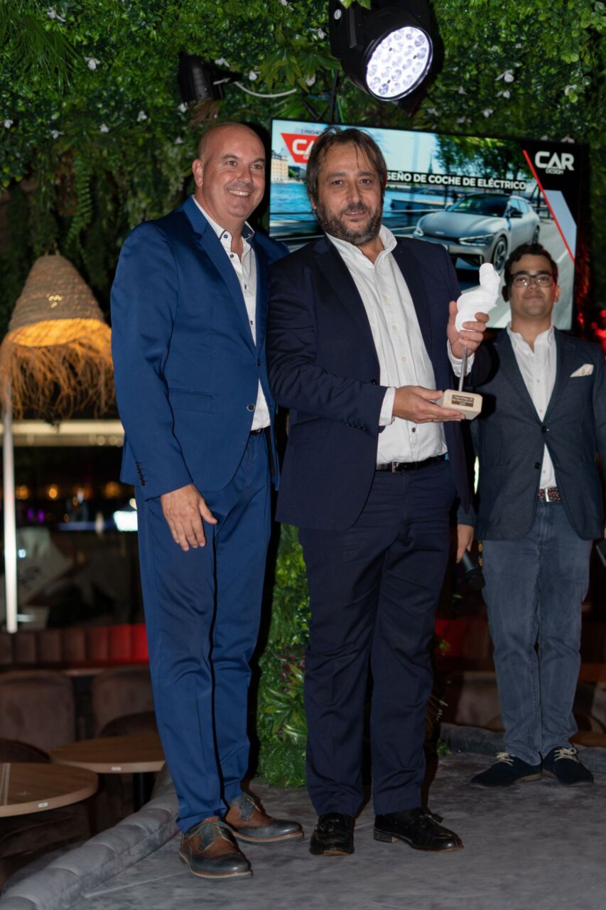 En esta imagen, un grupo de seis personas se presenta en el evento Car Design. Todos lucen sonrientes y están vestidos de manera casual, destacando la camaradería y el ambiente profesional del evento. El fondo está decorado con logotipos de patrocinadores, añadiendo un toque corporativo a la escena.