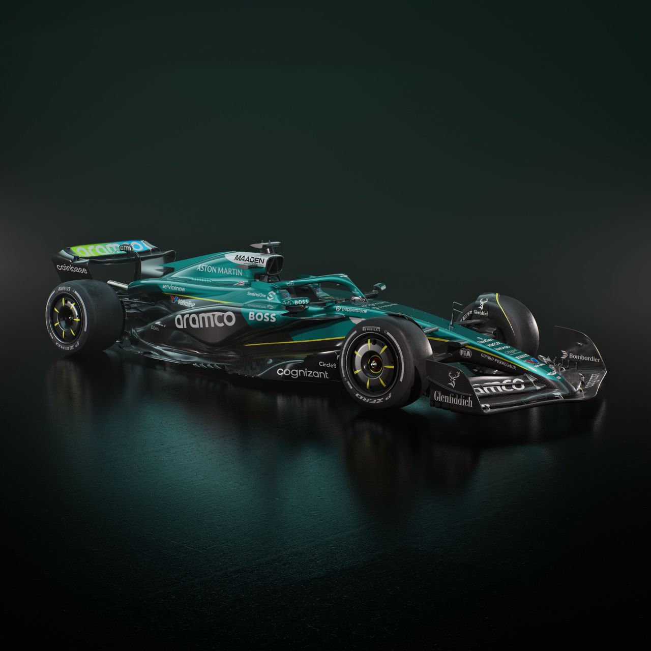 Un impresionante coche de Fórmula 1 de Aston Martin en un entorno oscuro.