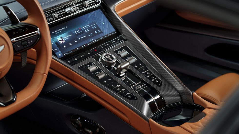 Vista del interior de un auto de lujo con detalles elegantes.