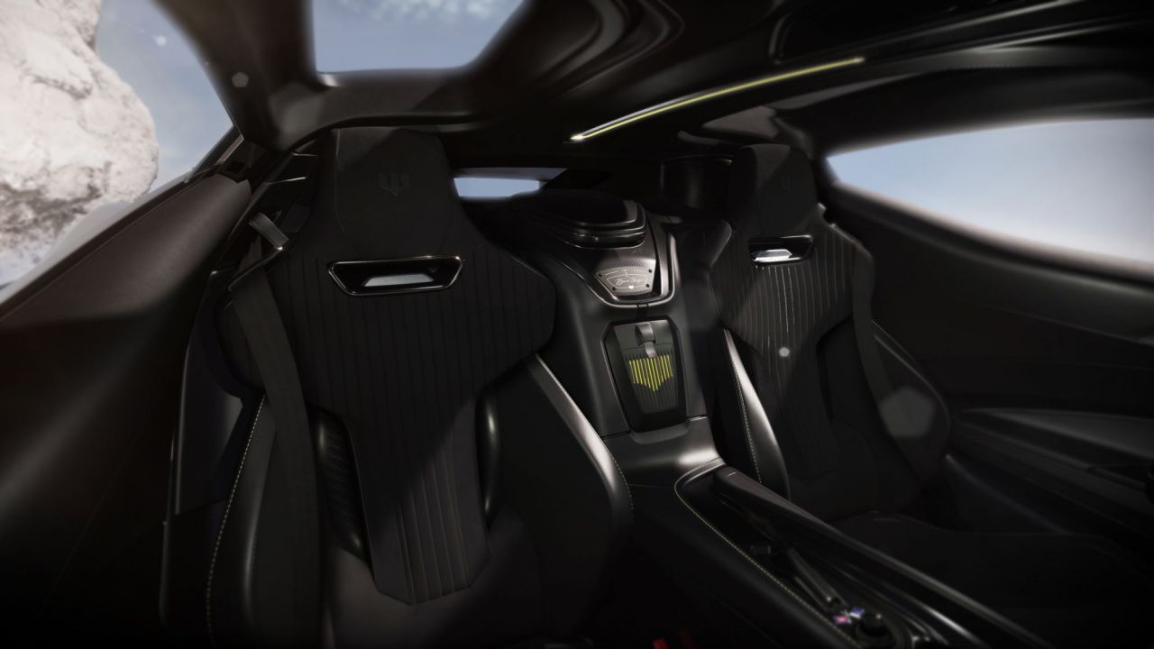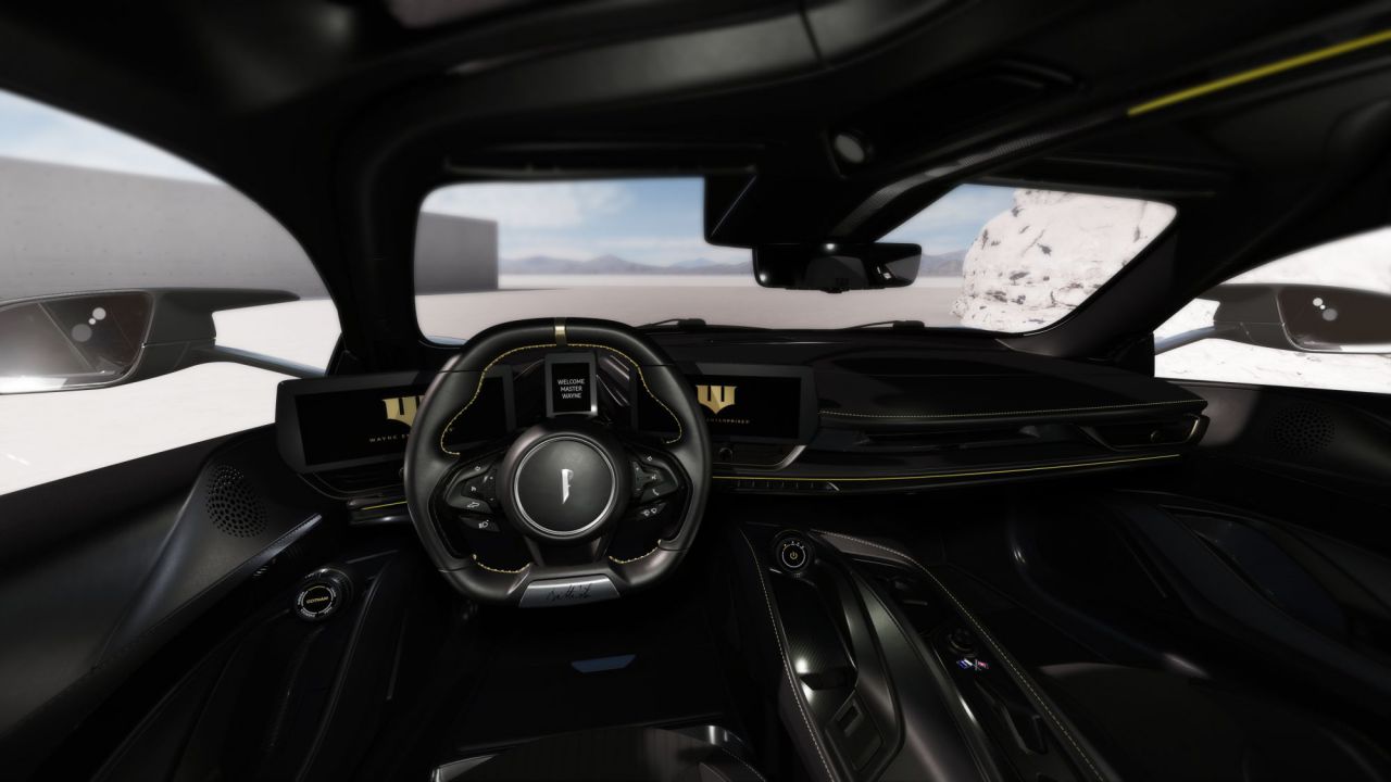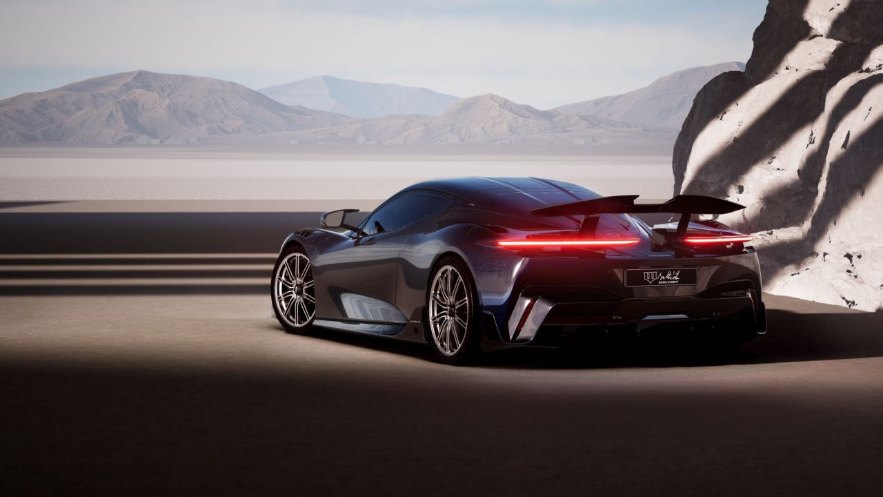 La imagen muestra un elegante automóvil deportivo negro, con un diseño aerodinámico, estacionado en un paisaje desértico. Las montañas se alzan en el fondo, creando un contraste visual atractivo. Este vehículo destaca por su estilo moderno y su potente rendimiento.