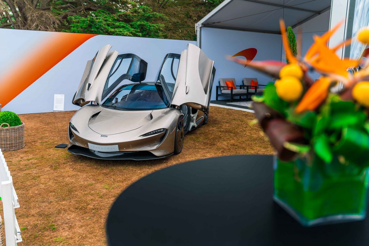 En esta imagen, el McLaren Senna se muestra en una exhibición con sus puertas abiertas, resaltando su diseño aerodinámico y elegante. El evento ofrece un ambiente sofisticado, con muebles modernos y decoración floral. Este superdeportivo es un símbolo de la innovación en la industria automotriz.