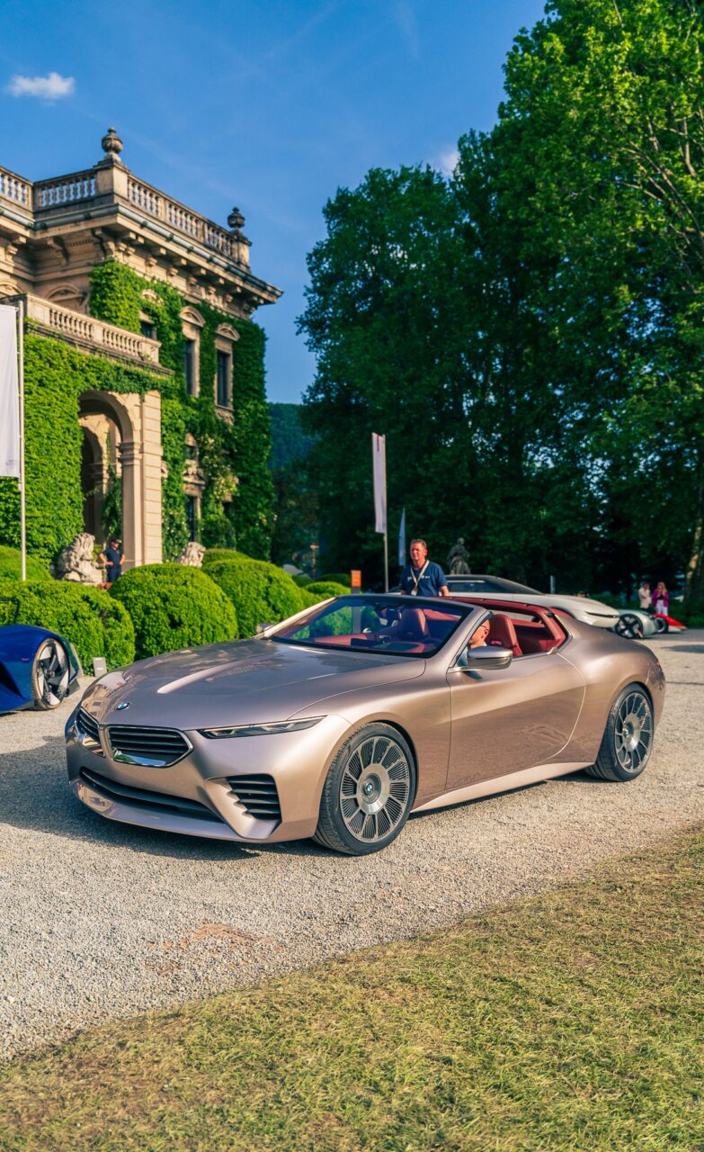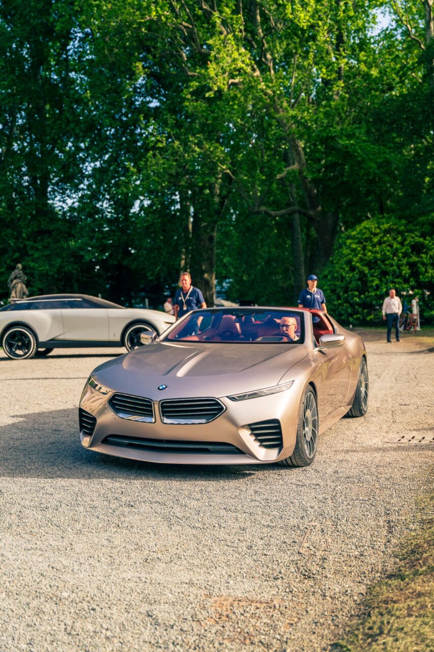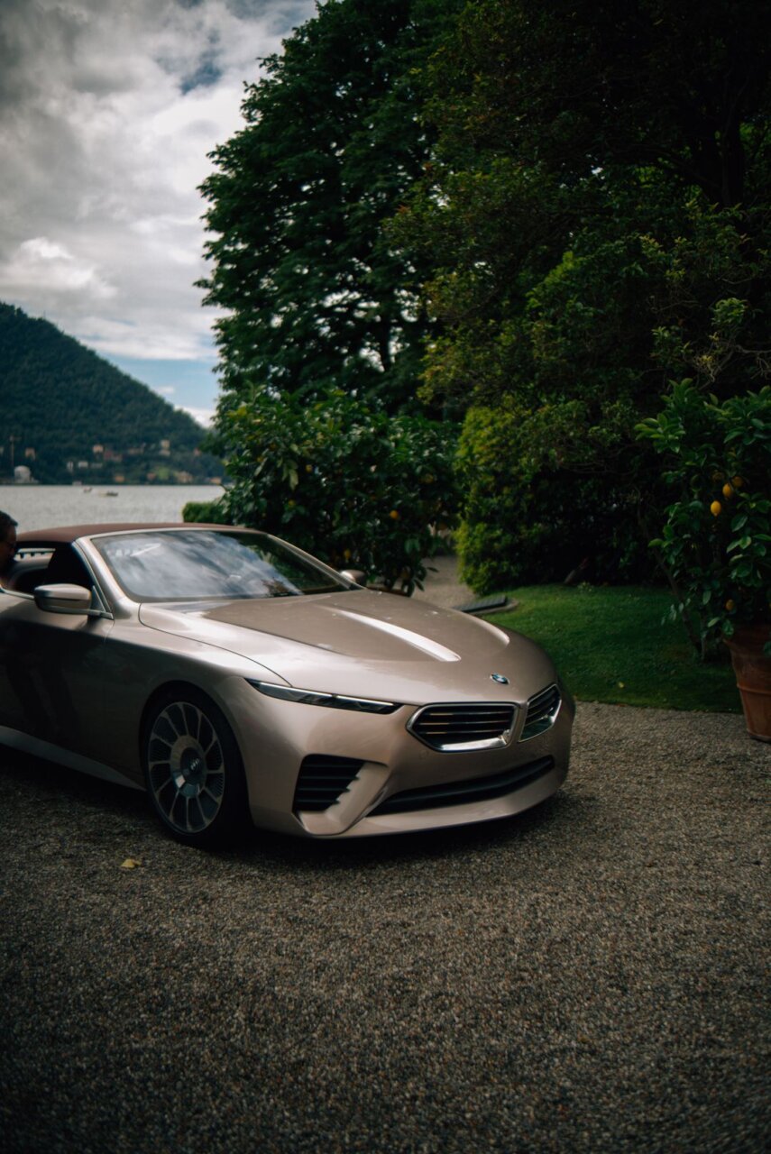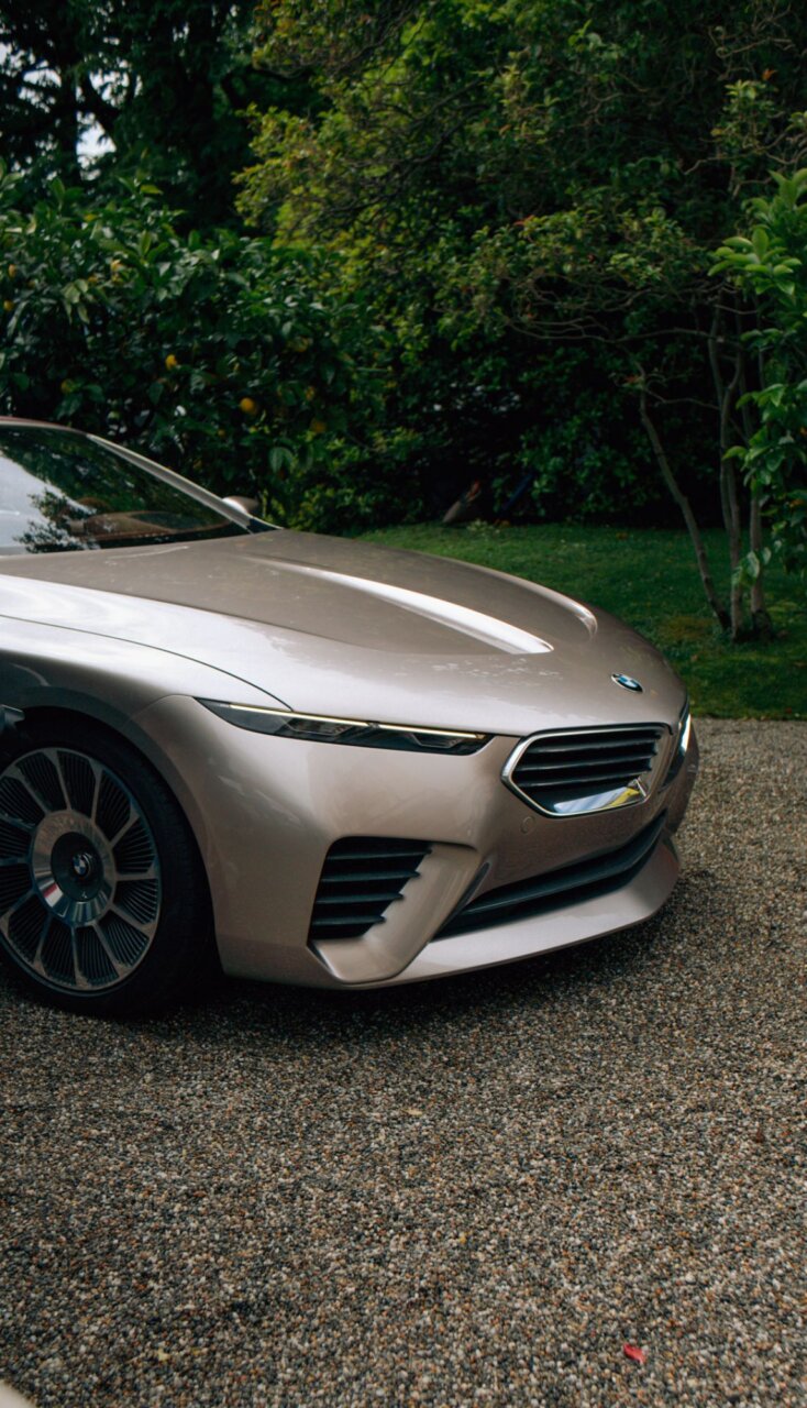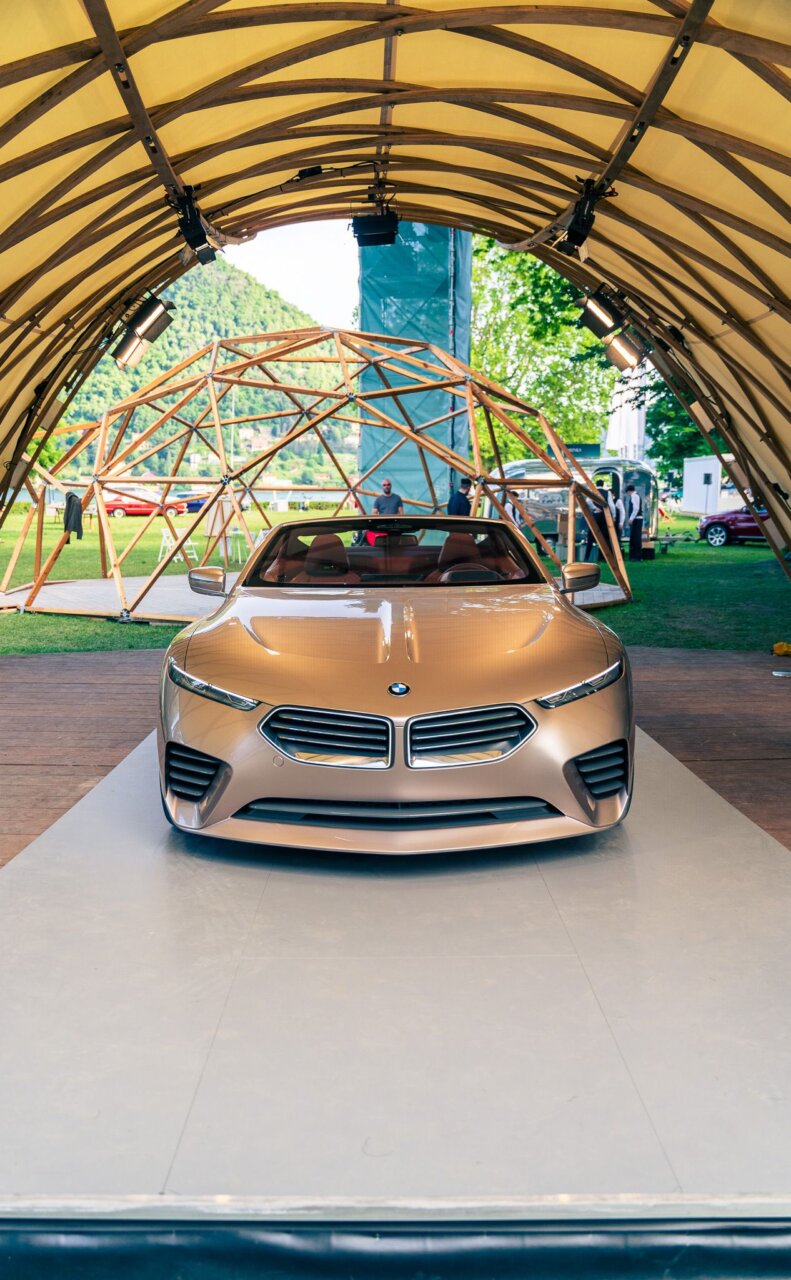 Esta imagen muestra un coche concepto de BMW, destacando su diseño moderno y elegante. El vehículo está expuesto en un entorno natural, rodeado de árboles y asistentes al evento. La atención al detalle en el diseño del coche es notable, lo que lo convierte en una pieza central de la exposición.