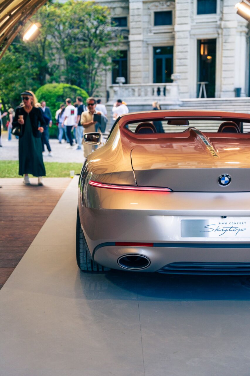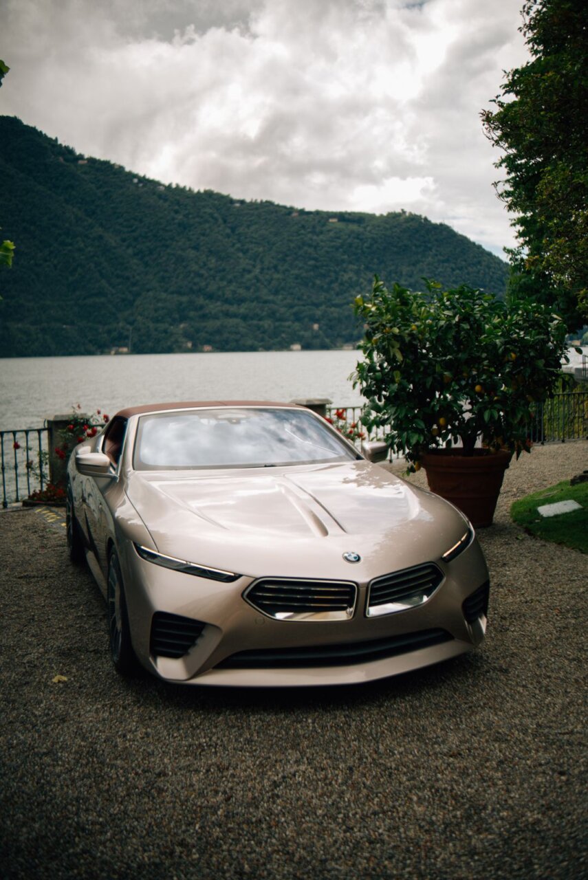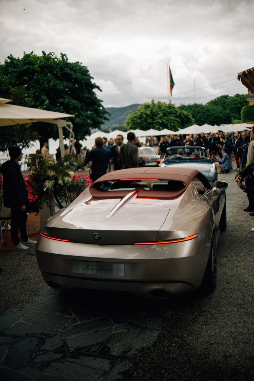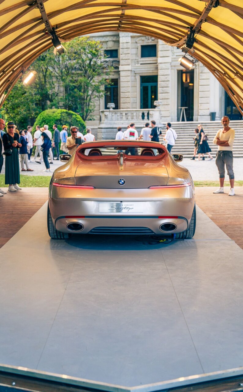 Esta imagen muestra un coche concepto de BMW, destacando su diseño moderno y elegante. El vehículo está expuesto en un entorno natural, rodeado de árboles y asistentes al evento. La atención al detalle en el diseño del coche es notable, lo que lo convierte en una pieza central de la exposición.