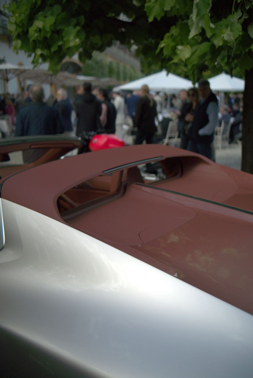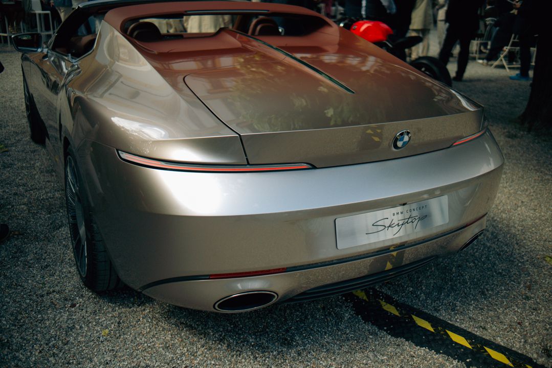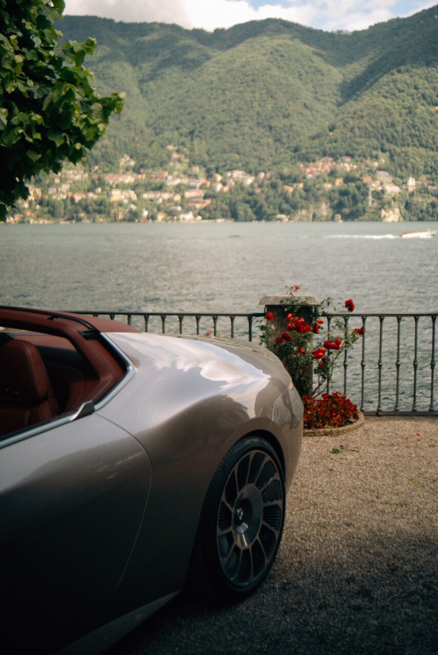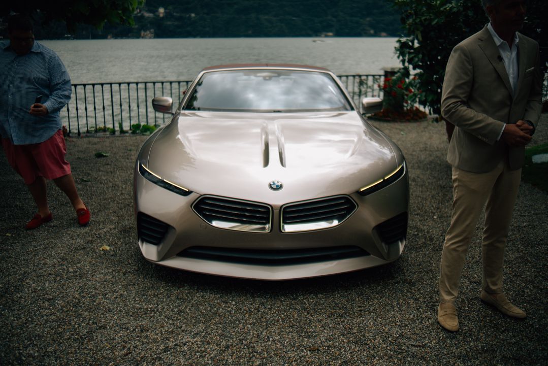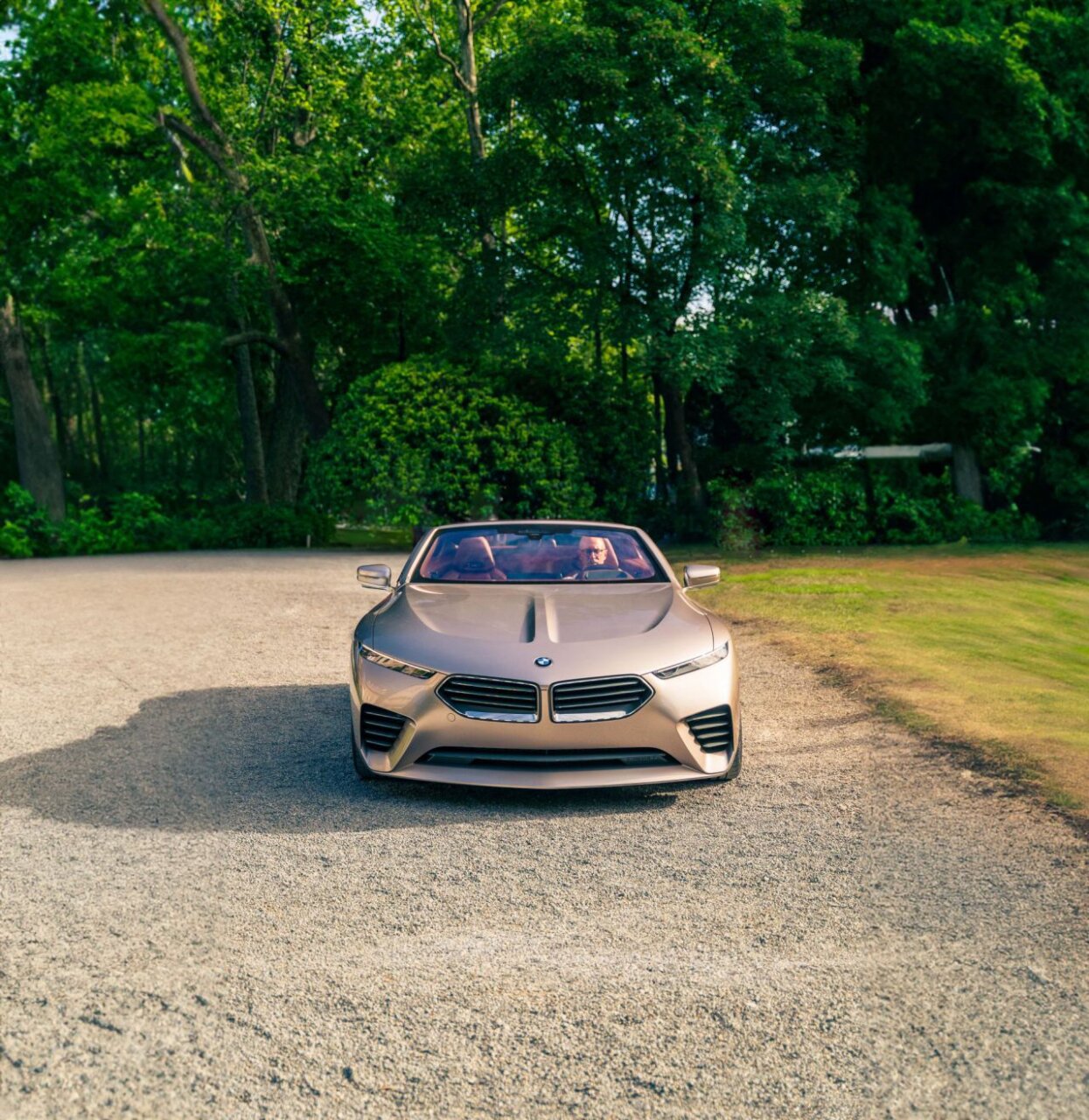 Esta imagen muestra un coche concepto de BMW, destacando su diseño moderno y elegante. El vehículo está expuesto en un entorno natural, rodeado de árboles y asistentes al evento. La atención al detalle en el diseño del coche es notable, lo que lo convierte en una pieza central de la exposición.