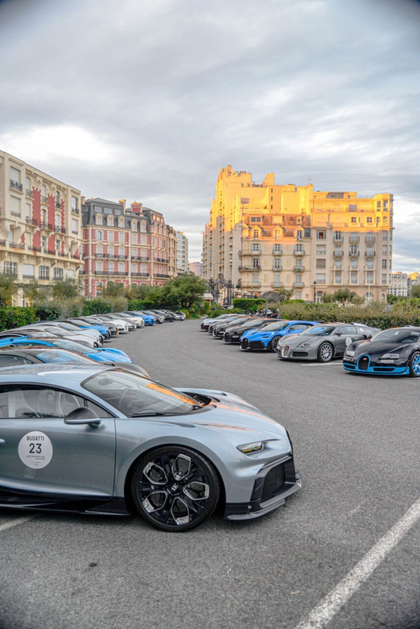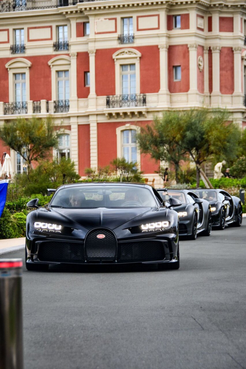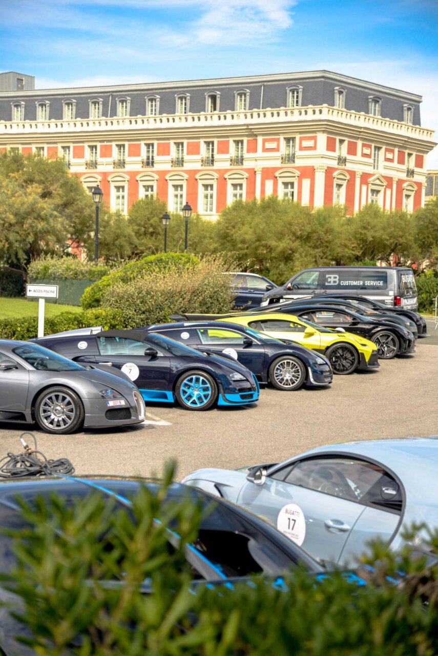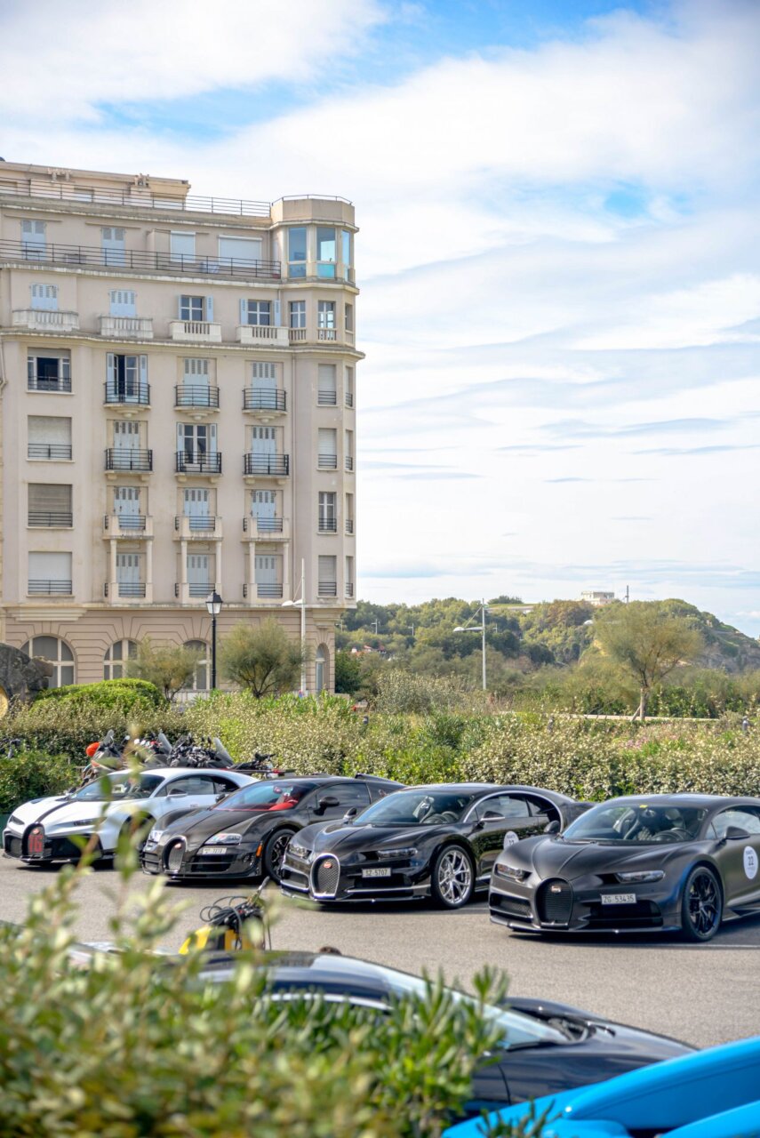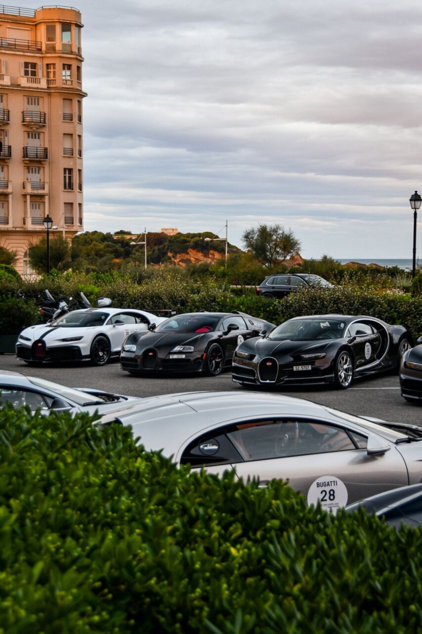 La imagen muestra una fila de coches lujosos en un evento al aire libre, con un edificio histórico al fondo. Los coches, de diversas marcas y colores, son el centro de atención, resaltando la exclusividad y el estilo. Este evento atrae a entusiastas del automovilismo y amantes del lujo.