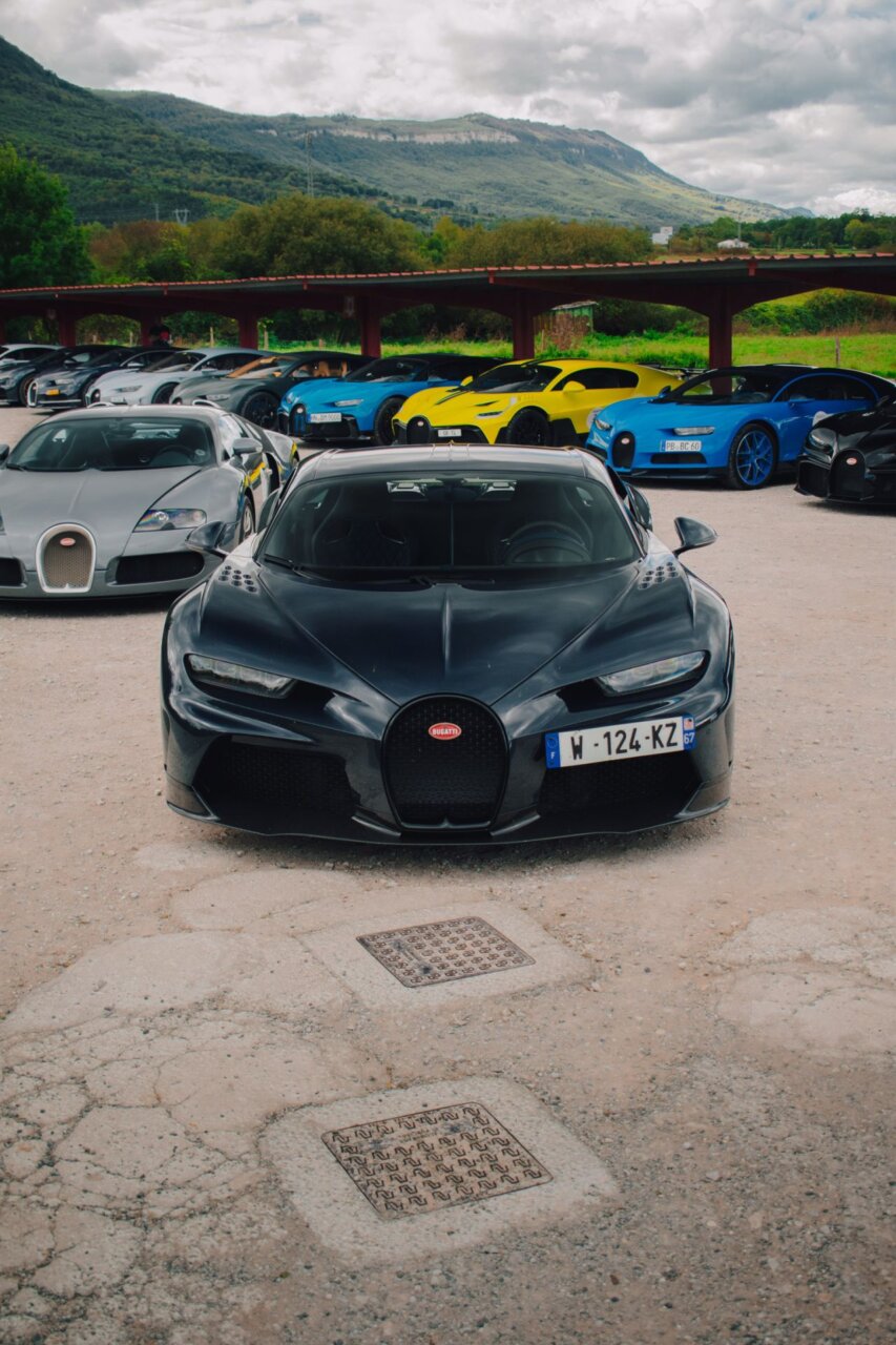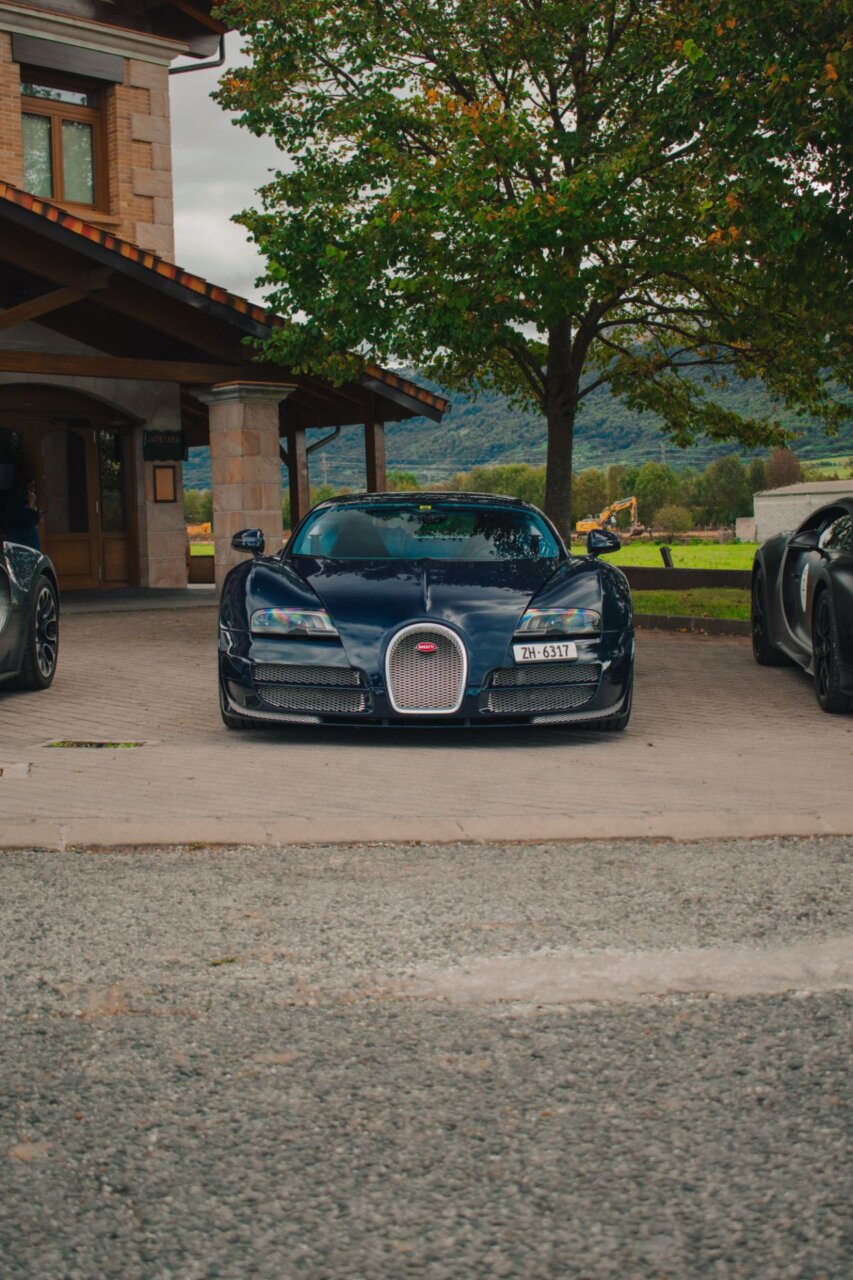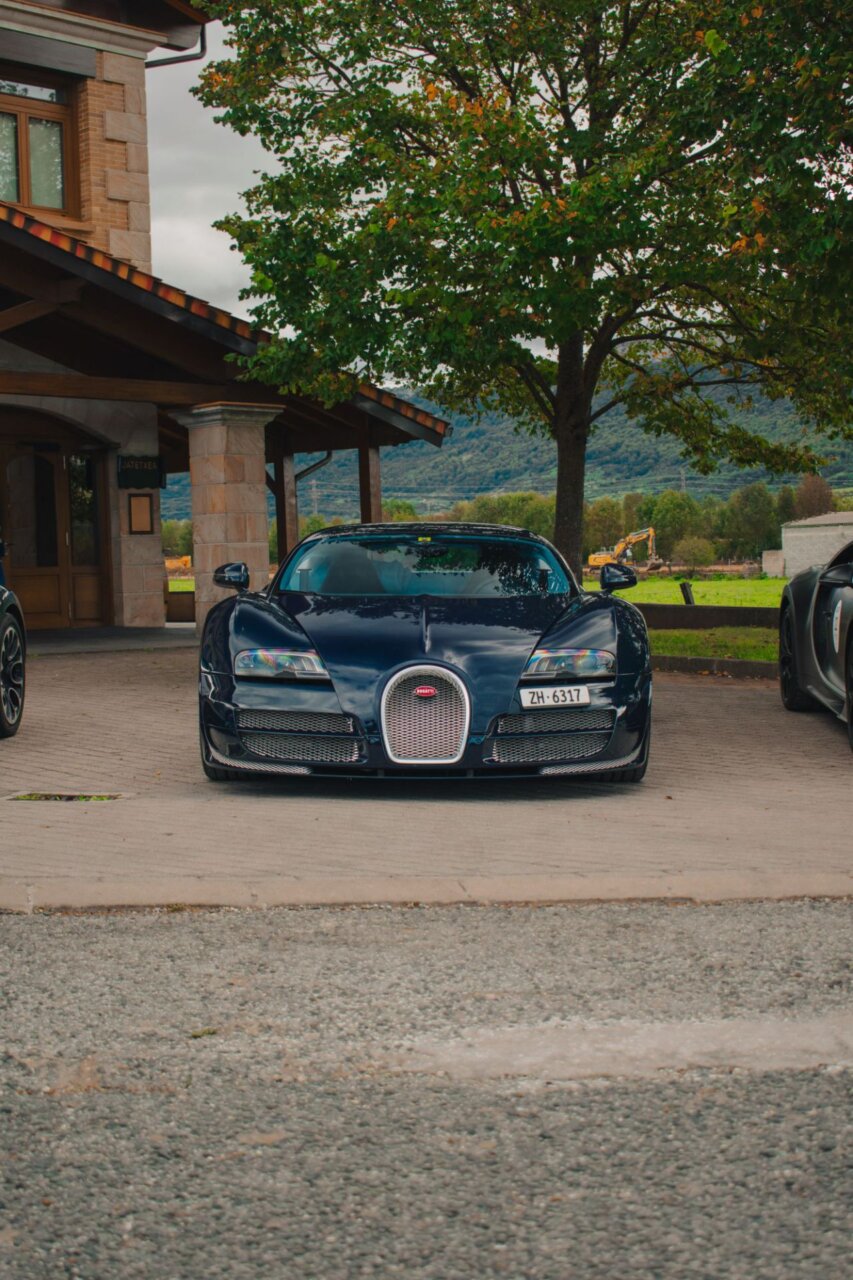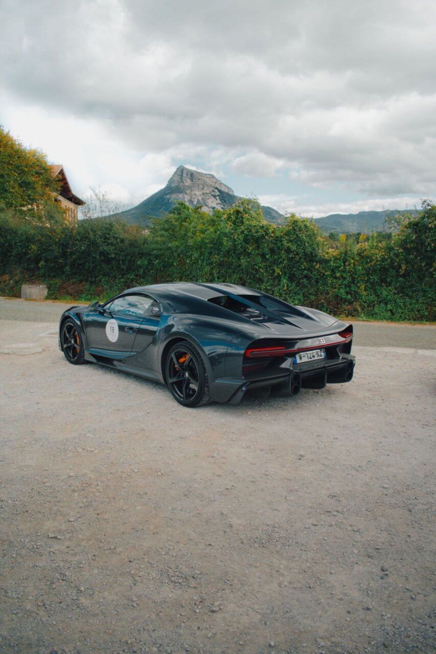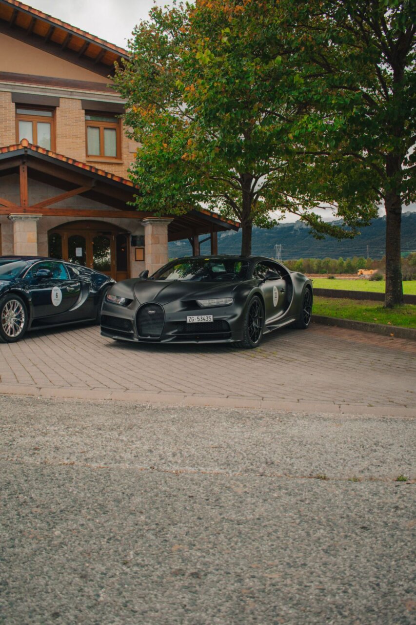 Esta imagen muestra un elegante automóvil Bugatti negro, resaltando su diseño aerodinámico y moderno. El coche está estacionado en un área verde, rodeado de árboles, lo que crea un contraste atractivo entre la máquina y la naturaleza. Ideal para los amantes de los automóviles de lujo.