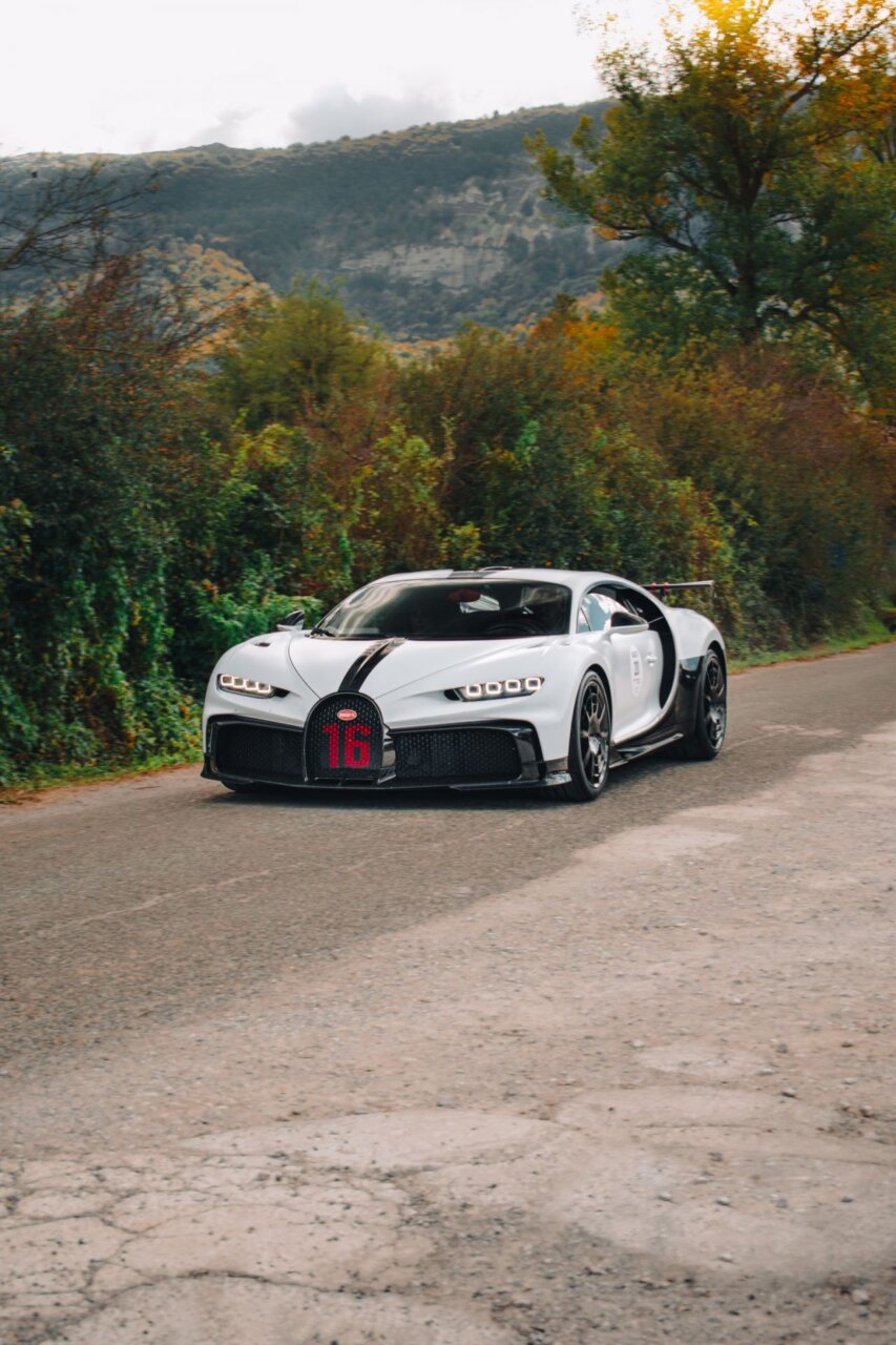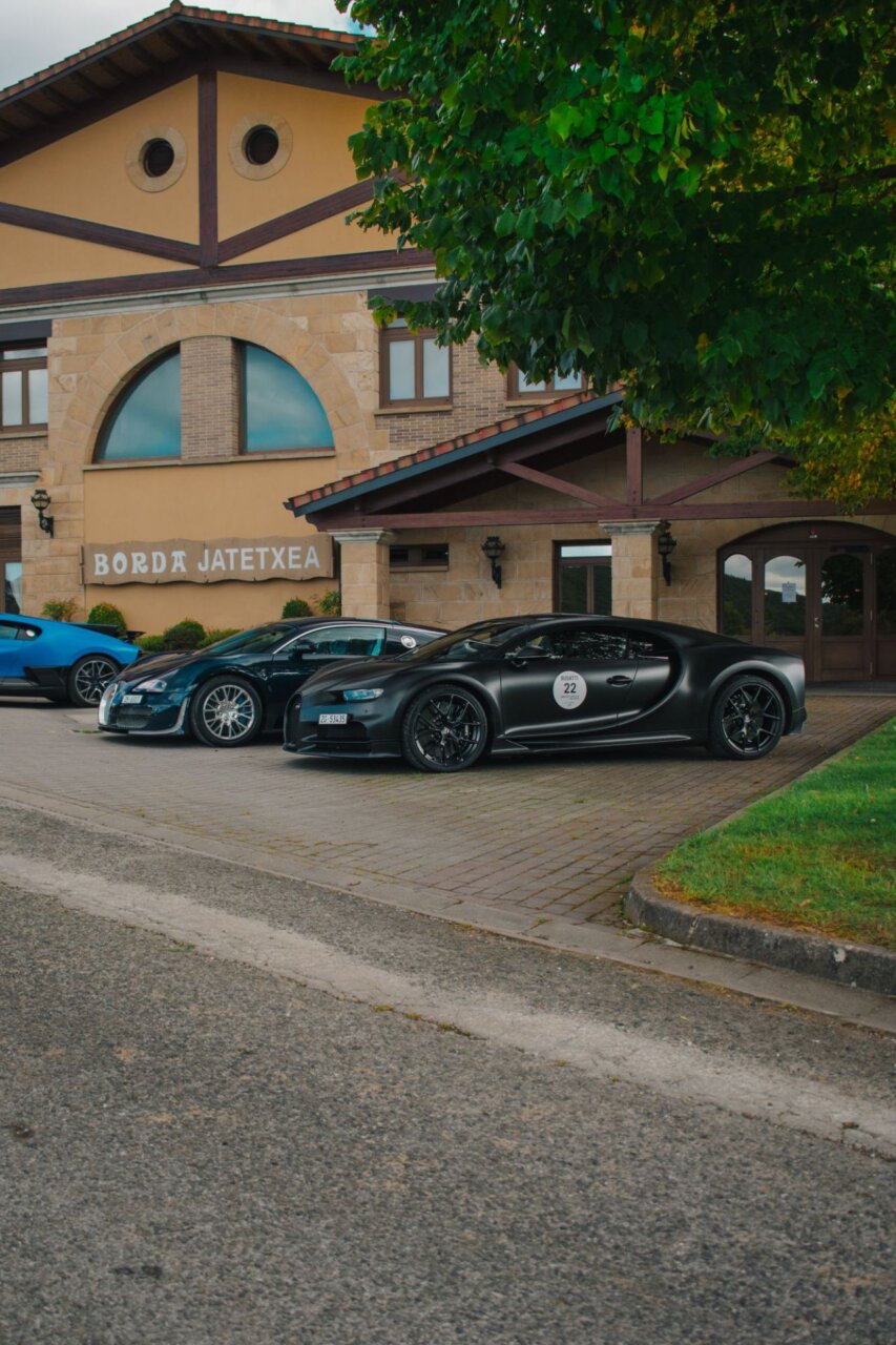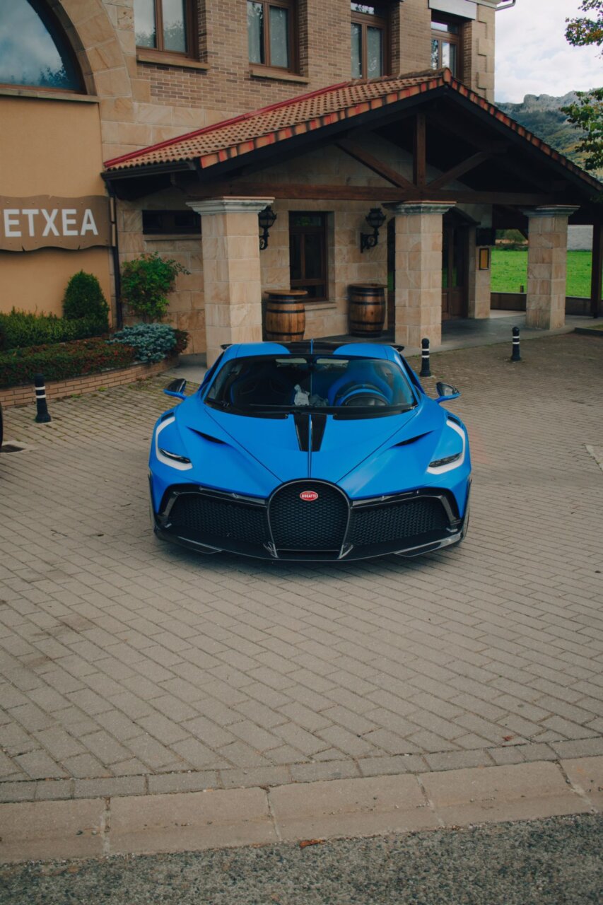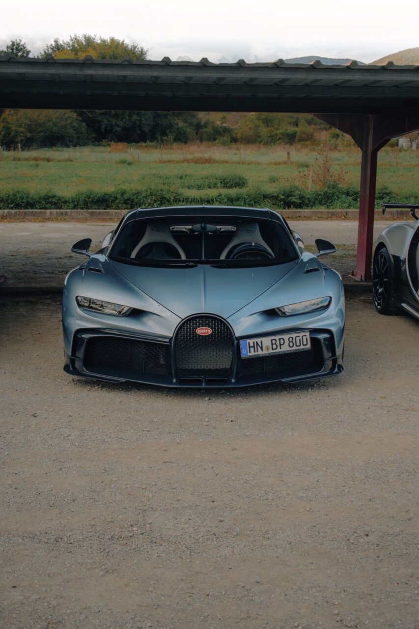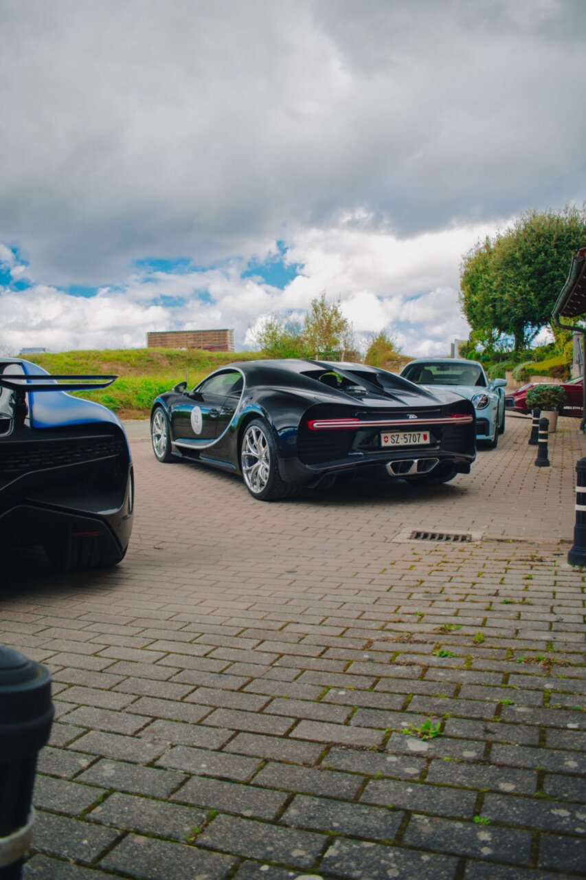 Esta imagen muestra un elegante automóvil Bugatti negro, resaltando su diseño aerodinámico y moderno. El coche está estacionado en un área verde, rodeado de árboles, lo que crea un contraste atractivo entre la máquina y la naturaleza. Ideal para los amantes de los automóviles de lujo.