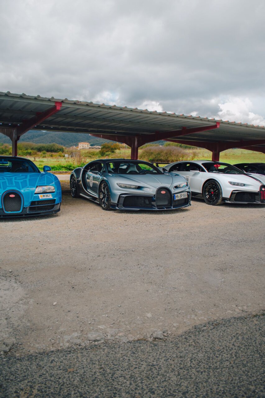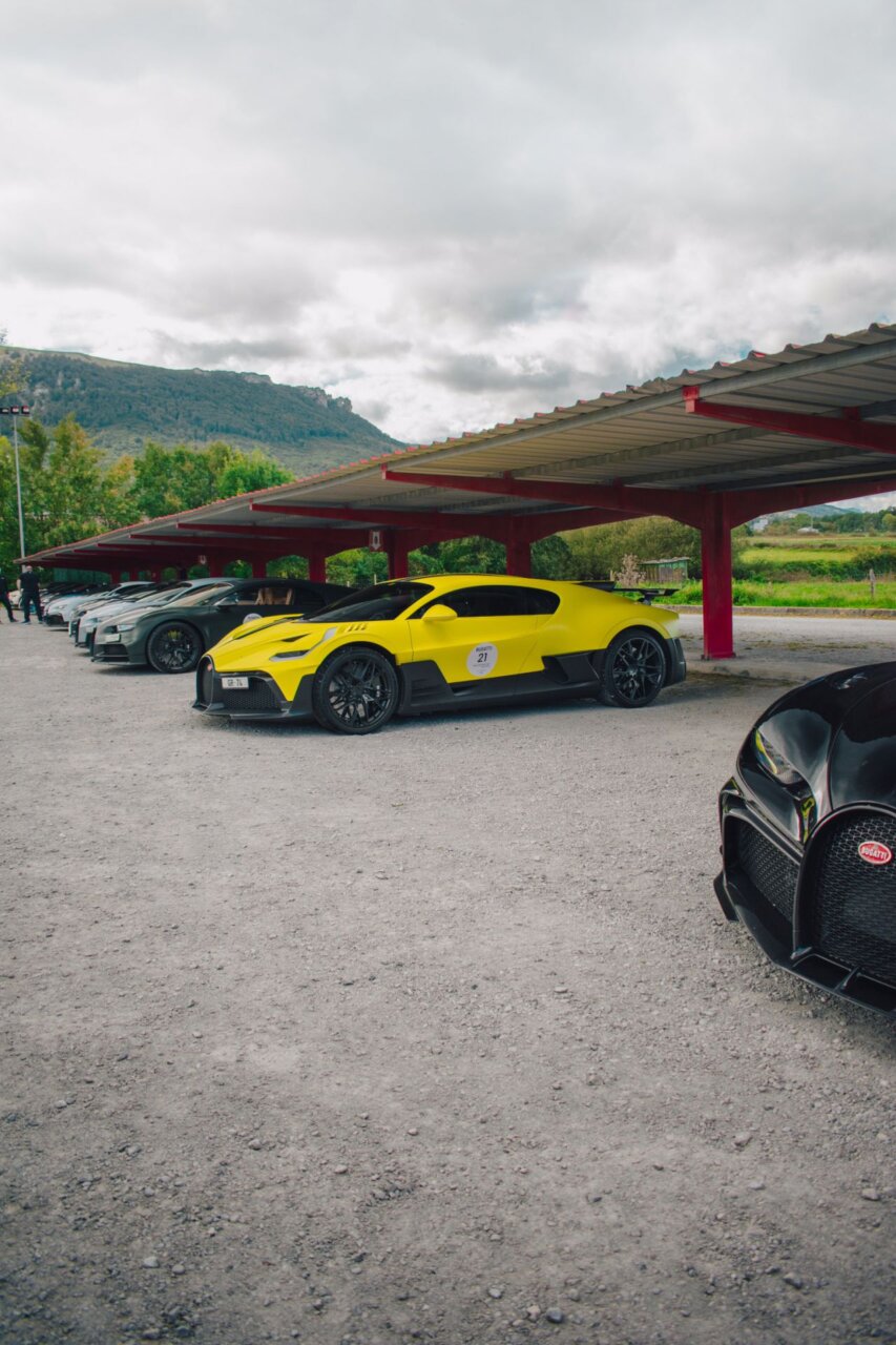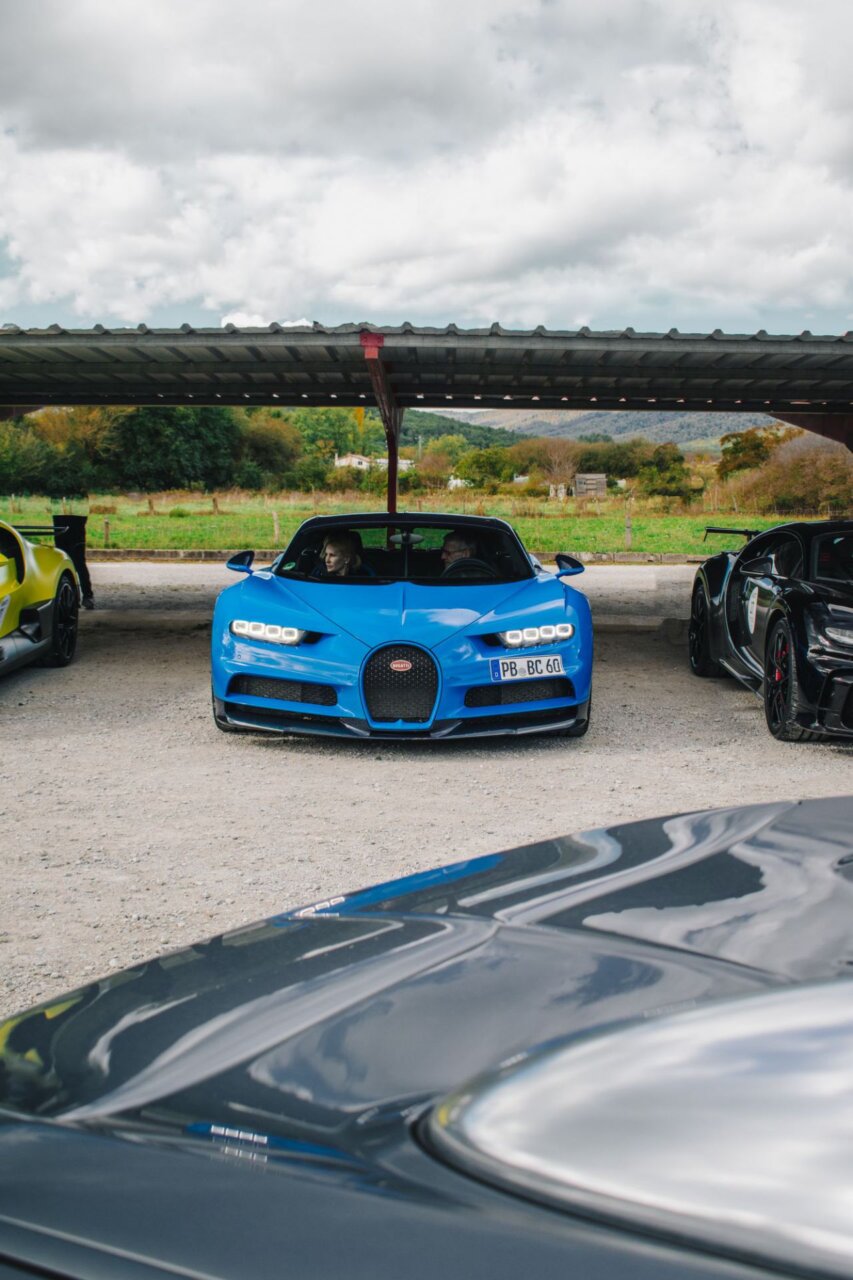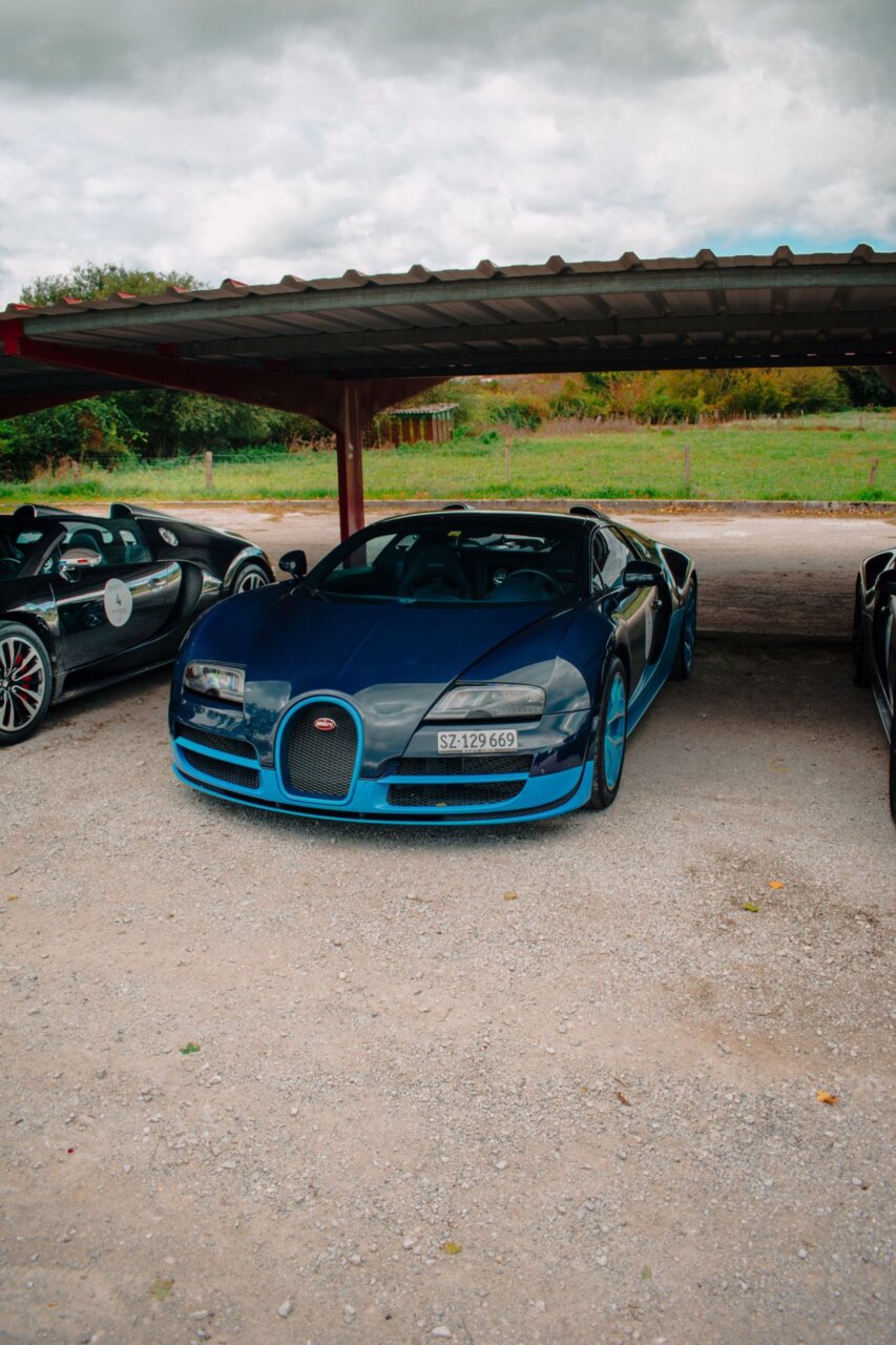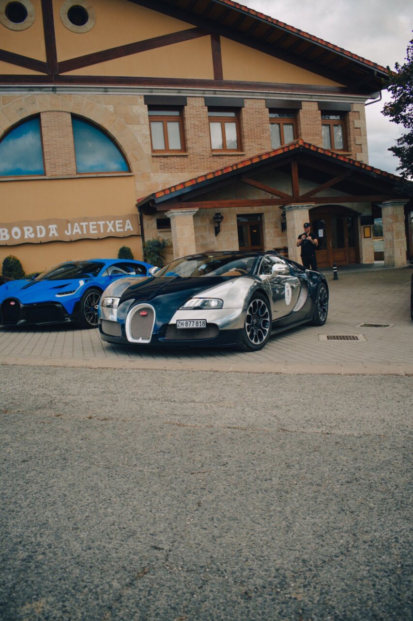 Esta imagen muestra un elegante automóvil Bugatti negro, resaltando su diseño aerodinámico y moderno. El coche está estacionado en un área verde, rodeado de árboles, lo que crea un contraste atractivo entre la máquina y la naturaleza. Ideal para los amantes de los automóviles de lujo.