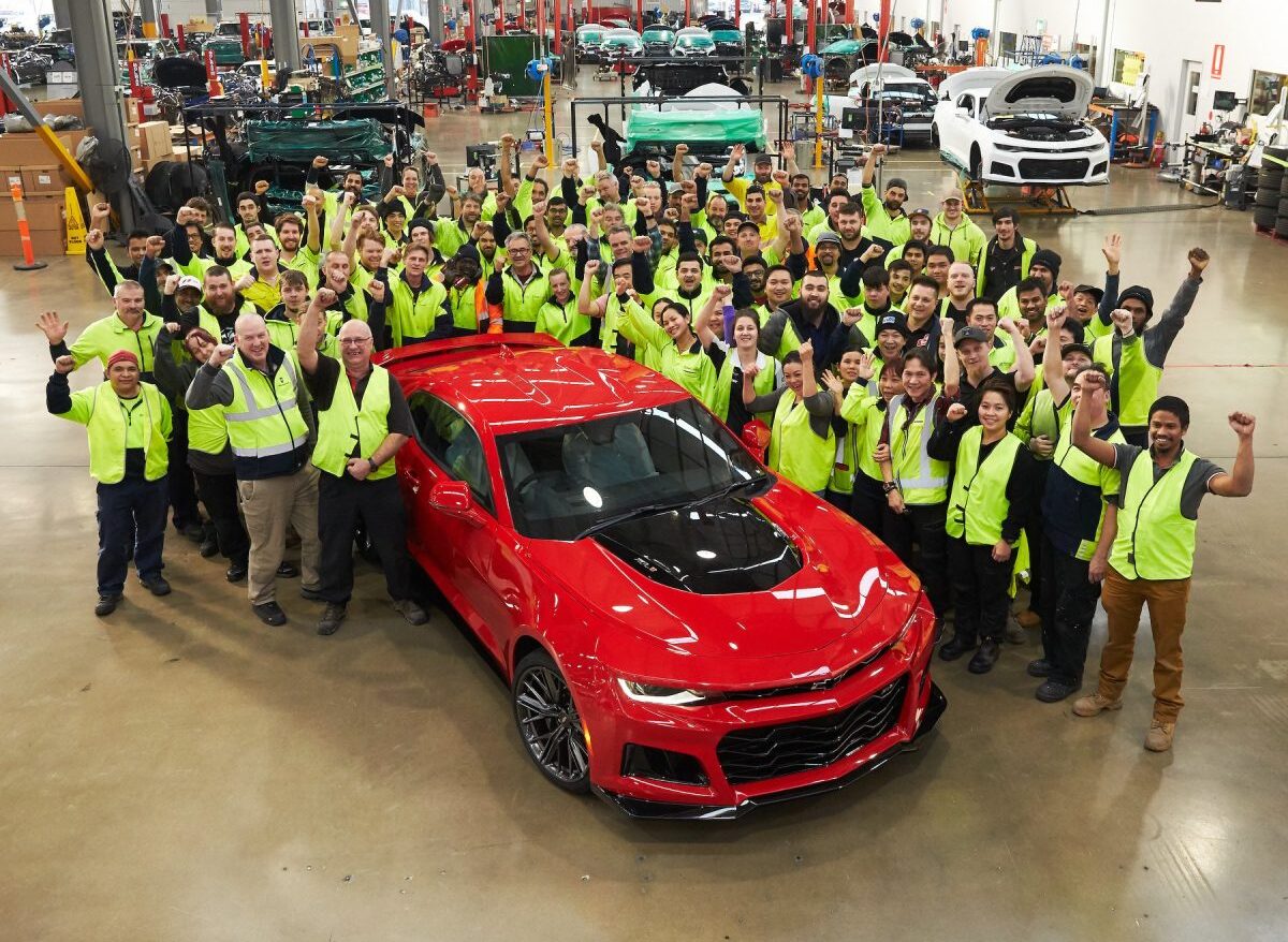 Trabajadores celebran la producción del nuevo Chevrolet Camaro en la fábrica.