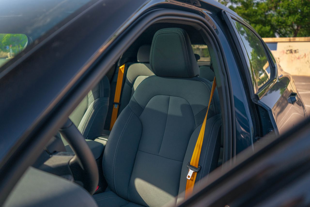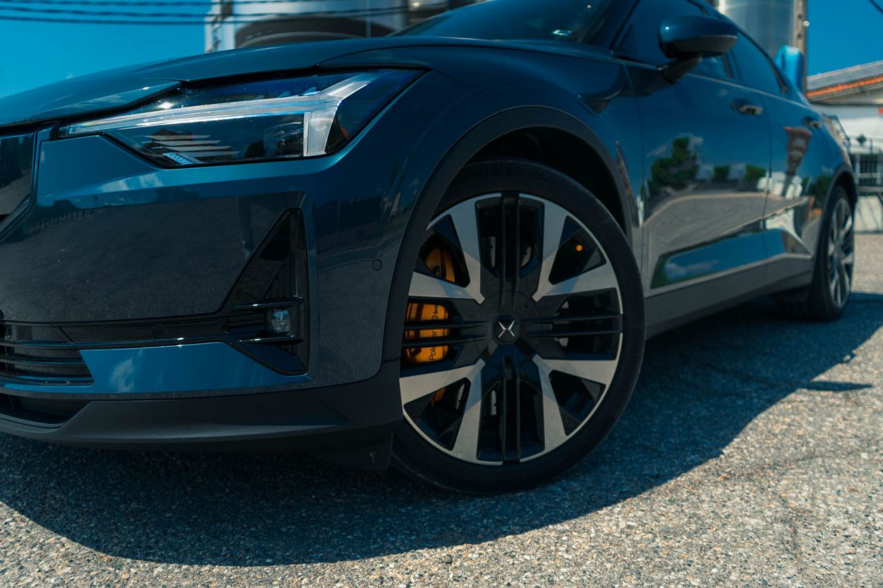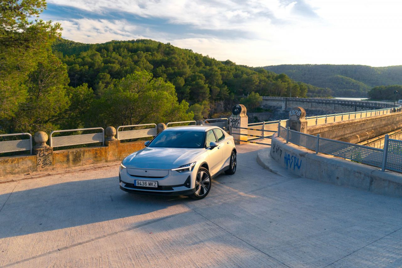 La imagen muestra un coche moderno estacionado en un camino de tierra rodeado de naturaleza. Al fondo, se puede ver una iglesia con un diseño arquitectónico notable, lo que añade un toque pintoresco a la escena. Este entorno combina la belleza del campo con la elegancia del vehículo.