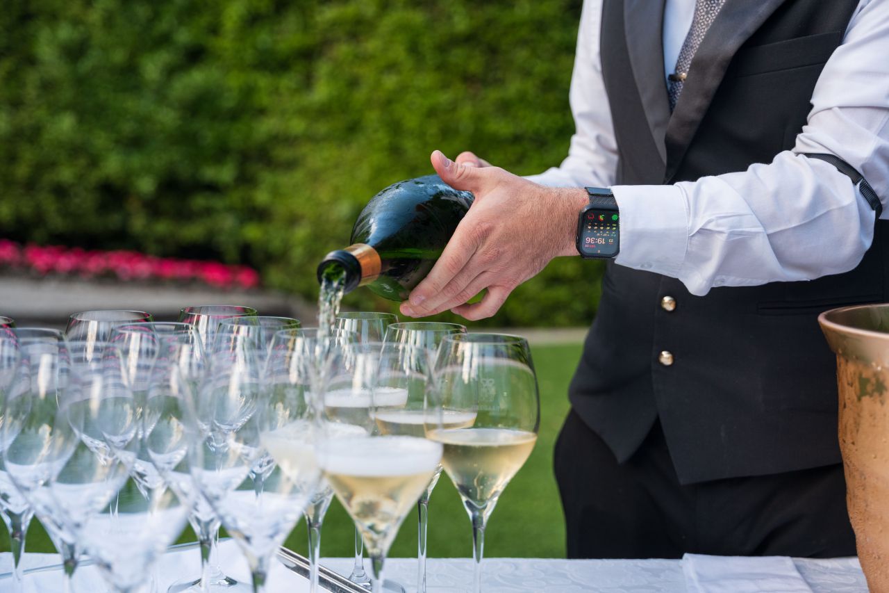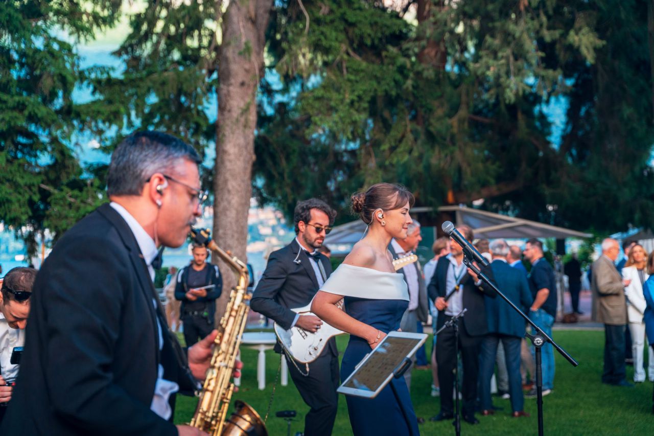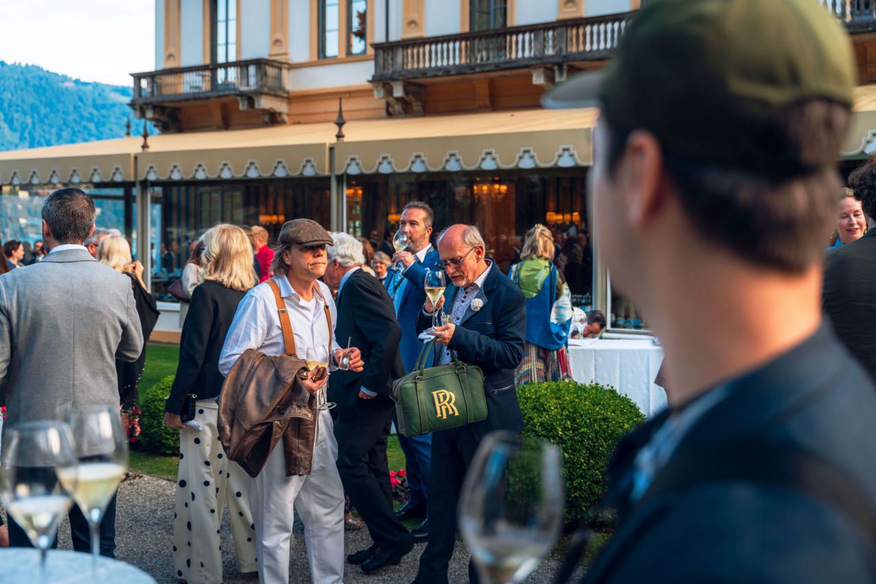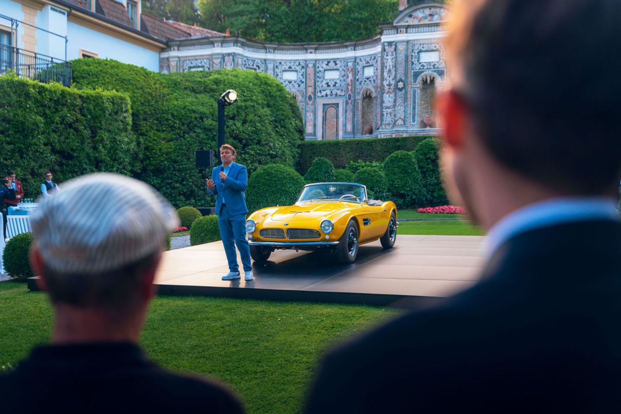 En un elegante evento al aire libre, un hombre presenta un impresionante coche deportivo amarillo. La escena está rodeada de un hermoso jardín, creando un ambiente sofisticado. Los asistentes observan atentamente mientras se destaca la belleza del vehículo y la habilidad del presentador.