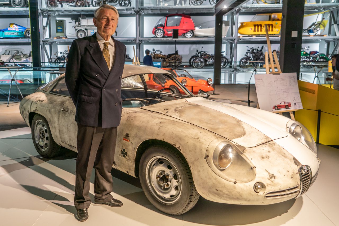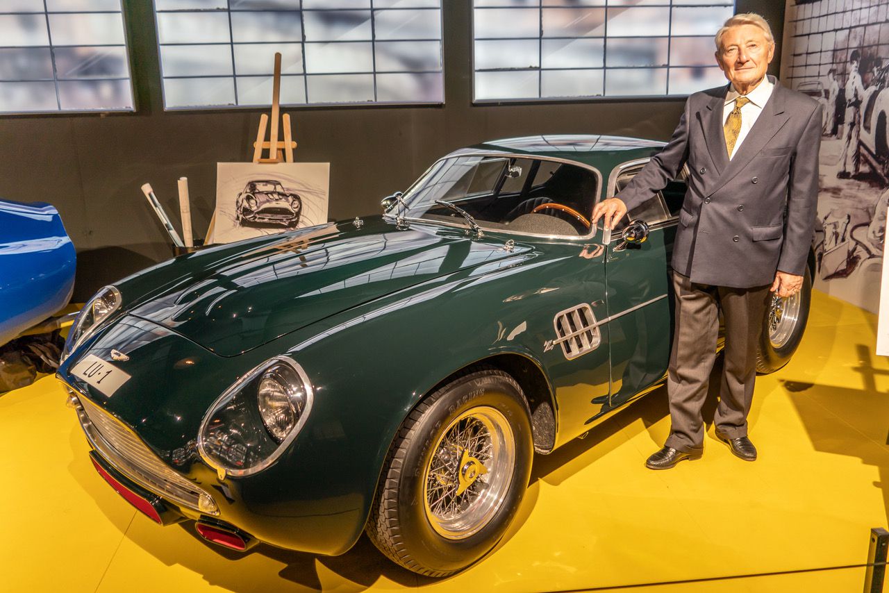 La imagen muestra a un hombre posando junto a un automóvil clásico, resaltando su diseño elegante y detalles únicos. La exposición presenta una variedad de vehículos, destacando la belleza de la ingeniería automotriz. El ambiente es luminoso y acogedor, ideal para los amantes de los coches.