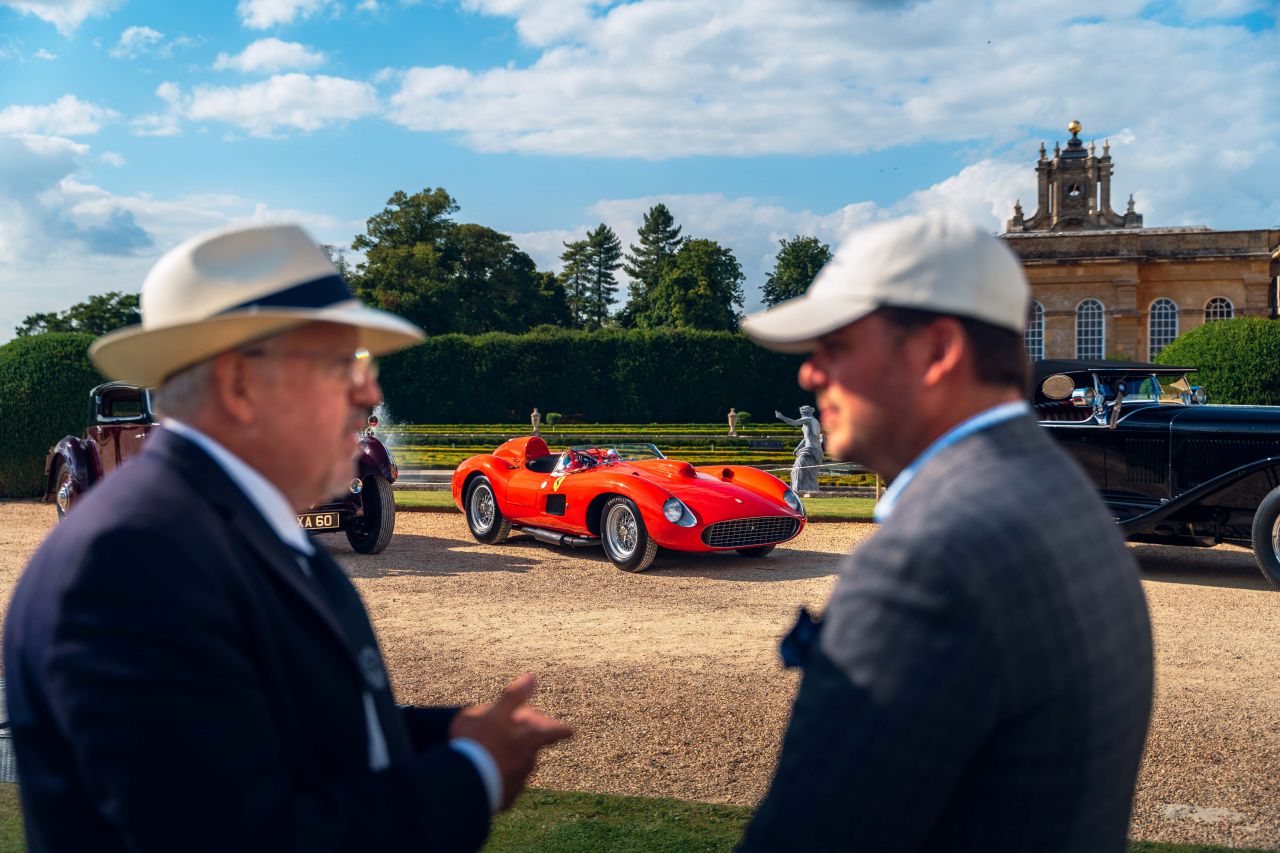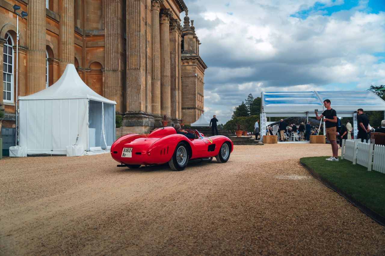 En esta imagen, un coche deportivo rojo destaca en un evento al aire libre, rodeado de un ambiente elegante. Se puede ver una carpa blanca y varias personas disfrutando del evento. El coche es un símbolo de lujo y velocidad, atrayendo la atención de los asistentes.