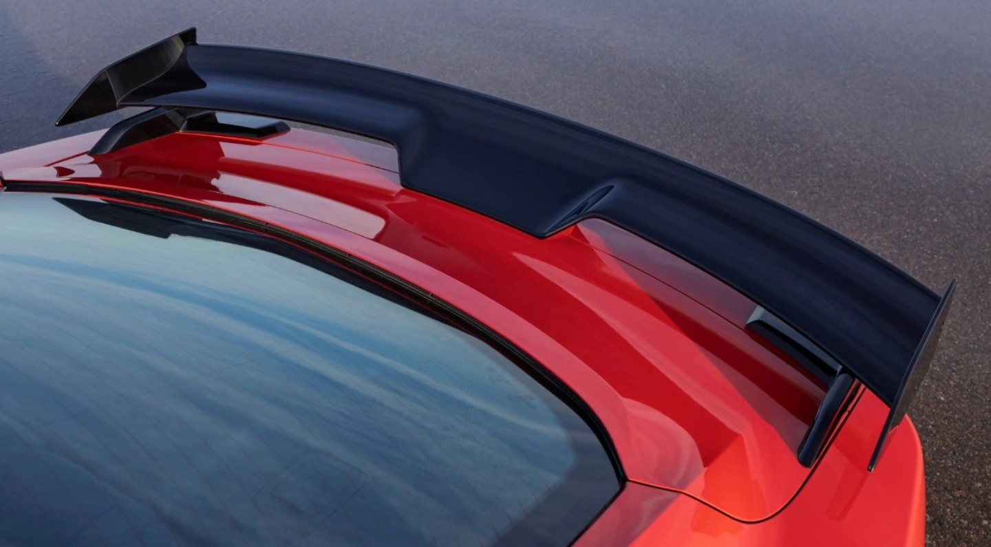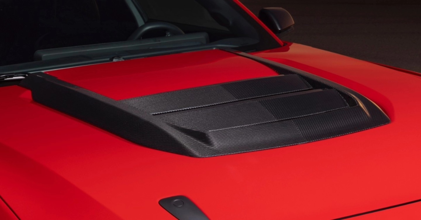 Impresionante vista del capó del Ford Mustang Dark Horse SC en un vibrante color rojo.