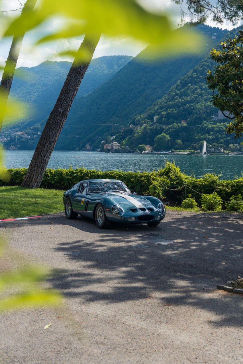 Esta imagen muestra un elegante coche deportivo azul aparcado en un entorno natural impresionante. Al fondo, se pueden ver montañas verdes y un lago sereno, creando una atmósfera perfecta para los amantes de los automóviles y la naturaleza. La combinación del coche y el paisaje resalta la belleza del diseño automotriz en un entorno idílico.
