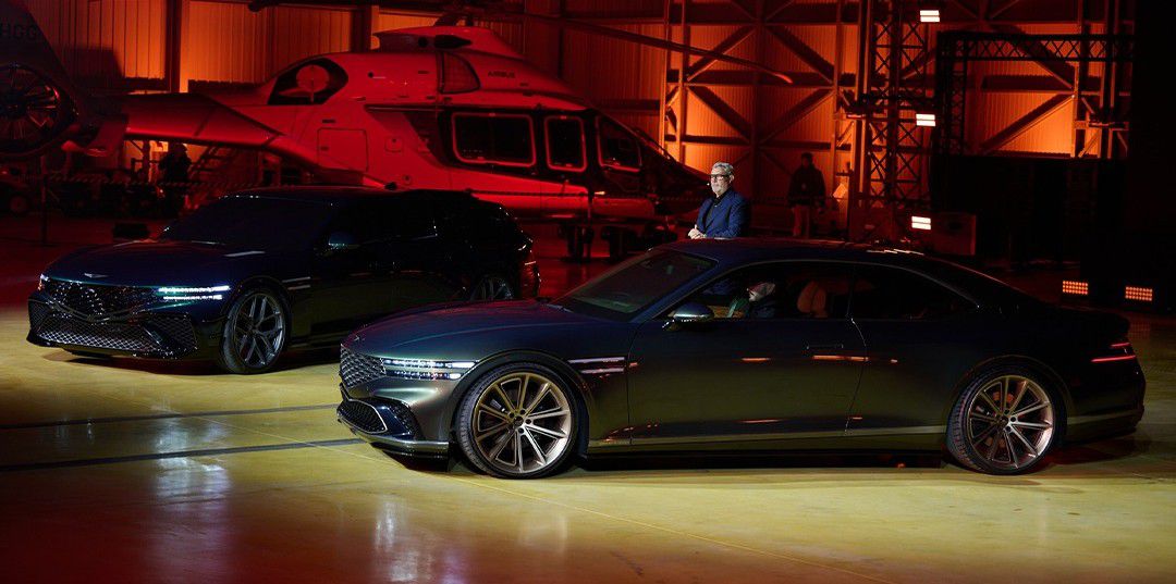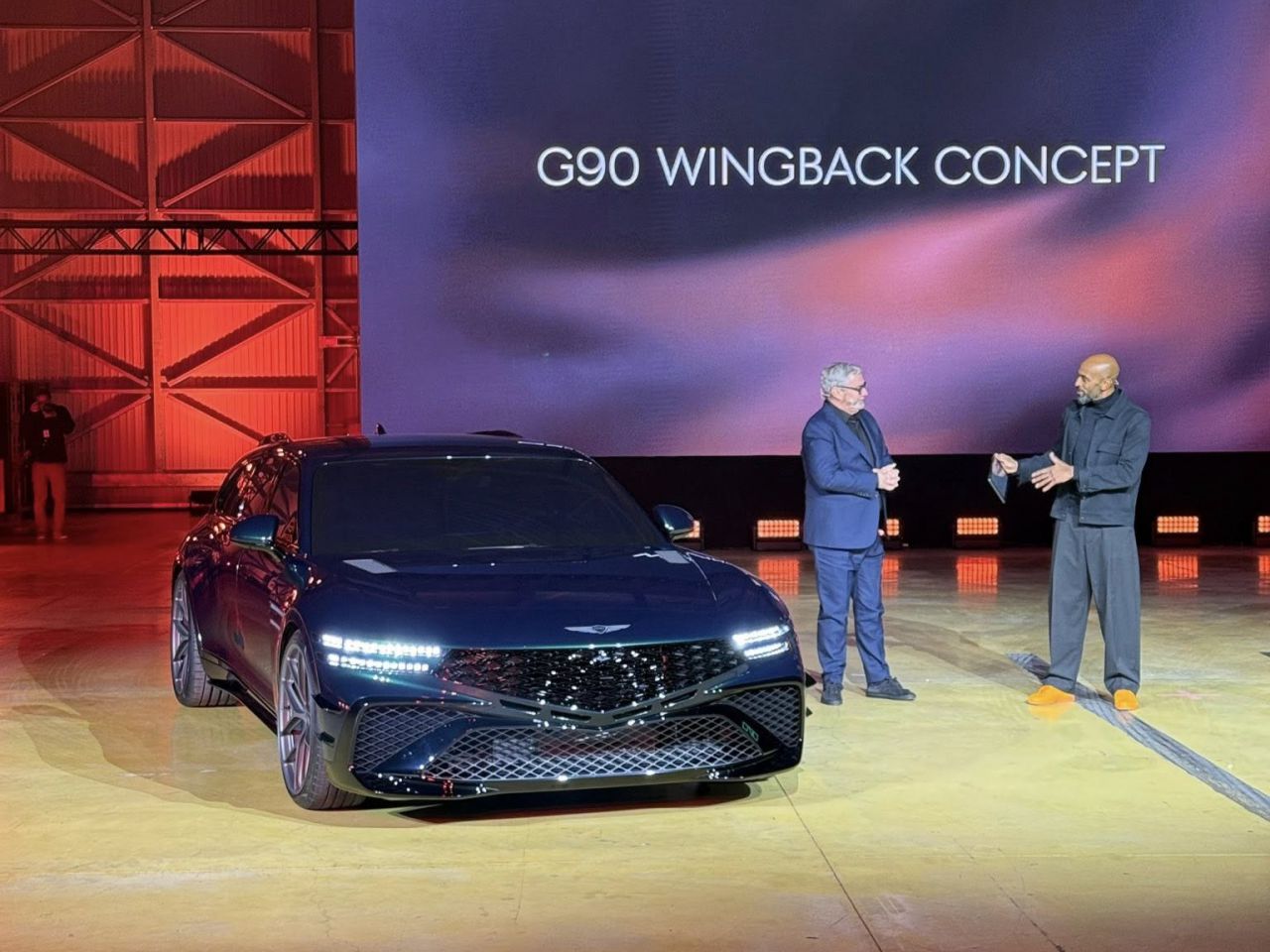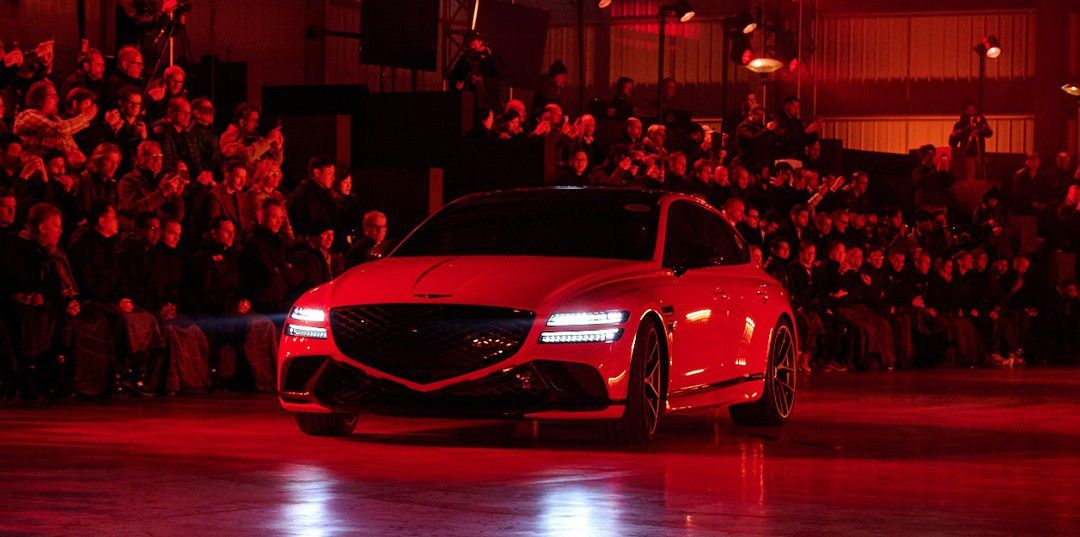 En esta imagen se puede ver el G80 Magma Special, un coche de alto rendimiento, destacado en un evento de lanzamiento. La presentación se llevó a cabo en un entorno iluminado con tonos cálidos, resaltando el diseño del vehículo. Junto al coche, se observa a un presentador interactuando con el público.