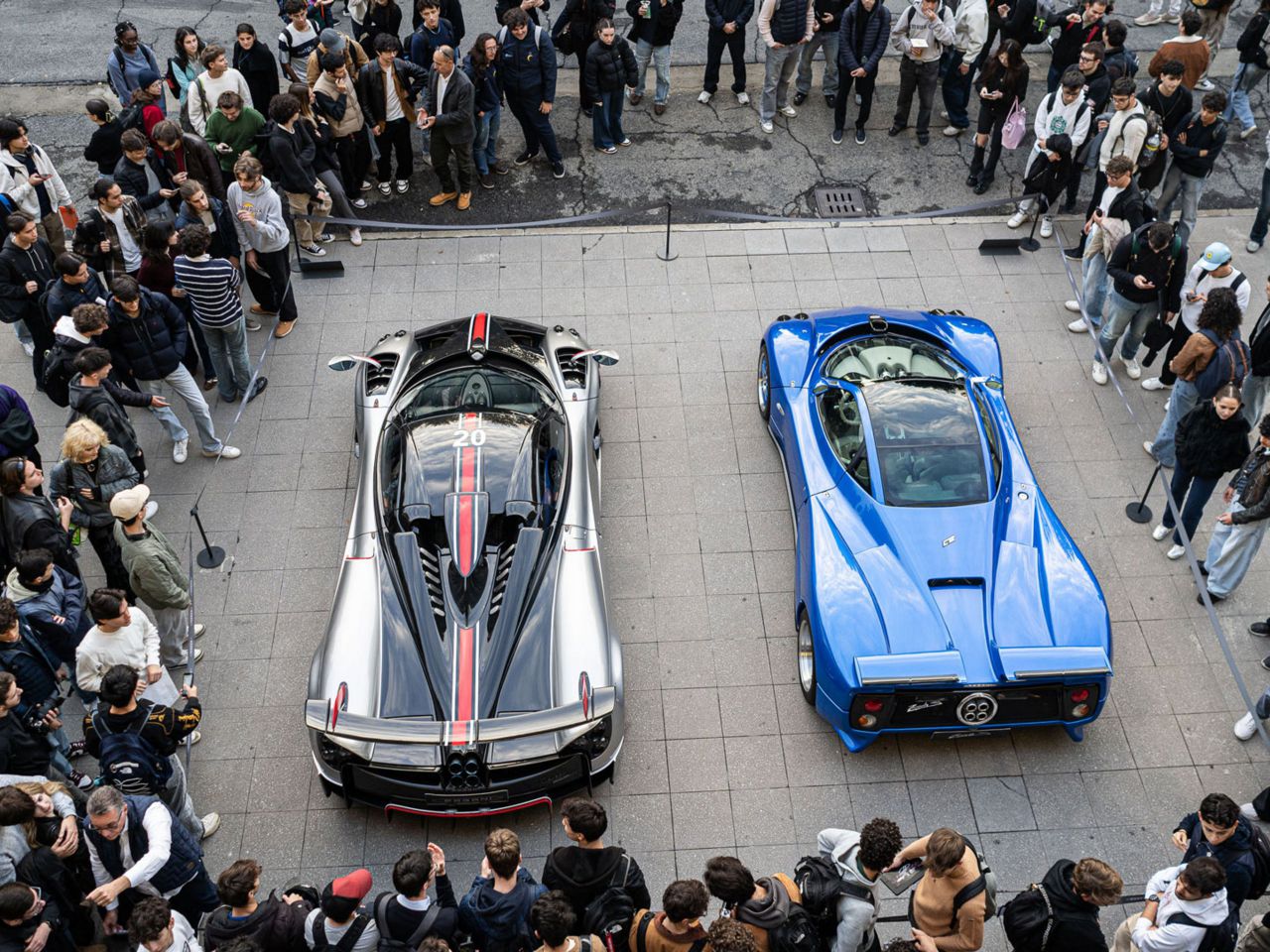 En esta imagen se pueden ver dos coches Pagani, uno azul y otro plateado, en una exhibición. El evento ha reunido a numerosos aficionados que observan y fotografían los vehículos. La atmósfera es vibrante y llena de emoción por la pasión automovilística.