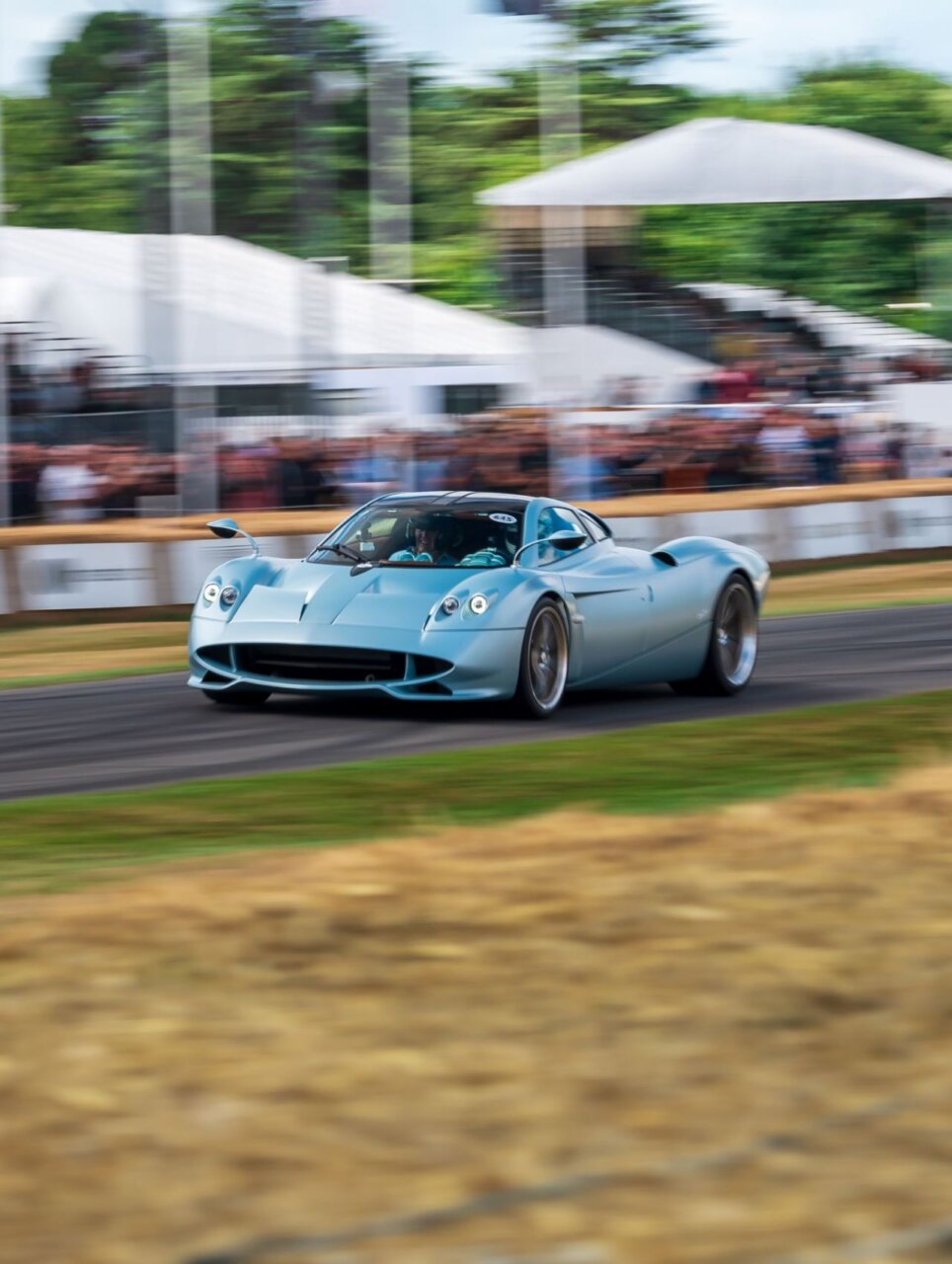 El Pagani Zonda, un superdeportivo icónico, se presenta en el evento de Goodwood. Con su diseño aerodinámico y motor potente, este coche atrae la atención de los entusiastas del automovilismo. La imagen captura la velocidad y la emoción del evento, destacando la belleza del Zonda en acción.