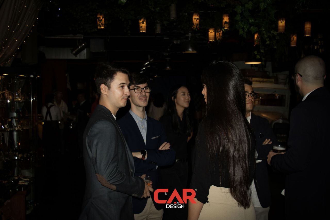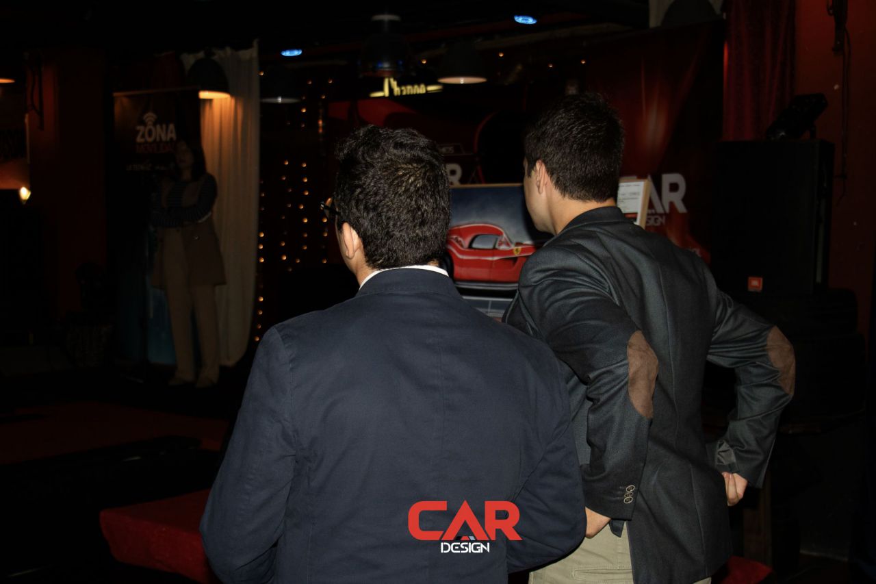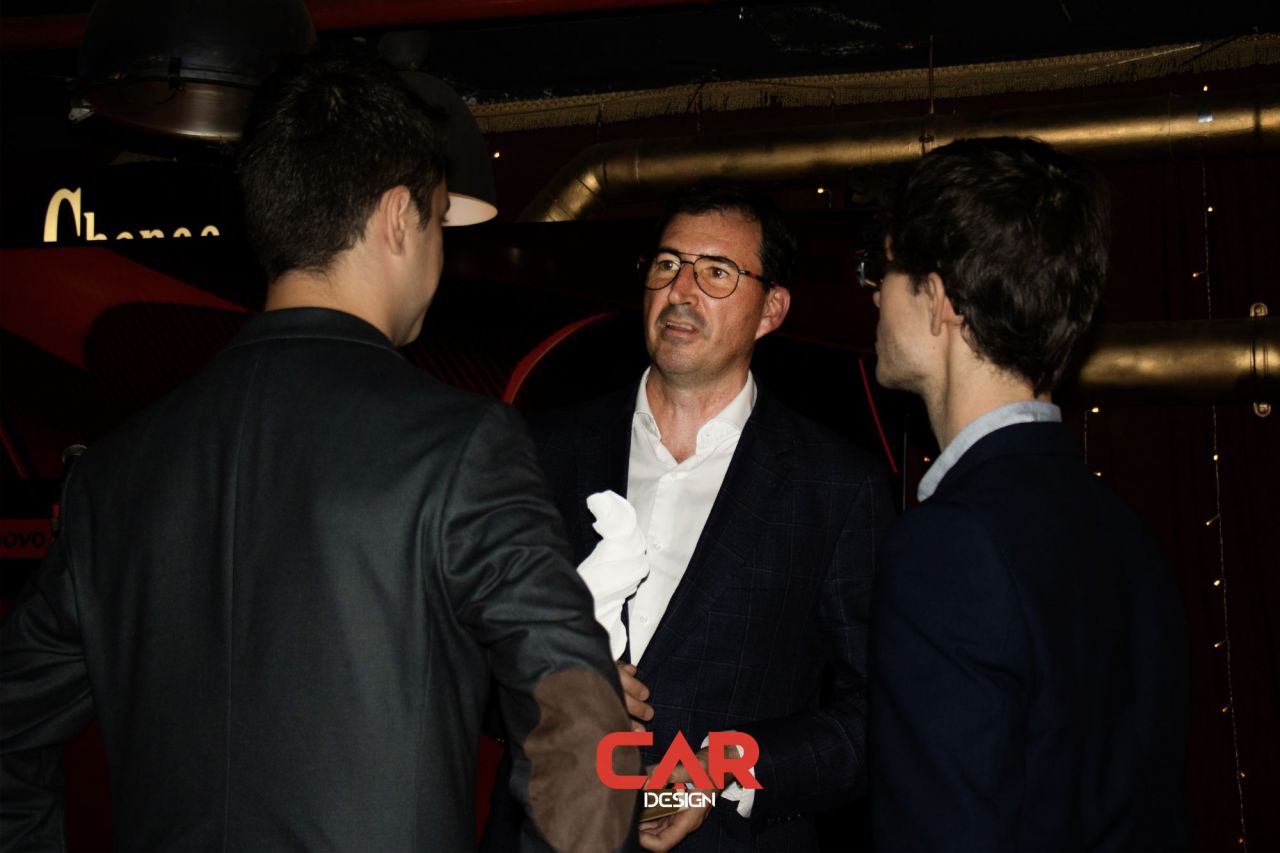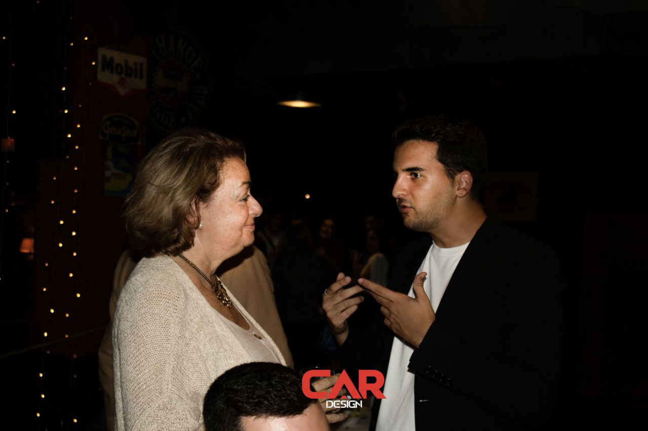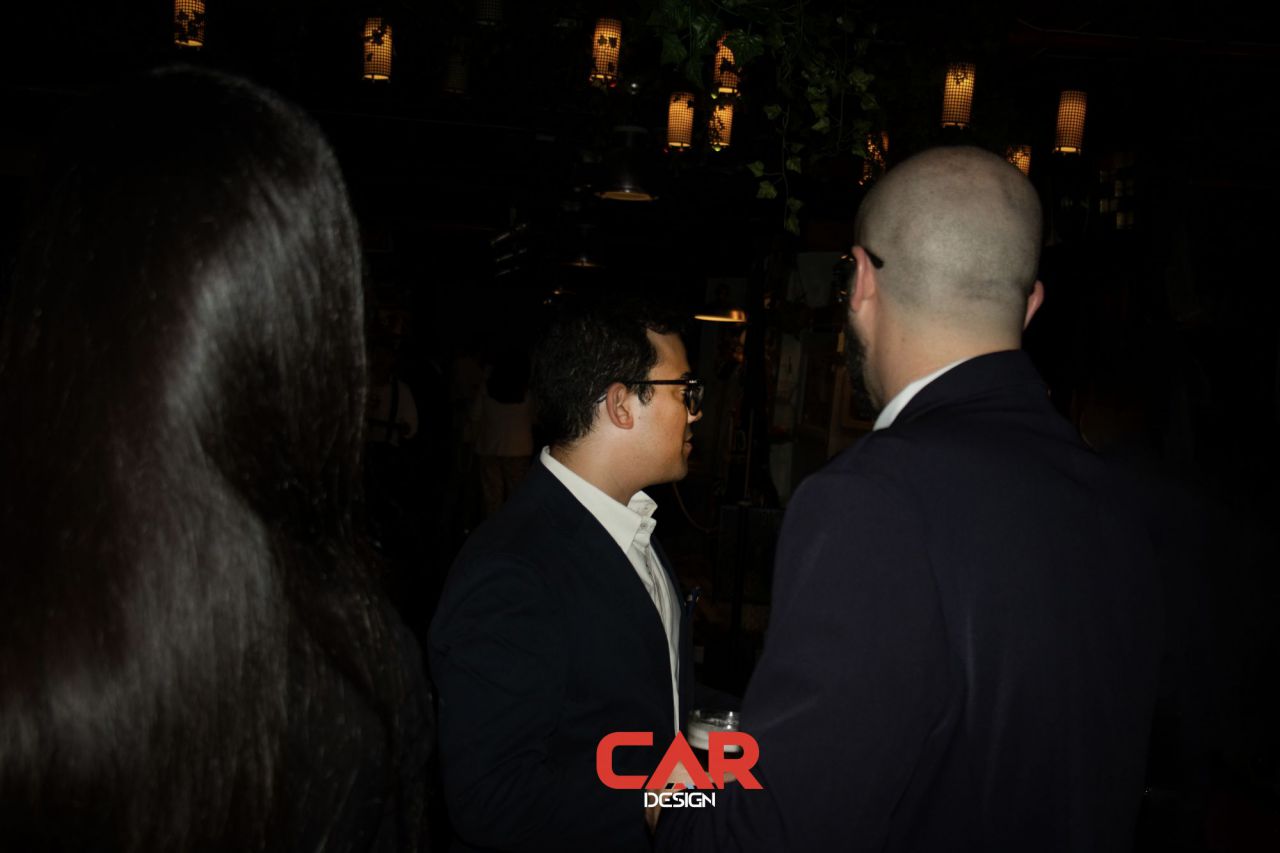 En este evento de Car Design, dos hombres se destacan en primer plano, mostrando una actitud amigable. El fondo está decorado con logotipos de marcas reconocidas, creando un ambiente vibrante y profesional. Esta imagen captura la esencia de un evento de networking en la industria del diseño automotriz.