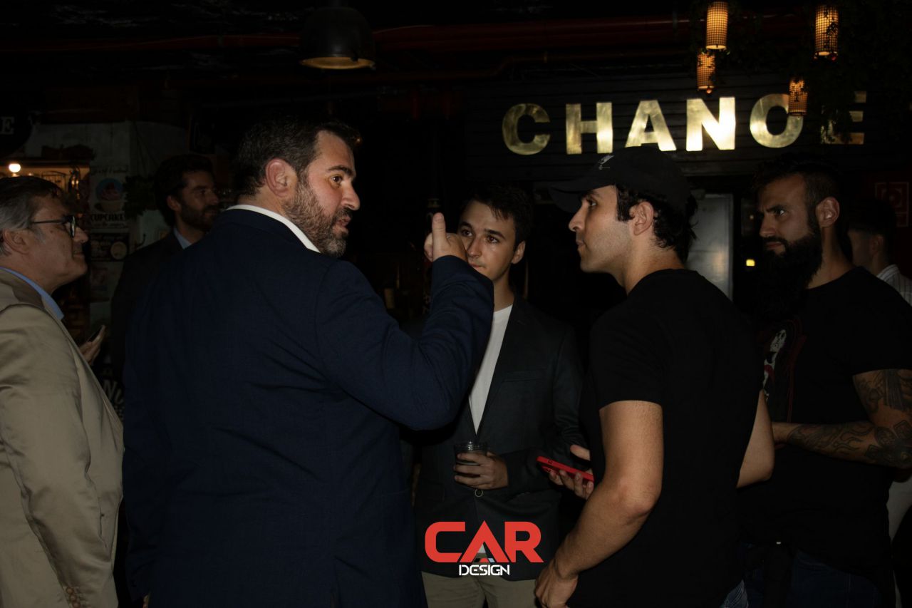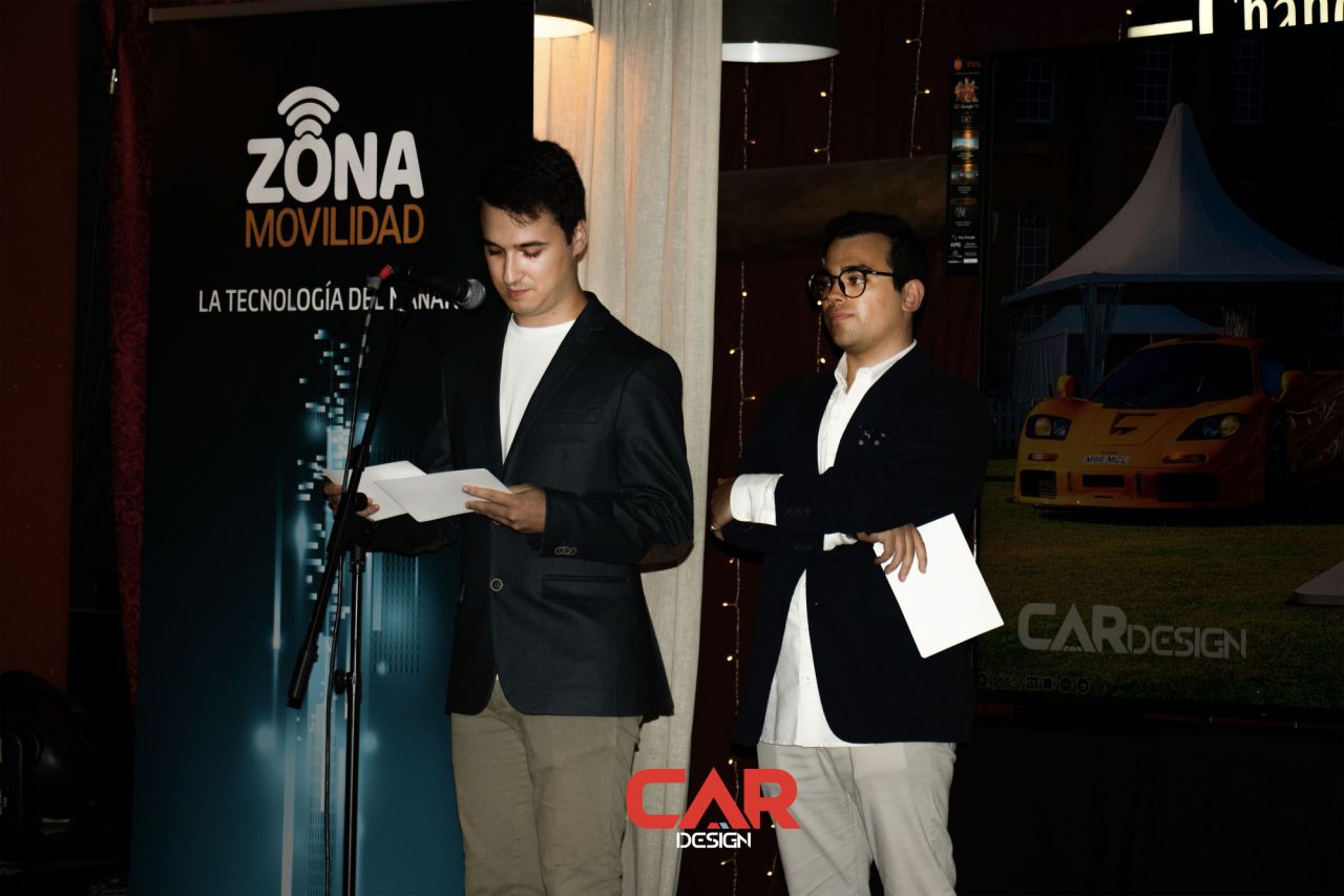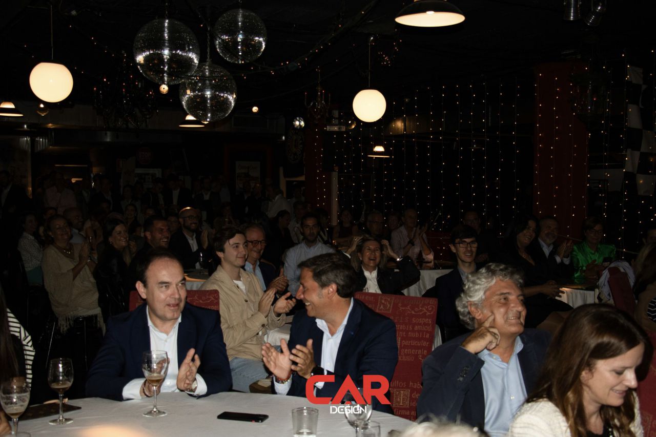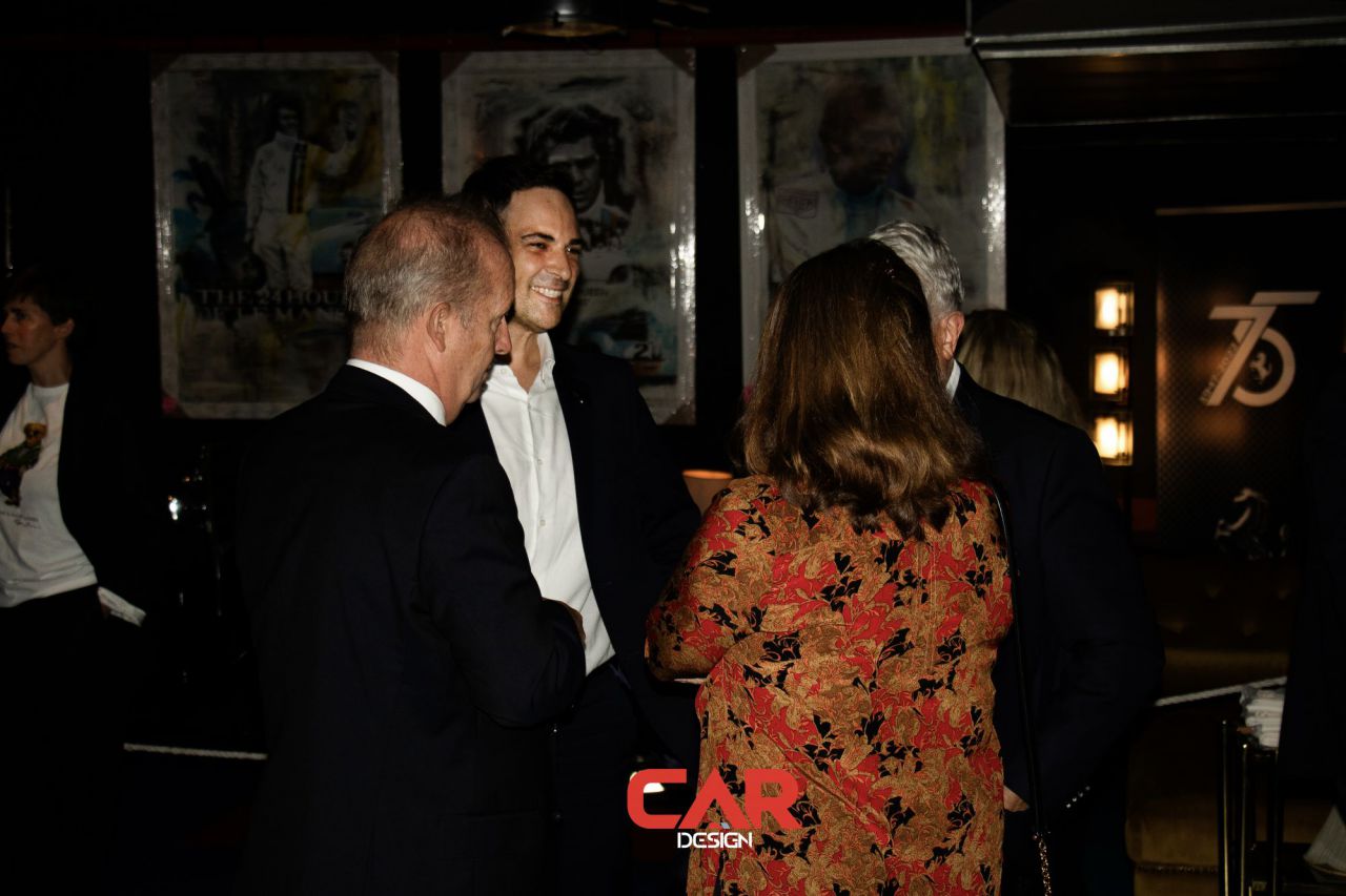 En este evento de Car Design, dos hombres se destacan en primer plano, mostrando una actitud amigable. El fondo está decorado con logotipos de marcas reconocidas, creando un ambiente vibrante y profesional. Esta imagen captura la esencia de un evento de networking en la industria del diseño automotriz.