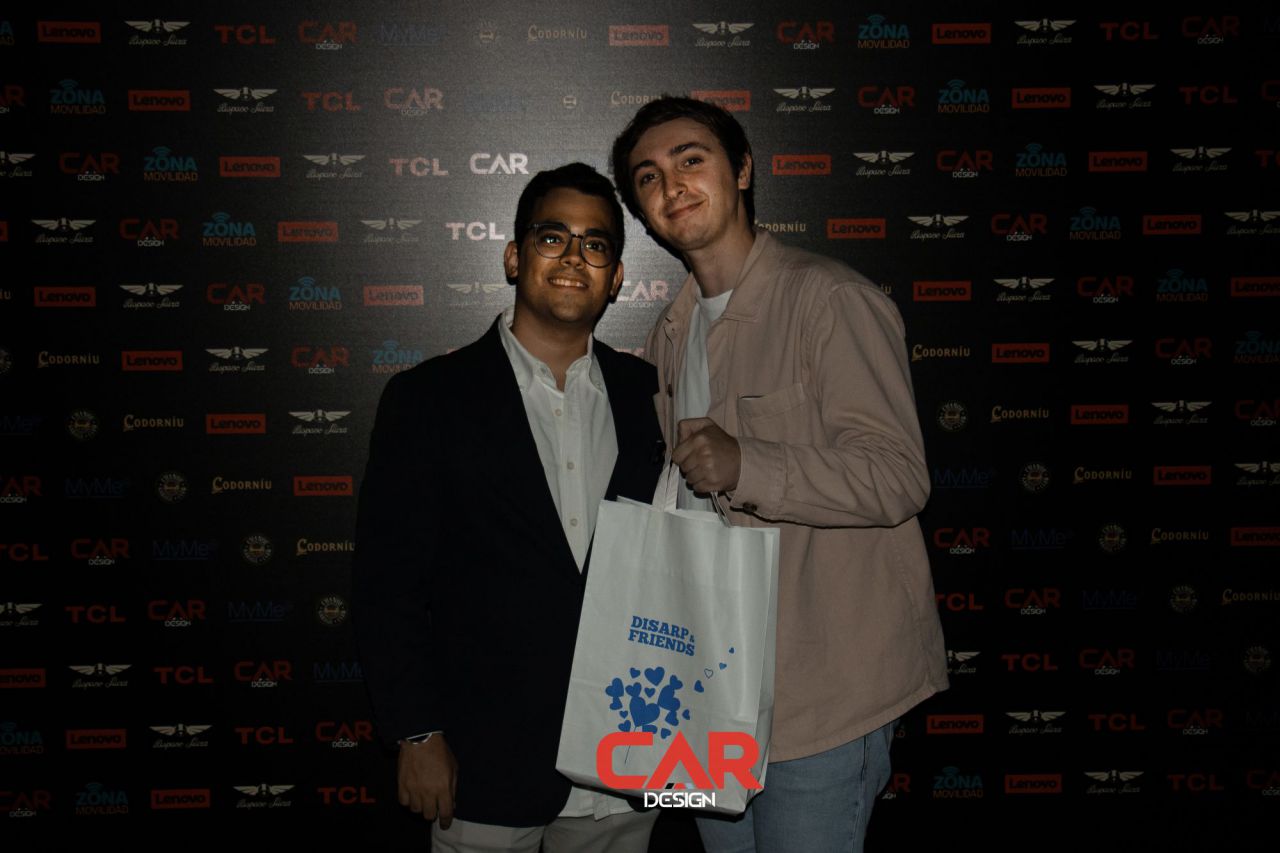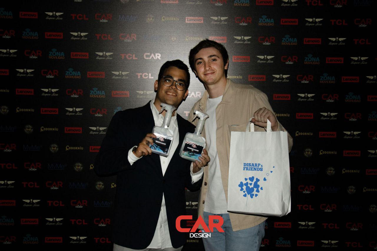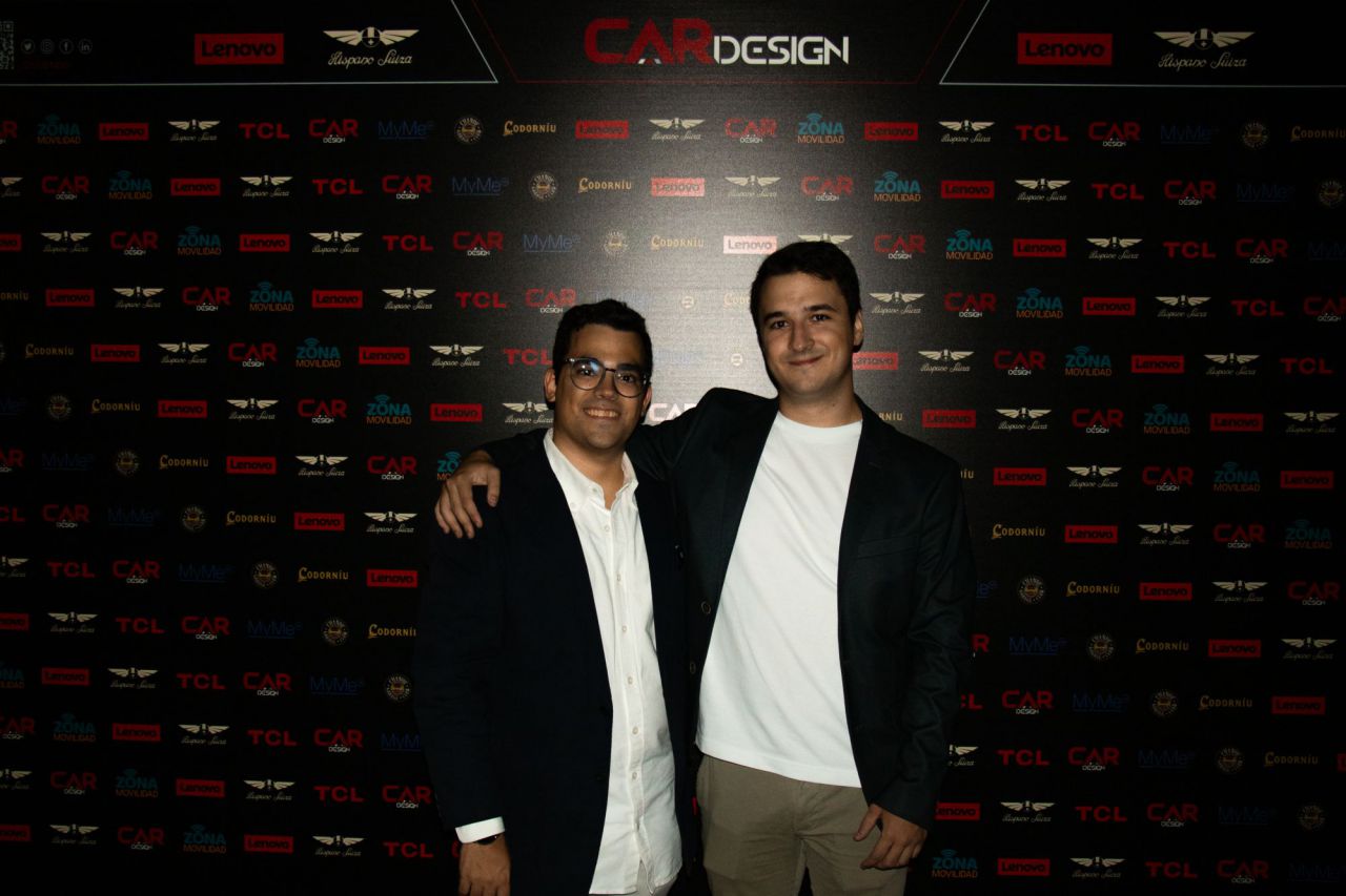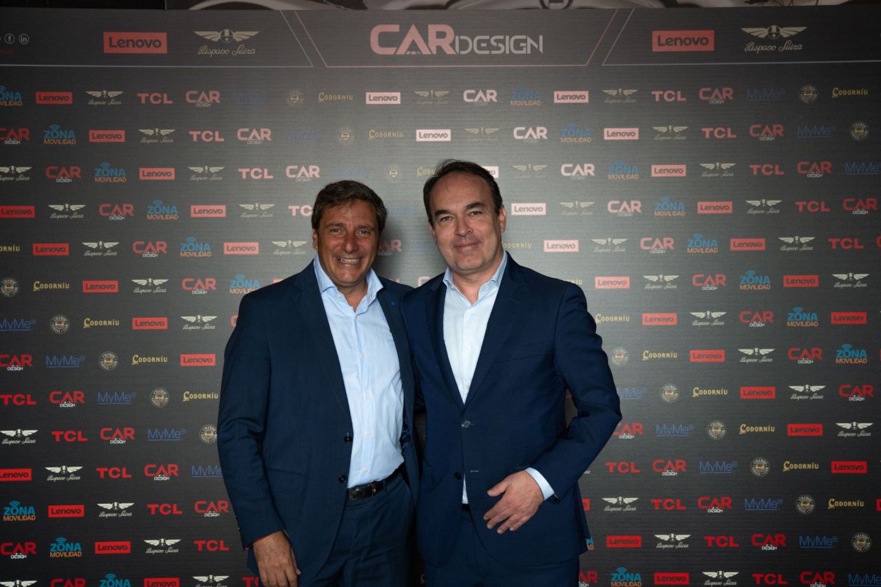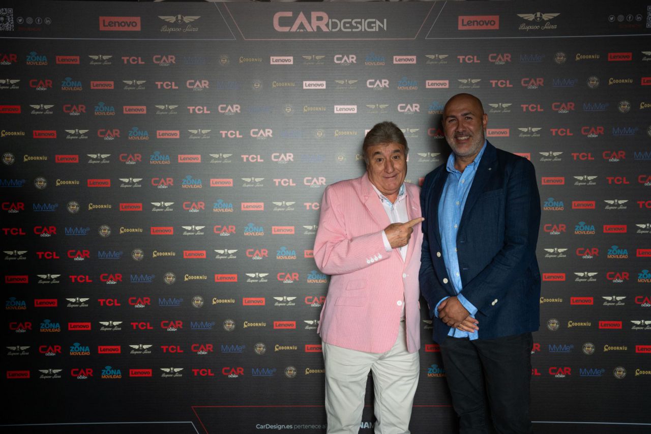 Dos hombres sonrientes posan en un evento de Car Design. El fondo está lleno de logotipos de marcas.