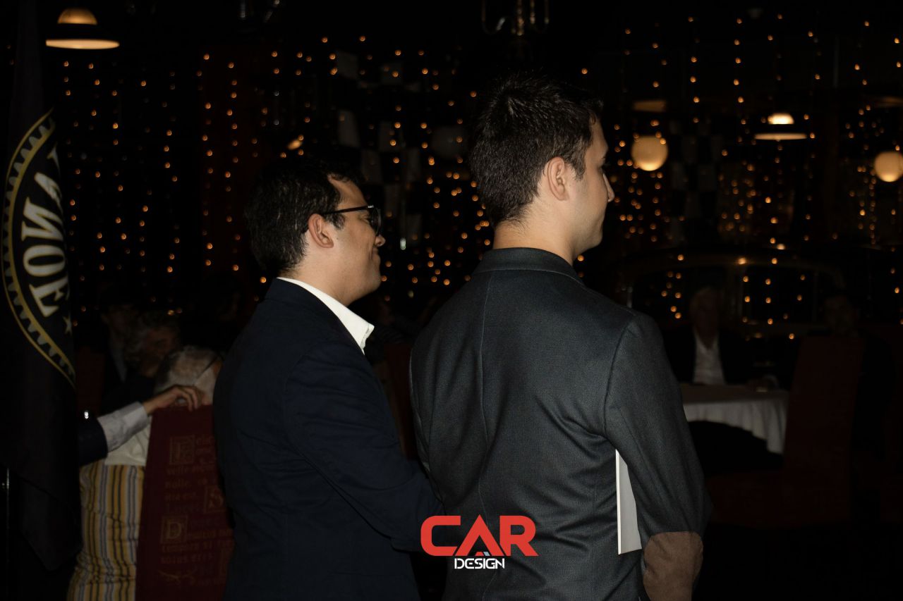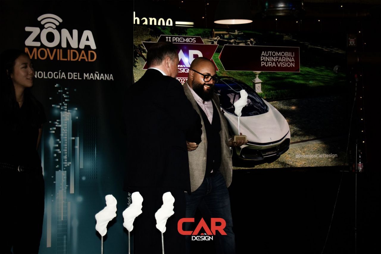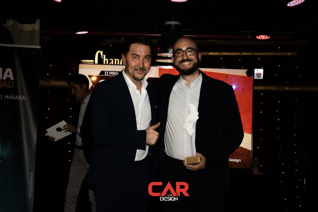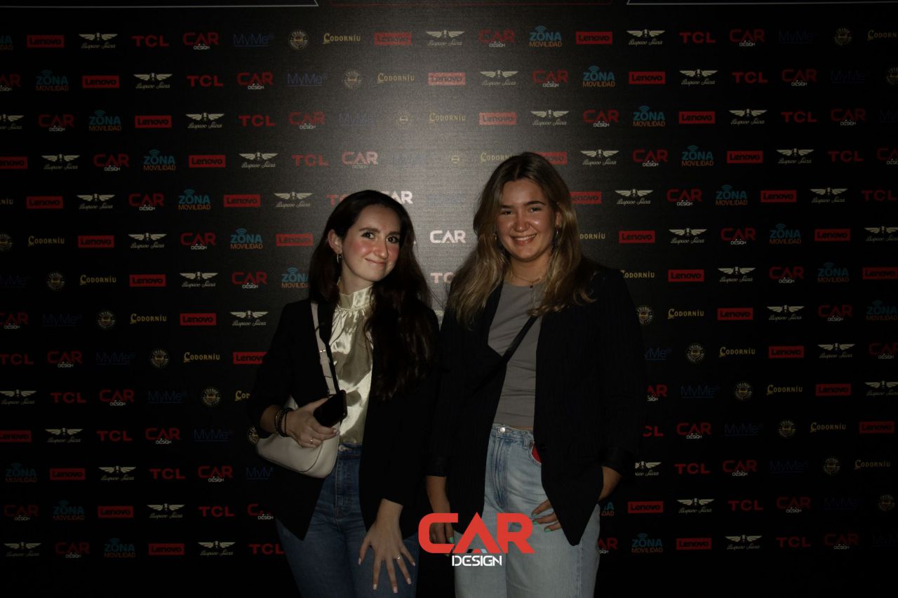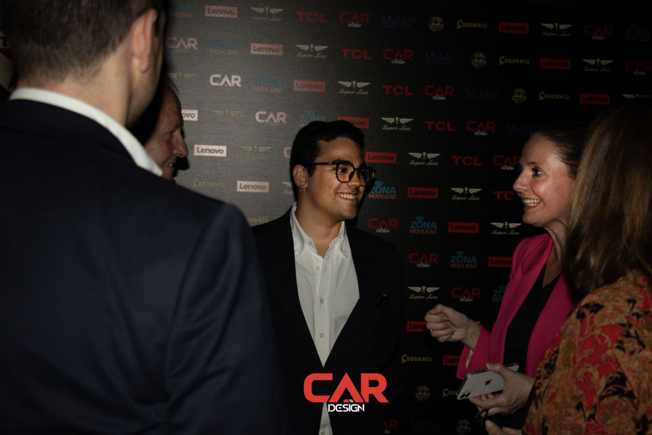 Dos hombres sonrientes posan en un evento de Car Design. El fondo está lleno de logotipos de marcas.