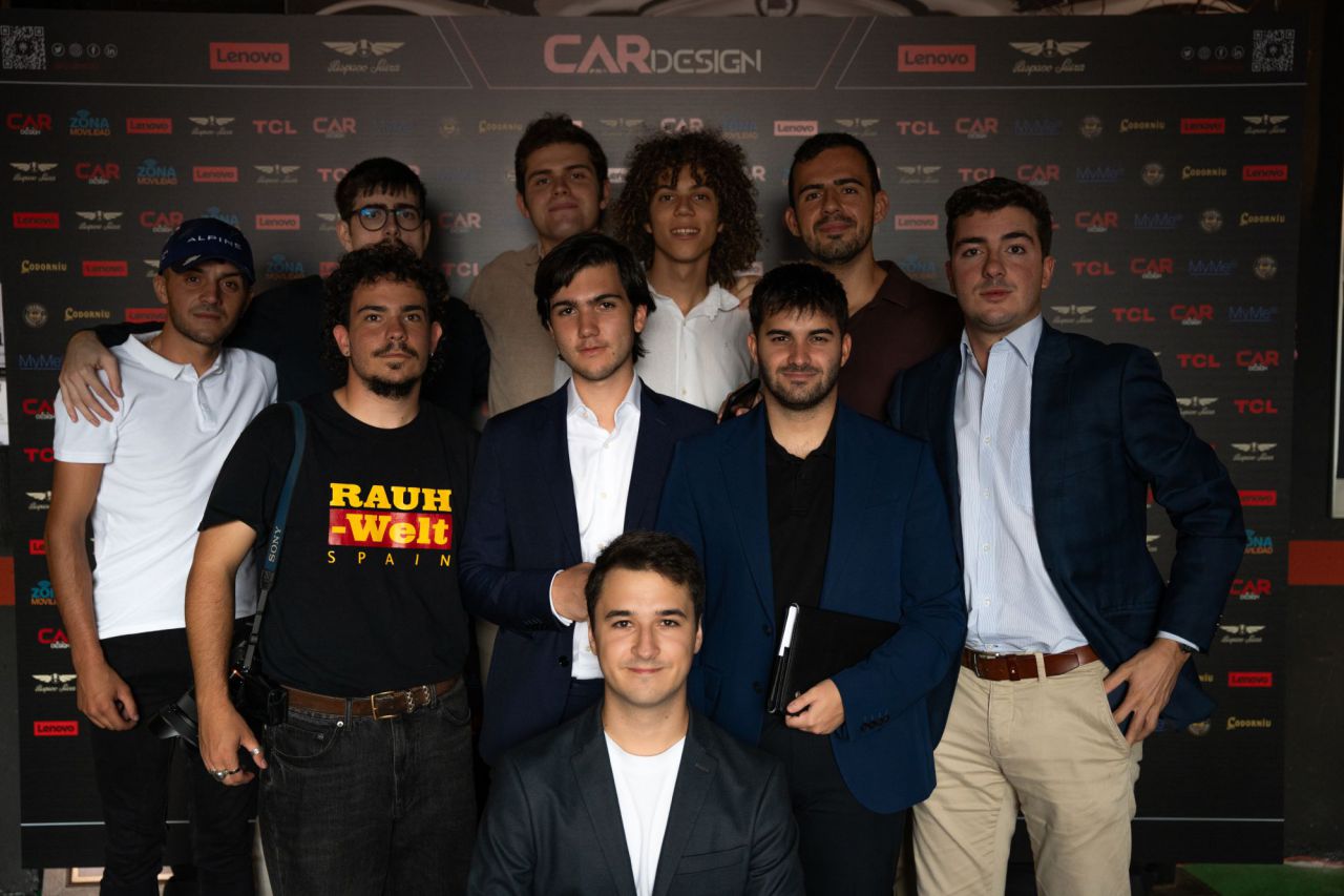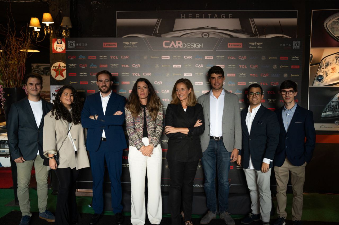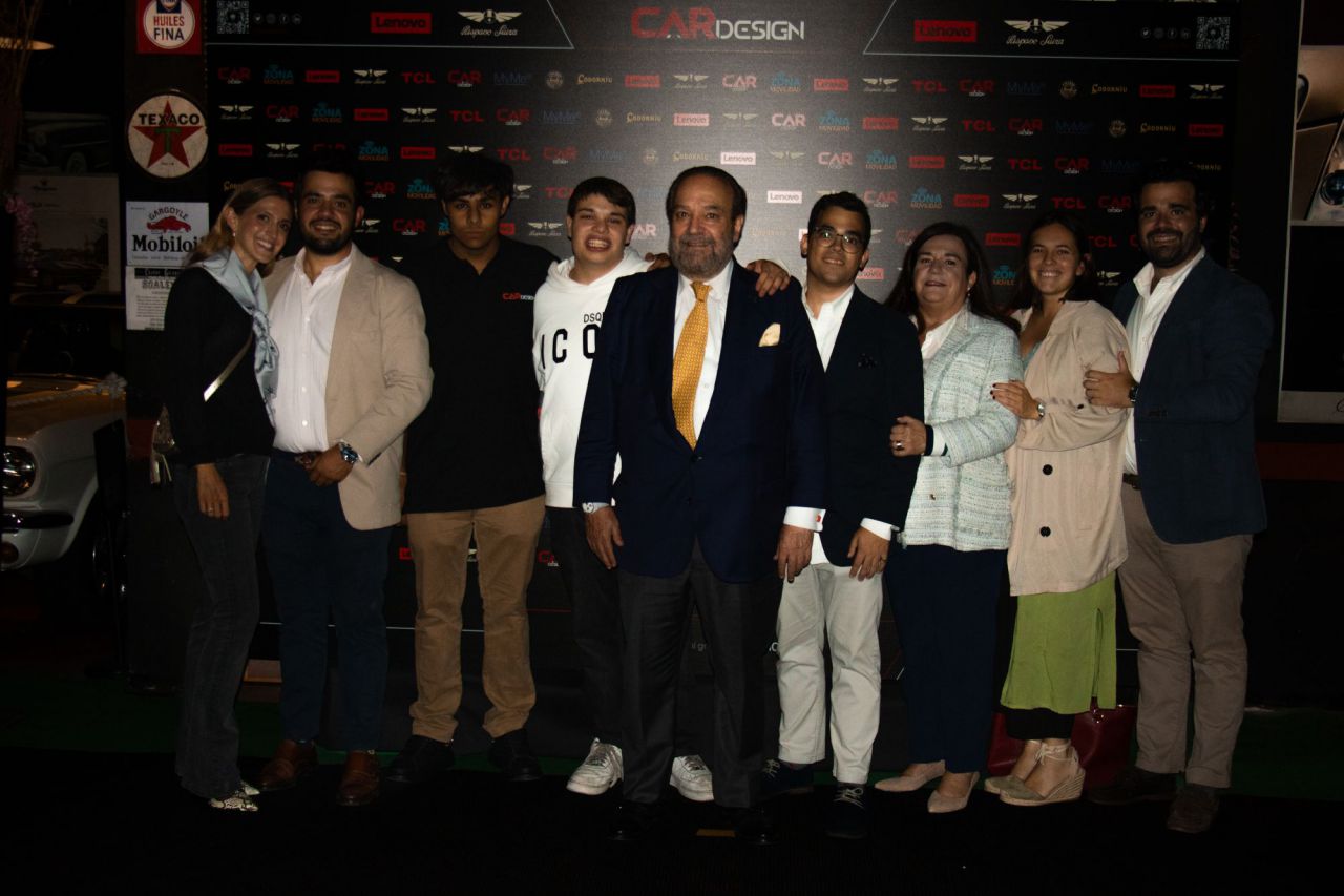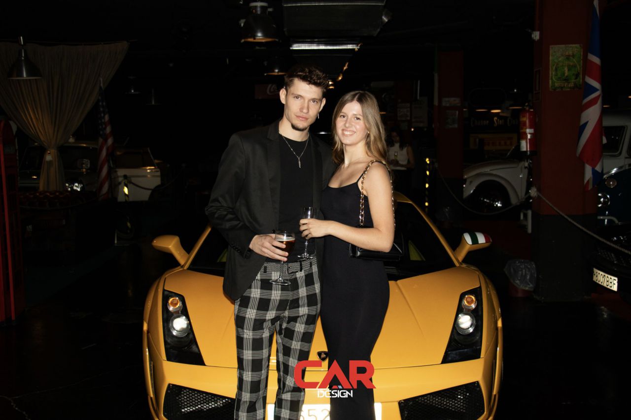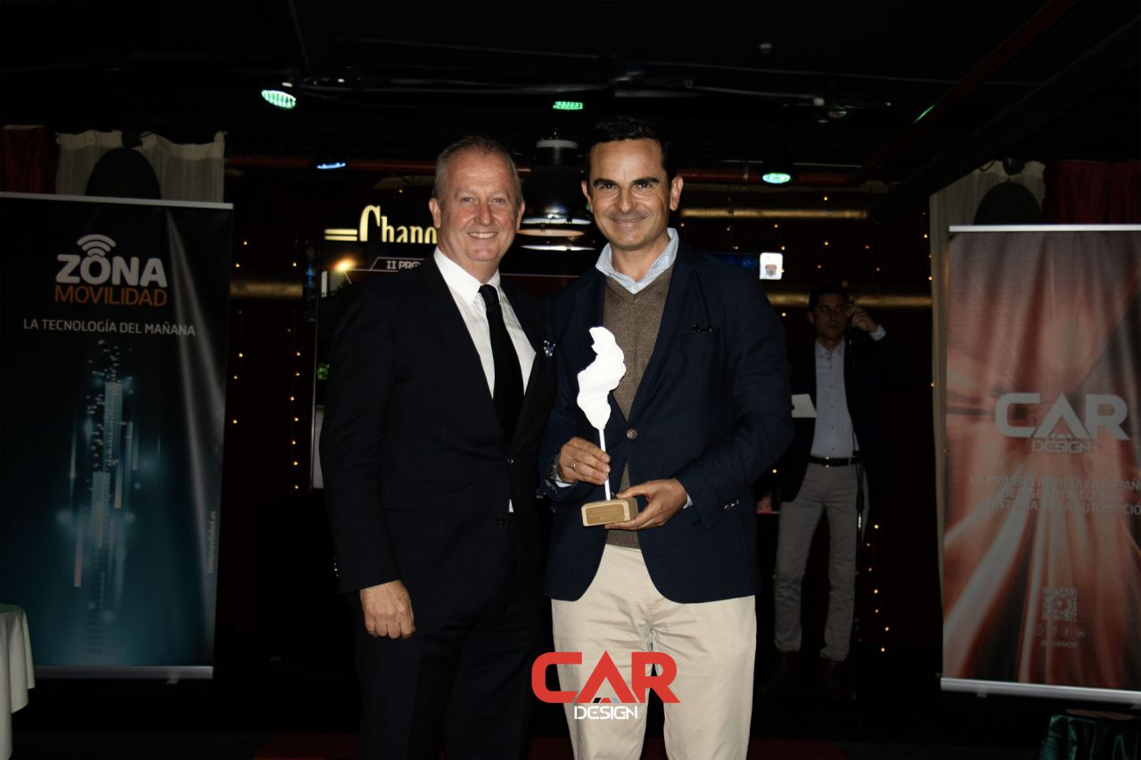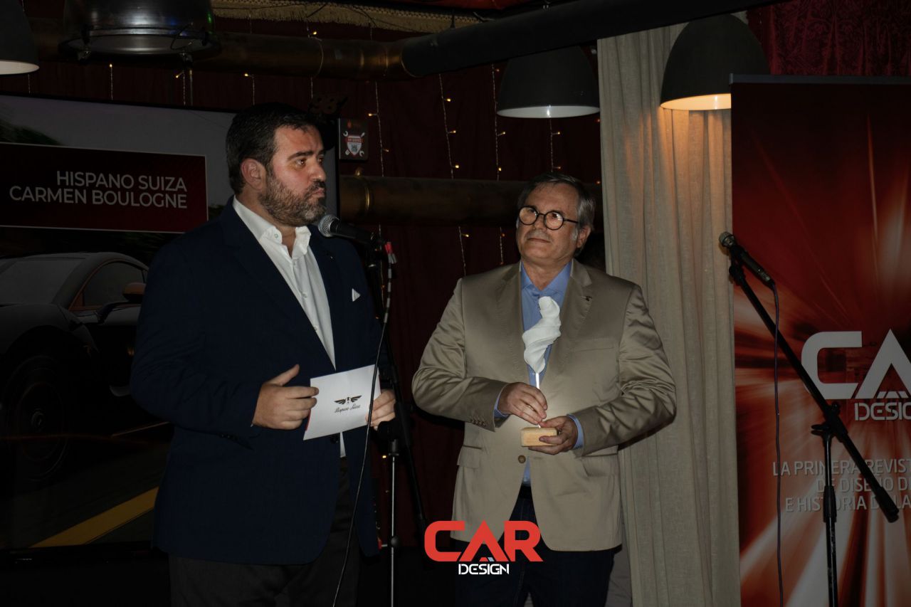 Dos hombres sonrientes posan en un evento de Car Design. El fondo está lleno de logotipos de marcas.