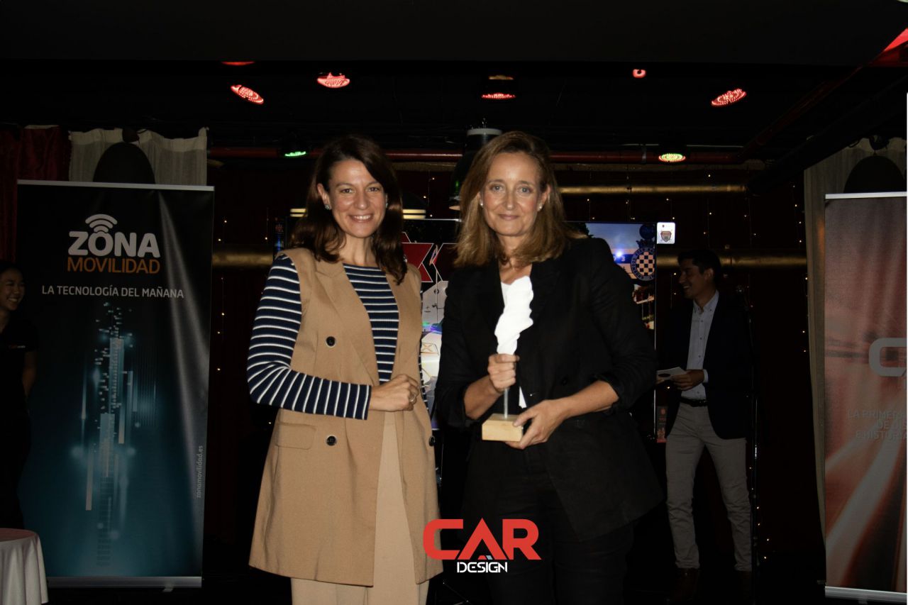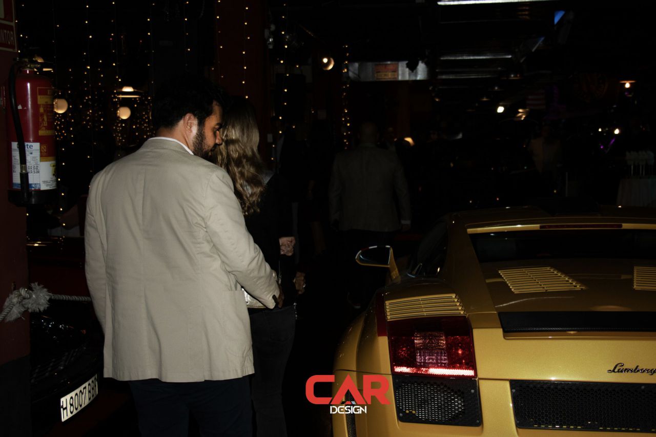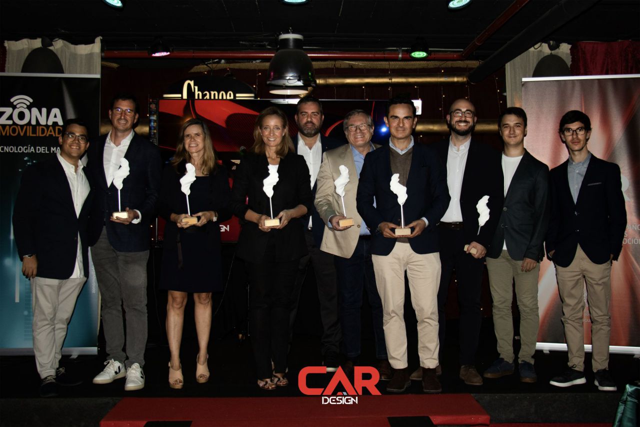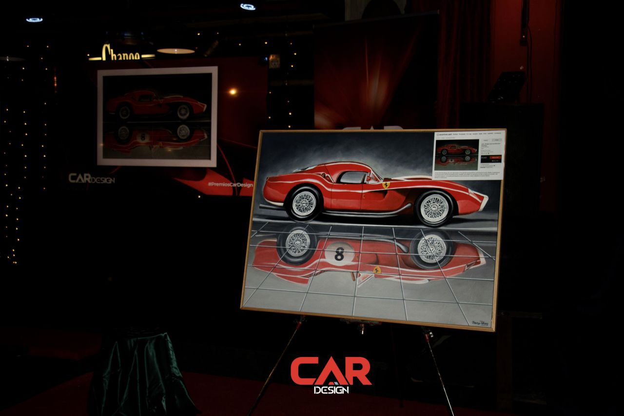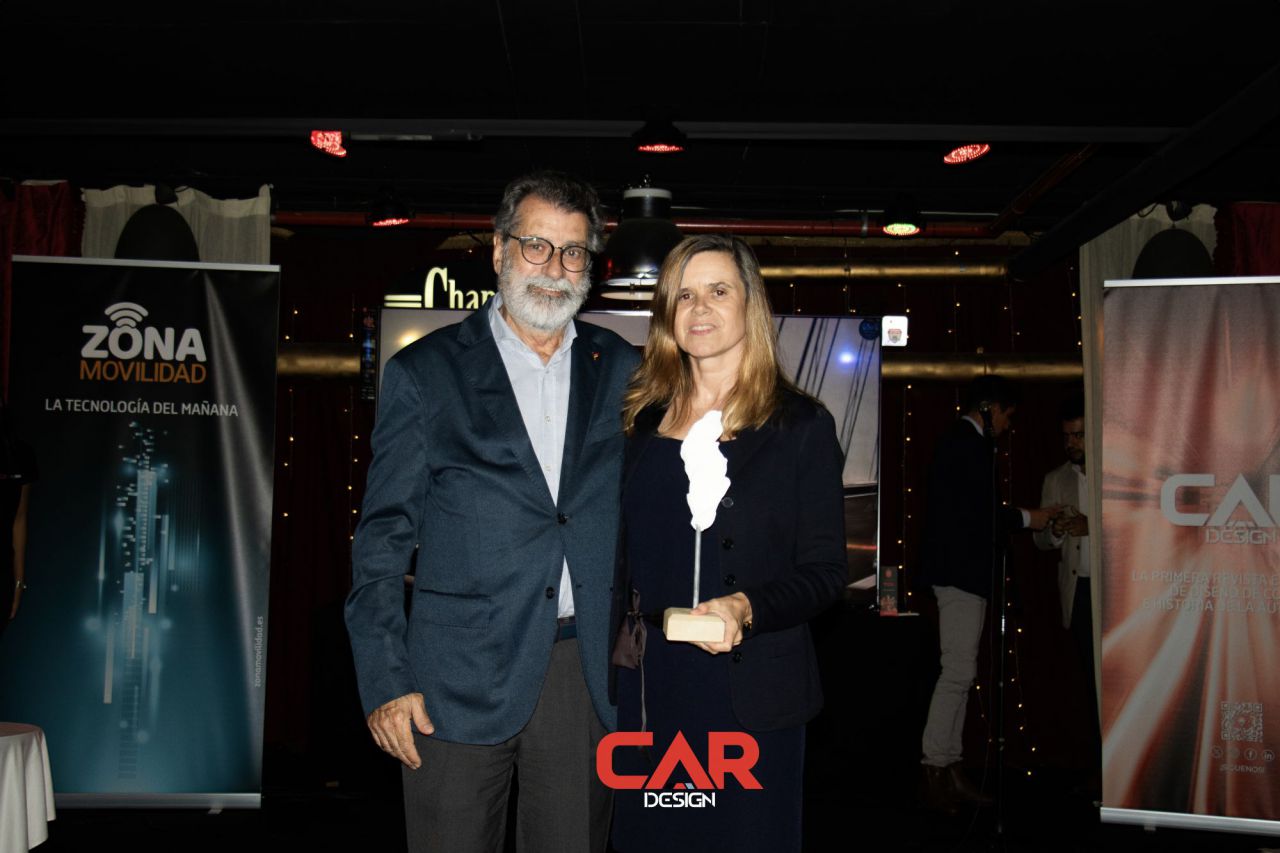 Dos hombres sonrientes posan en un evento de Car Design. El fondo está lleno de logotipos de marcas.