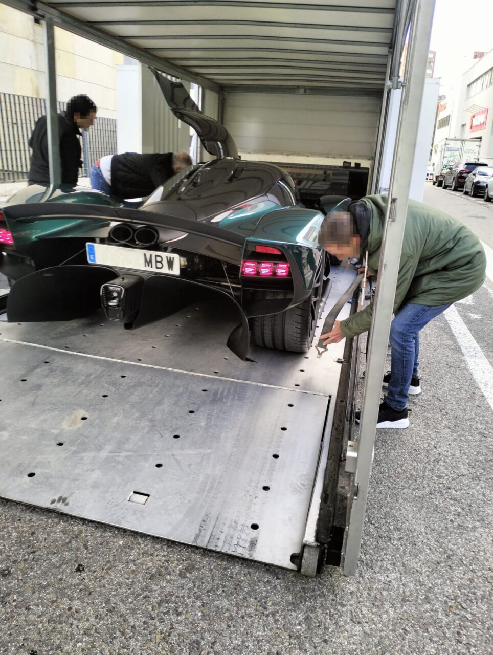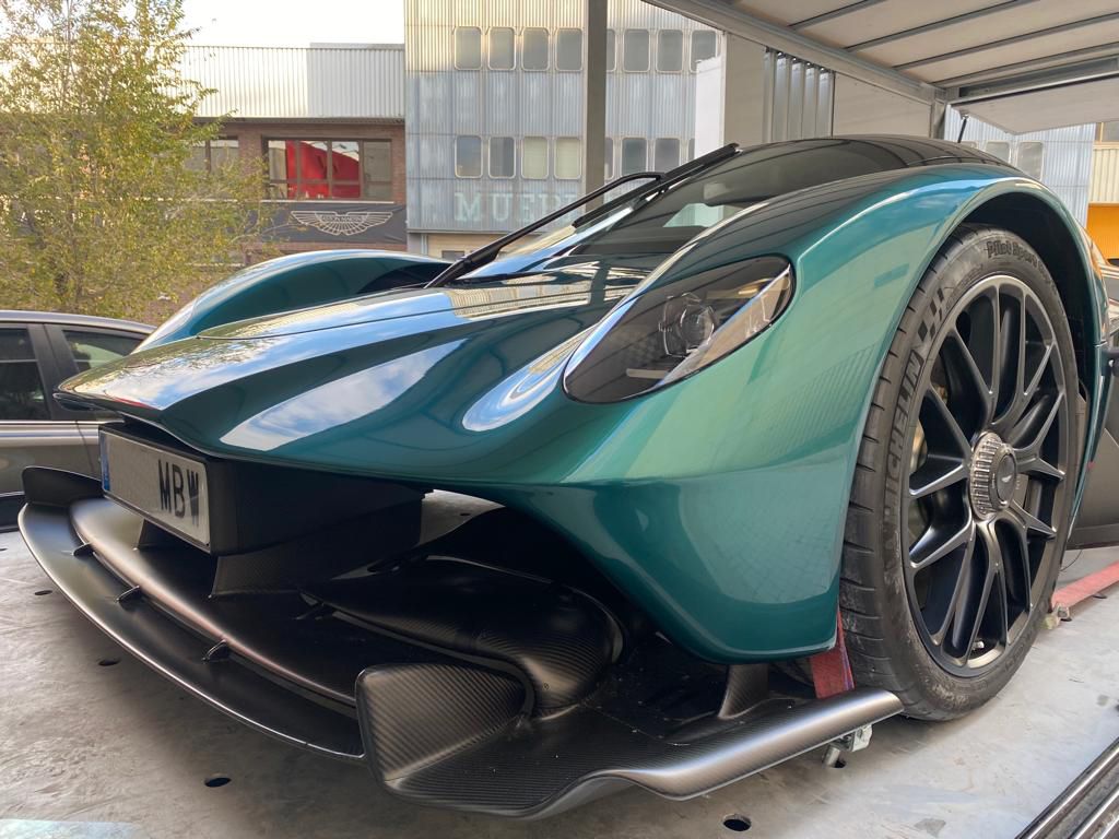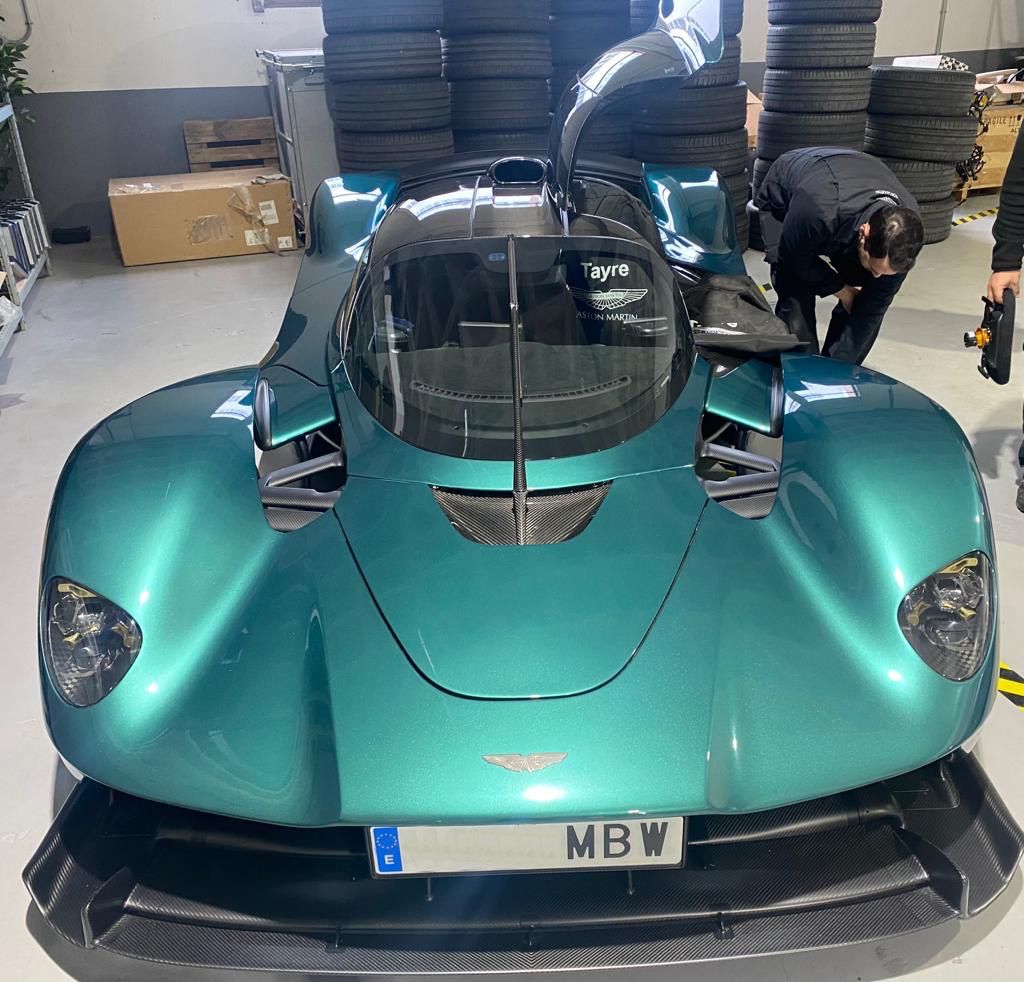 Esta imagen muestra un Aston Martin en un taller mecánico. Se puede ver a un mecánico trabajando en el vehículo, que destaca por su color verde brillante y diseño aerodinámico. El entorno del taller incluye neumáticos apilados y herramientas visibles.