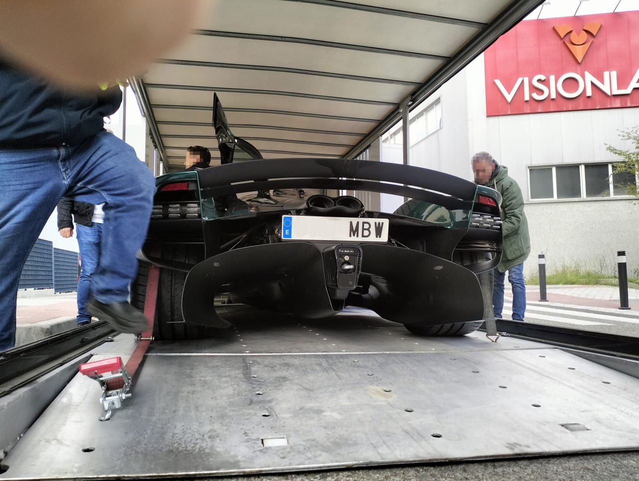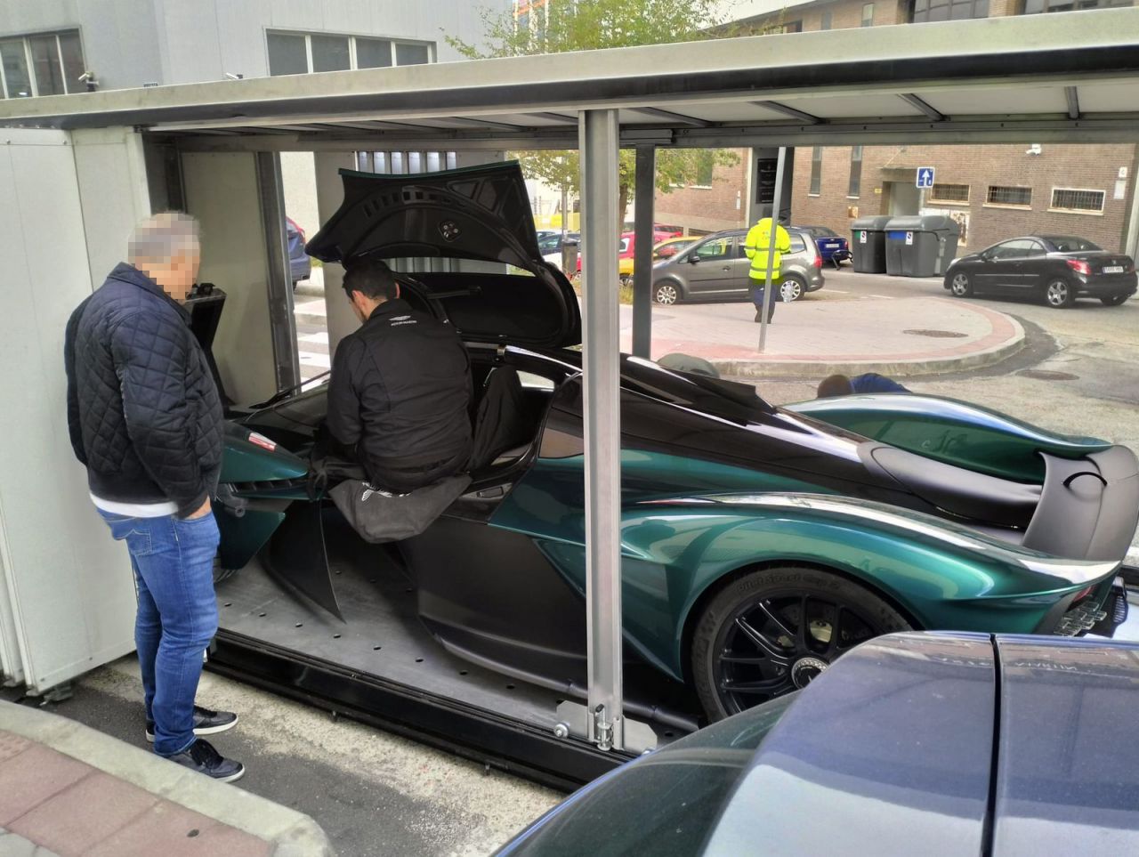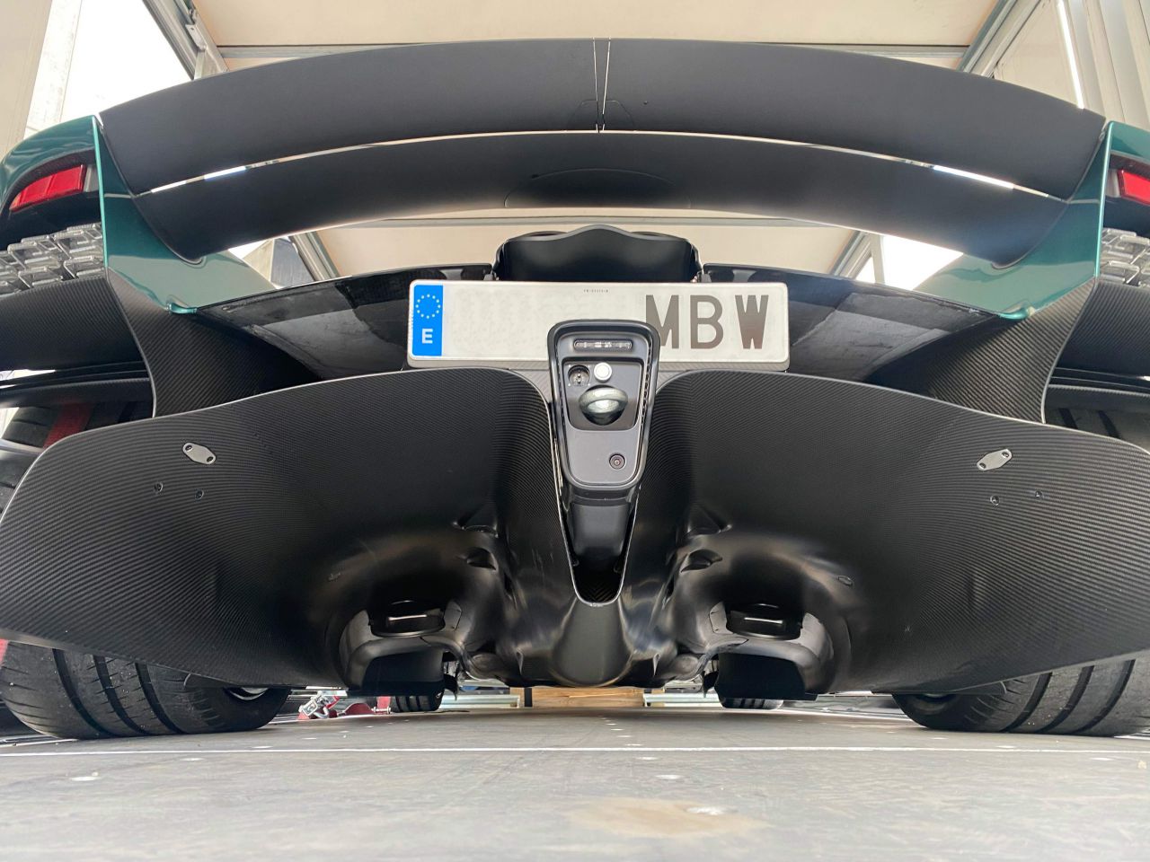 Esta imagen muestra un Aston Martin en un taller mecánico. Se puede ver a un mecánico trabajando en el vehículo, que destaca por su color verde brillante y diseño aerodinámico. El entorno del taller incluye neumáticos apilados y herramientas visibles.
