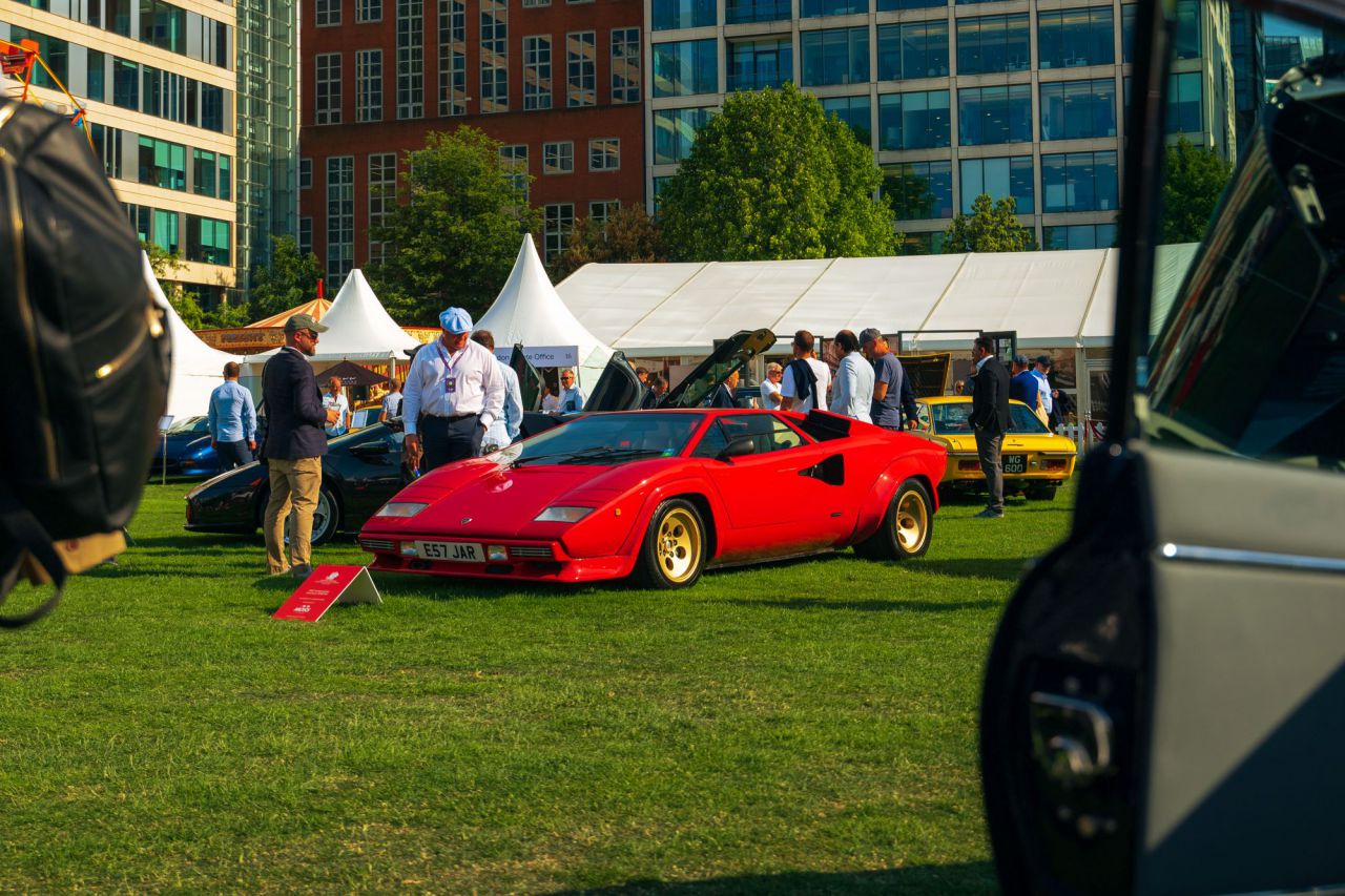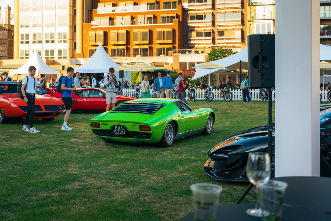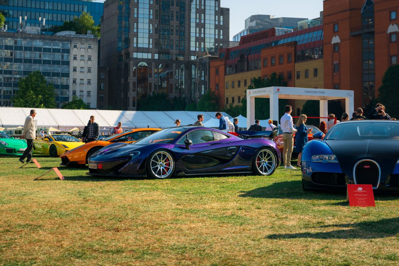 El McLaren P1 destaca en un evento de coches clásicos rodeado de otros vehículos icónicos.