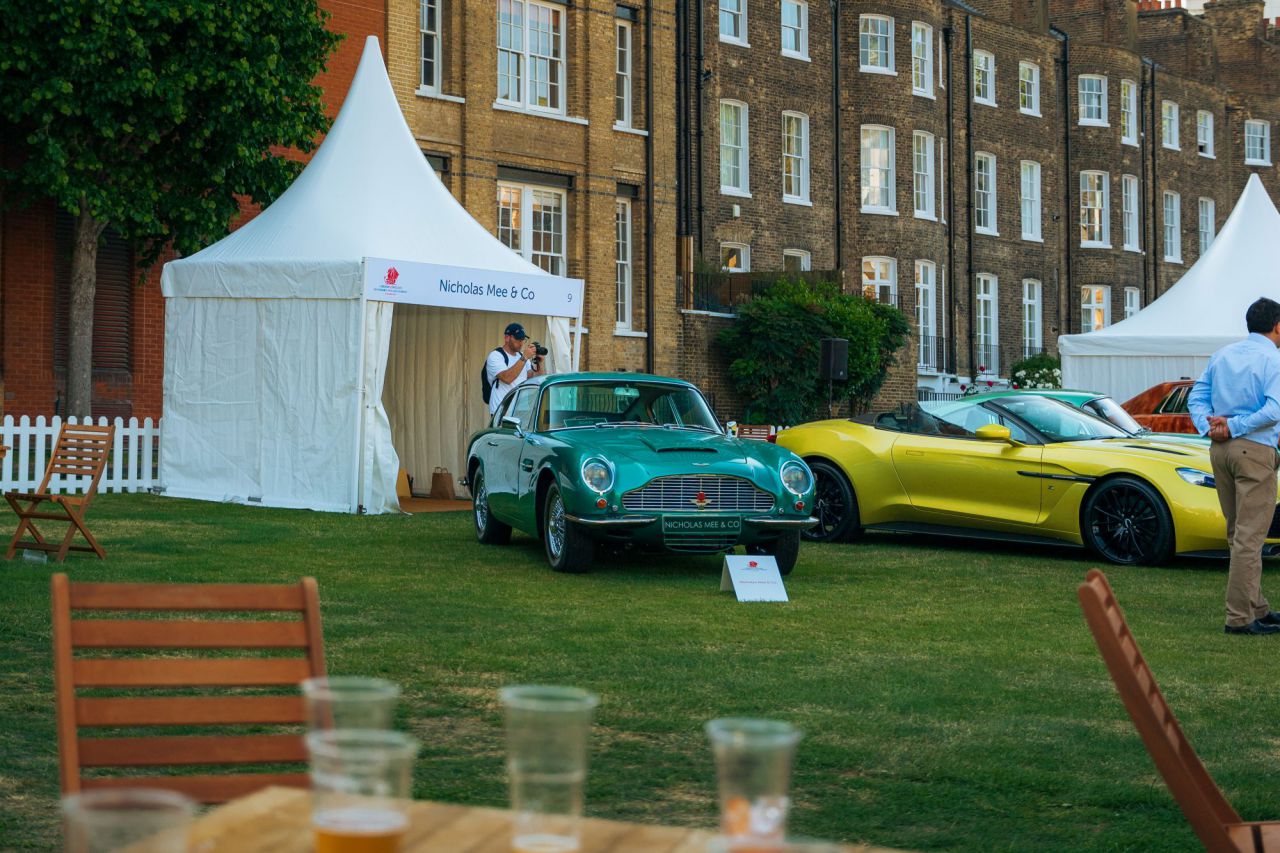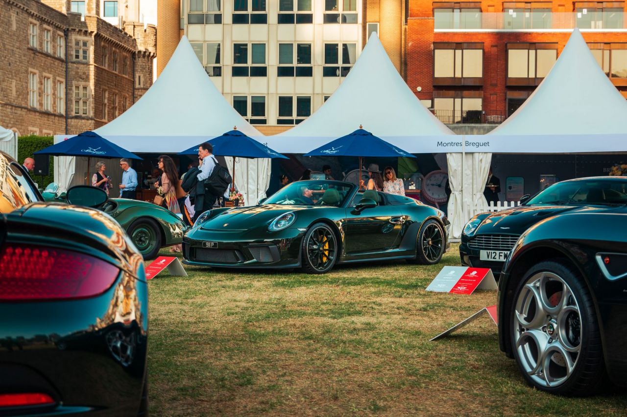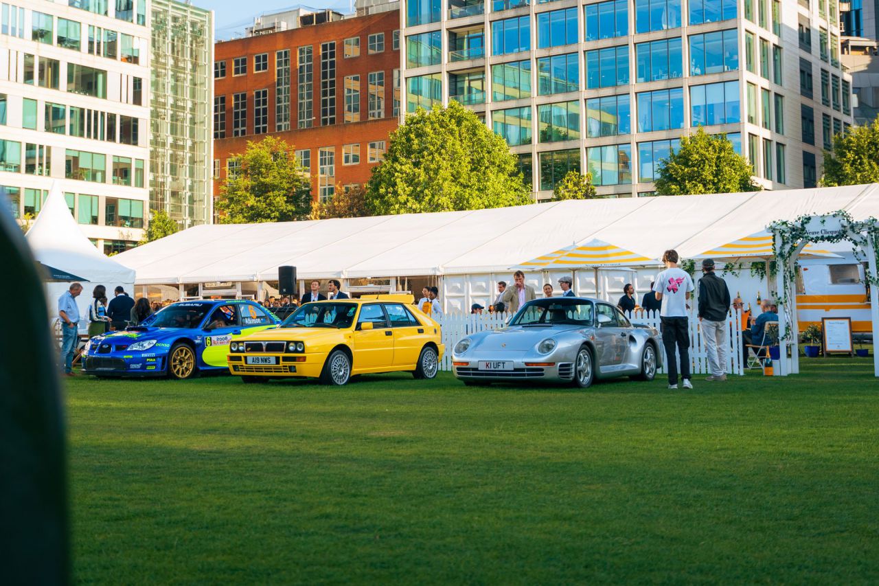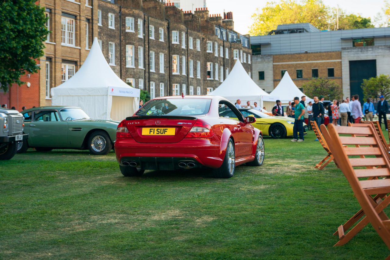 El McLaren P1 destaca en un evento de coches clásicos rodeado de otros vehículos icónicos.