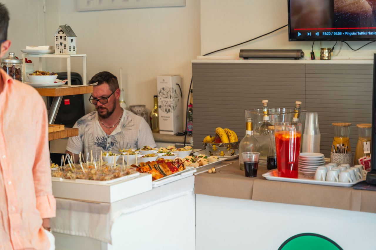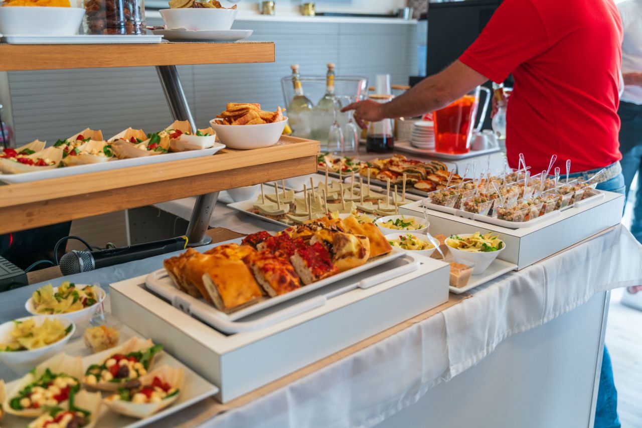 Esta imagen muestra un buffet bien presentado con diferentes platos, ensaladas y bebidas. Perfecto para eventos, fiestas o celebraciones, ofrece una variedad de opciones para los invitados. La disposición atractiva de la comida invita a disfrutar de una experiencia gastronómica única.