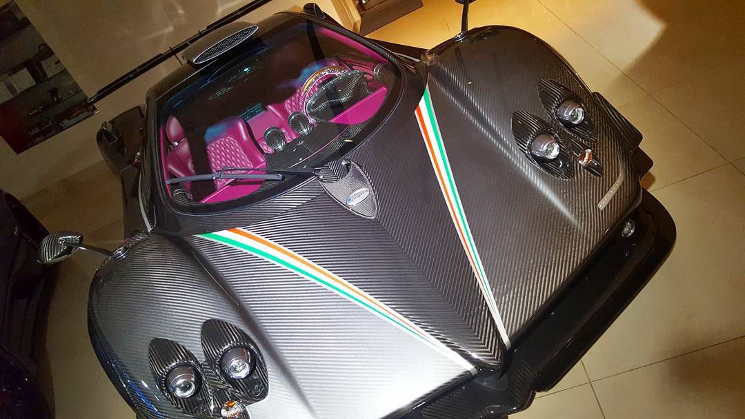 Un impresionante Pagani Zonda estacionado en una calle moderna. Su diseño aerodinámico destaca entre la arquitectura urbana.