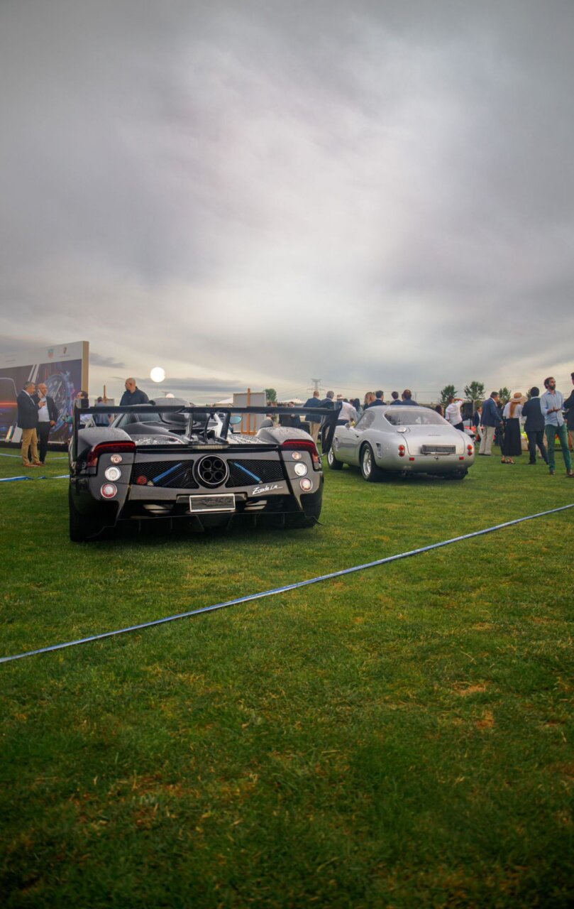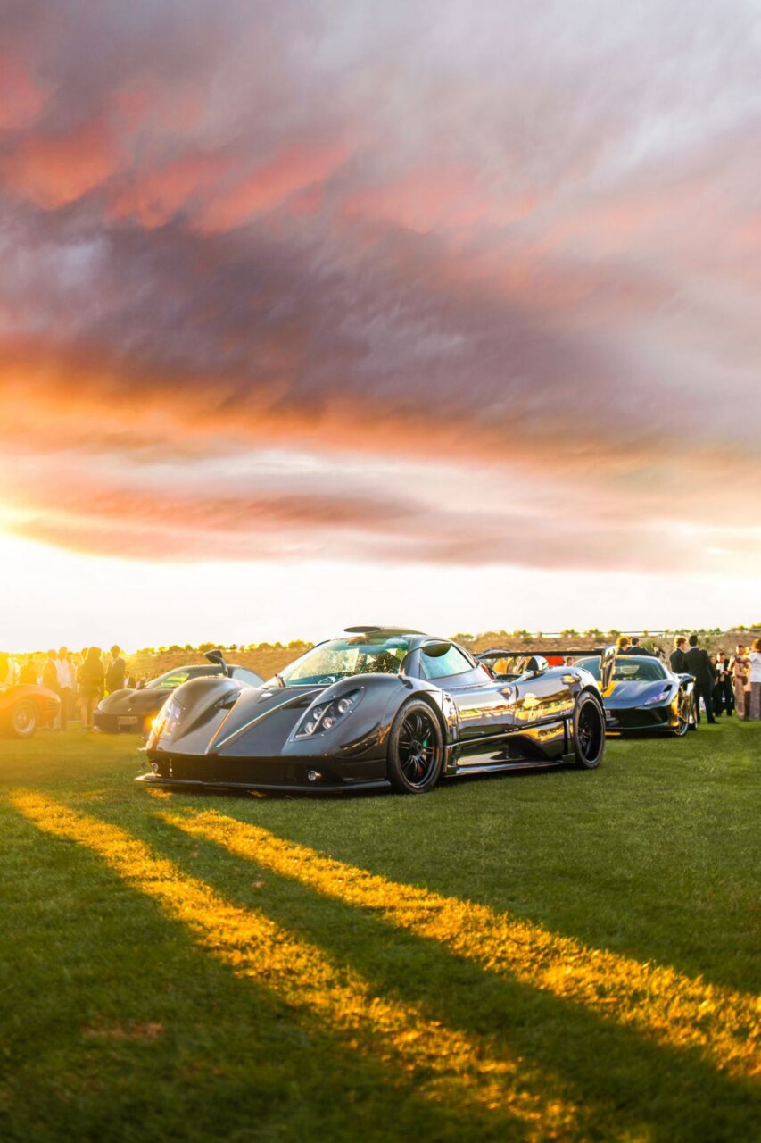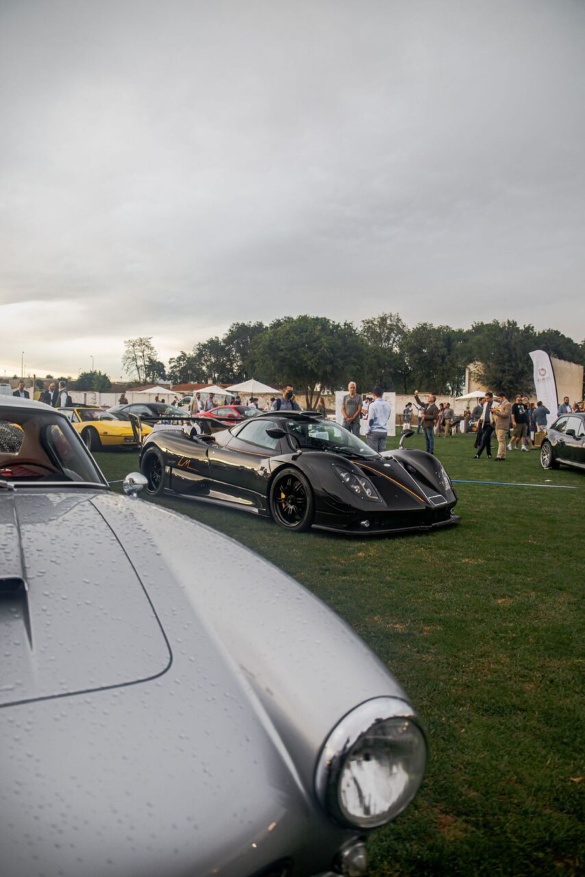 La imagen muestra una exhibición de coches de lujo, donde se pueden ver varios modelos destacados. El evento se lleva a cabo al aire libre, con un ambiente animado y una gran cantidad de asistentes. Los coches brillan bajo un cielo nublado, creando un contraste interesante.