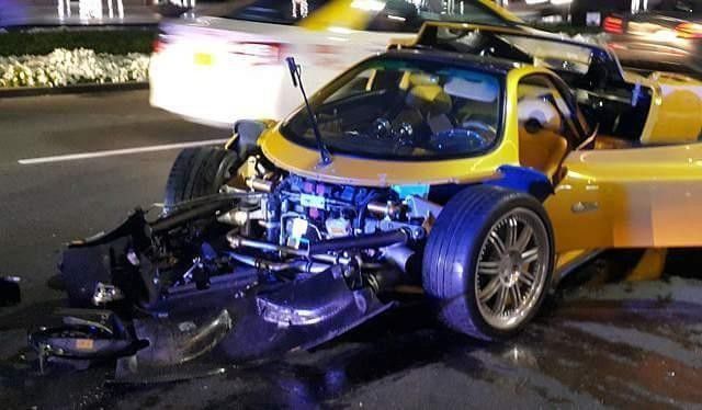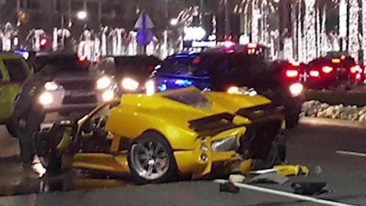Un auto deportivo amarillo volcado en medio de la carretera tras un accidente. Se observan vehículos de emergencia en el fondo.