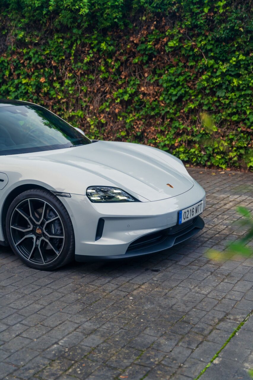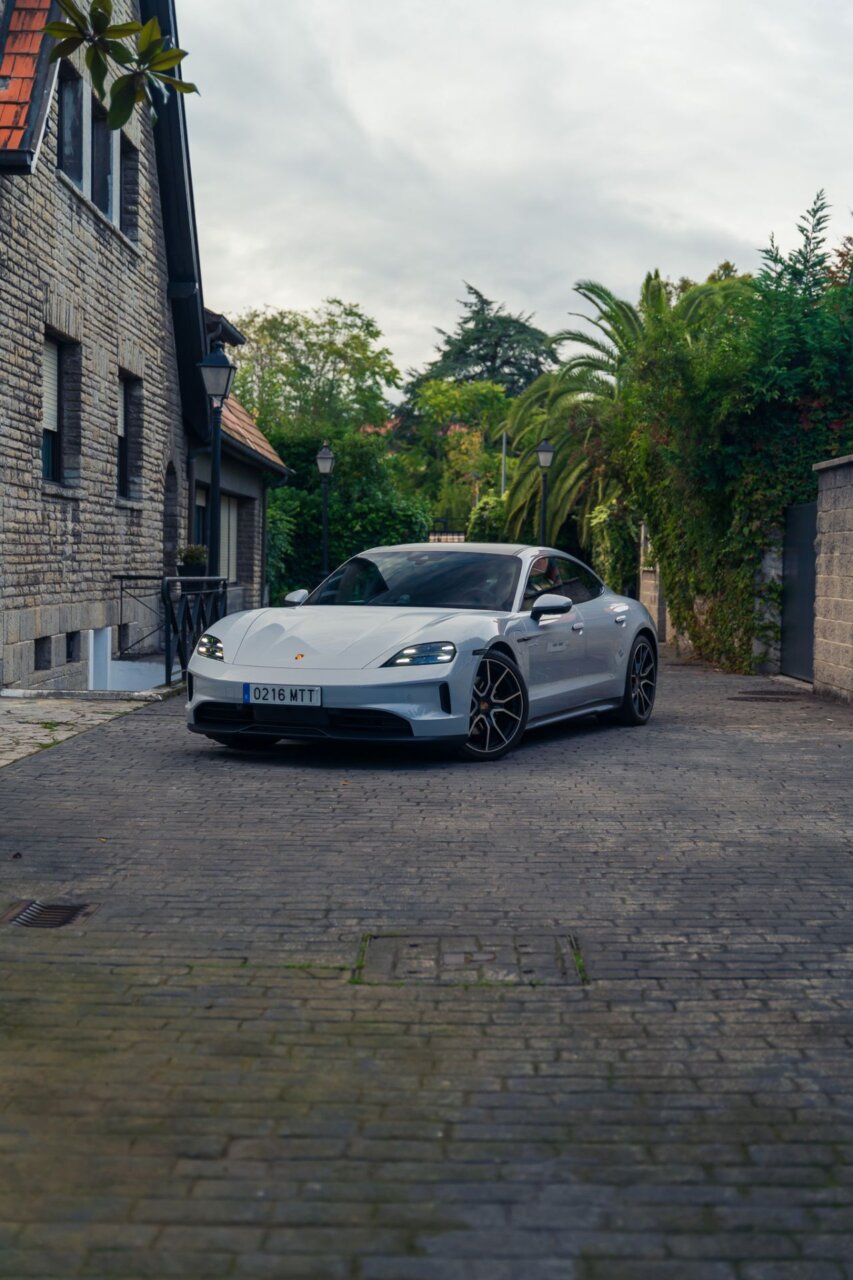 La imagen presenta un Porsche Taycan blanco estacionado en una calle pavimentada, rodeado de un entorno urbano con vegetación. Este vehículo eléctrico combina un diseño moderno con un rendimiento excepcional, destacando en cualquier paisaje. La fotografía captura la esencia de la movilidad sostenible en un ambiente estético.